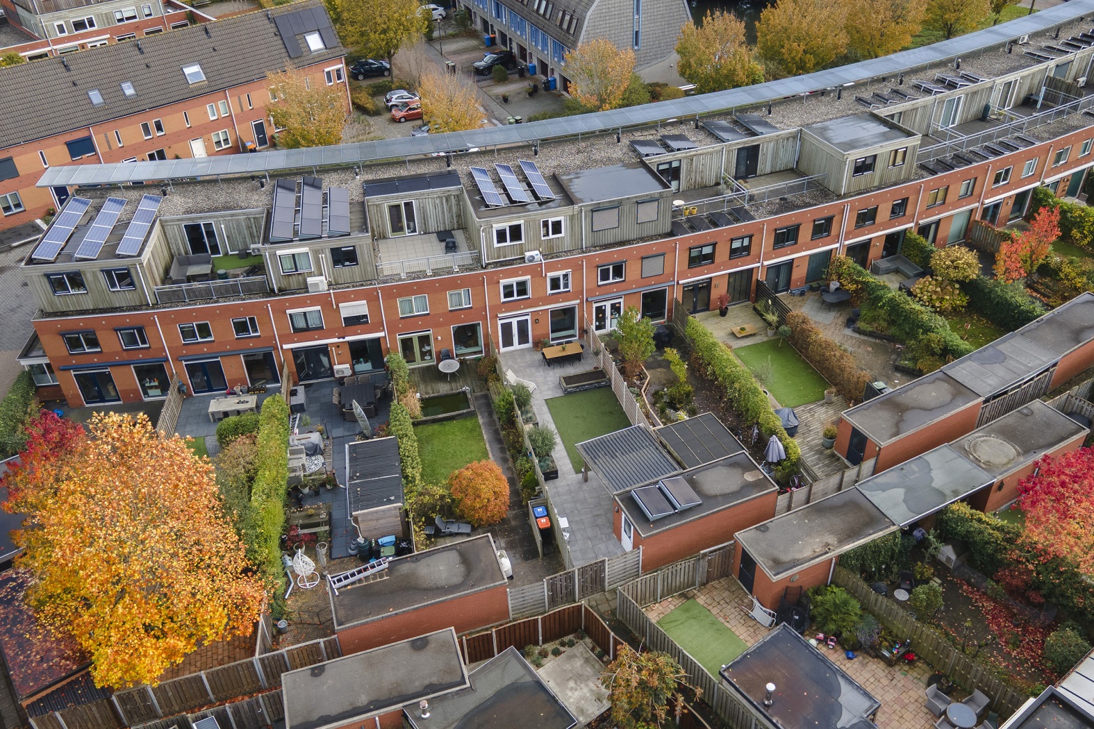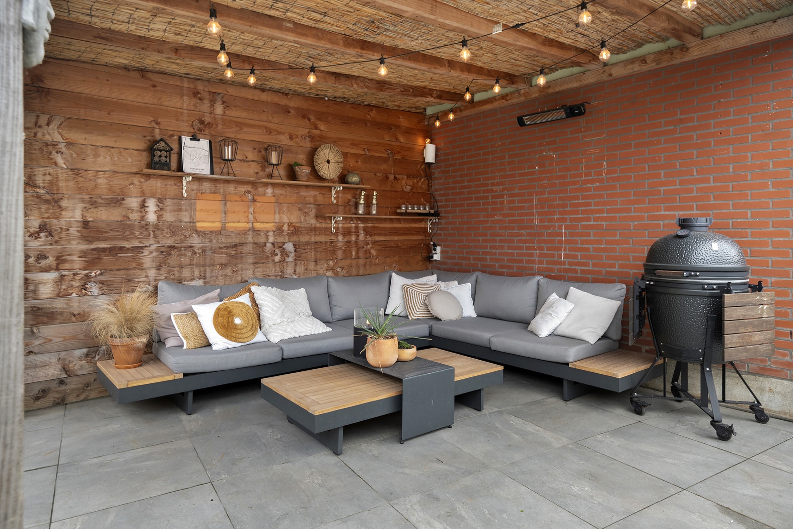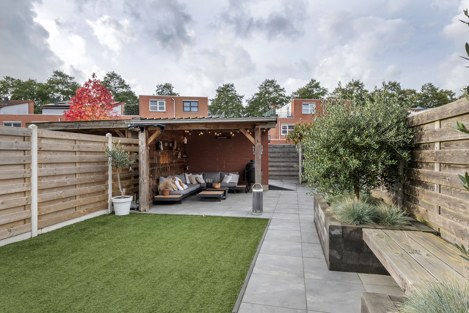 Direct aan de woning vind je een terras met handbediend zonnescherm, vervolgens een onderhoudsvriendelijk gazon van kunstgras en verhoogde plantenborders die de tuin een groene en sfeervolle uitstraling geven. Achterin bevindt zich een tweede terras met een royale loungeoverkapping – dé plek voor lange zomeravonden. Dankzij de achterom is de tuin praktisch bereikbaar en de schuttingen bieden volop privacy. De stenen berging (ca. 8 m²) is ideaal voor fietsen en tuingereedschap.