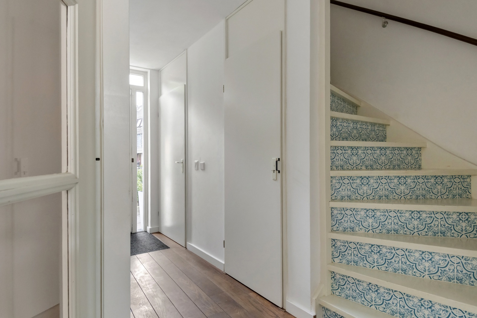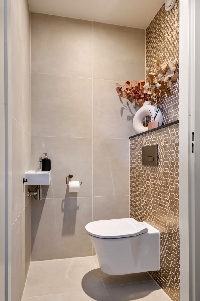 Je komt binnen in de hal met meterkast, trapkast en toegang tot het woongedeelte. Het toilet is in 2024 vernieuwd en afgewerkt met stijlvolle tegels, voorzien van een zwevend toilet en fontein. Vanuit de hal leidt de trap naar de eerste verdieping.