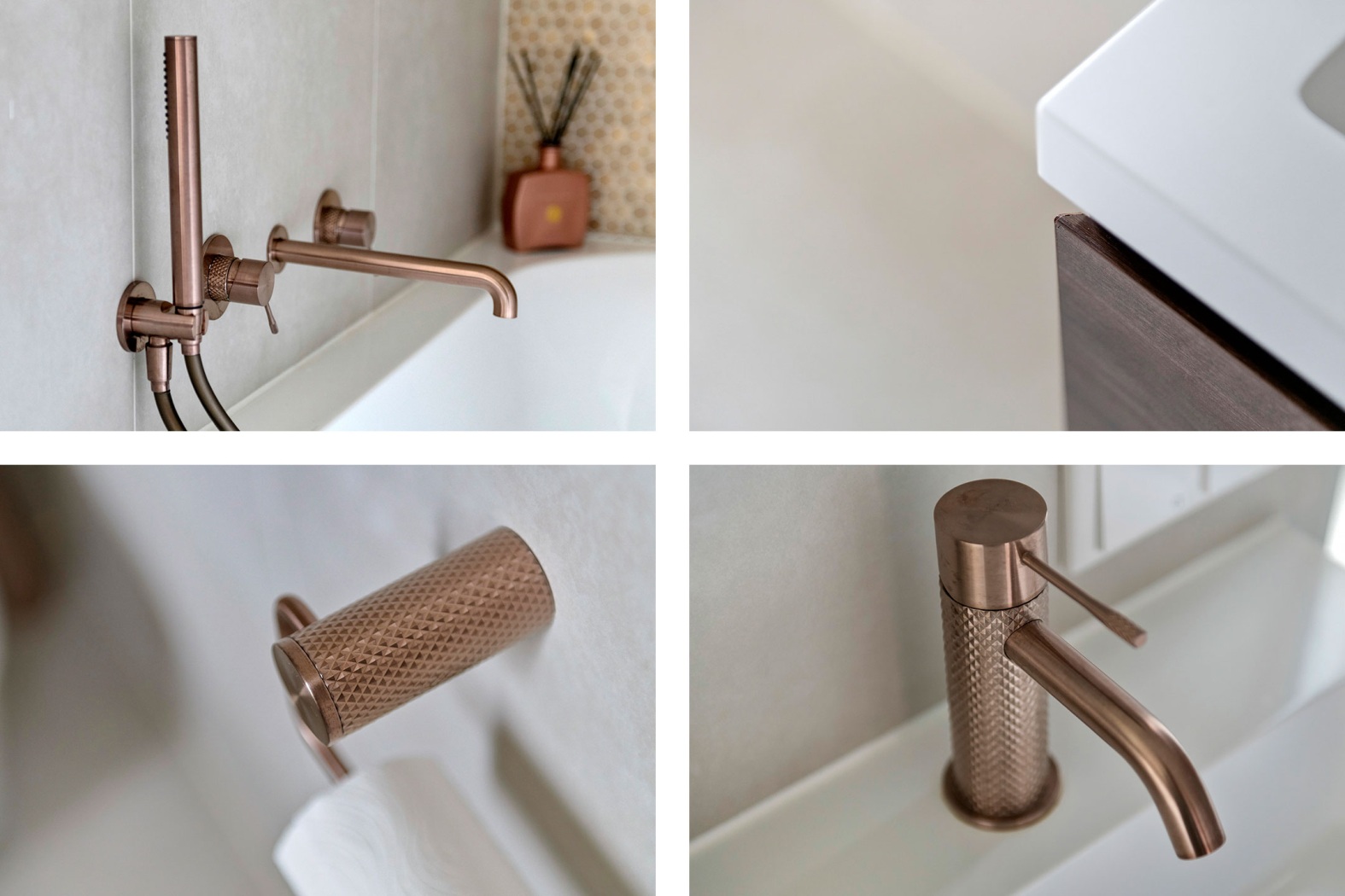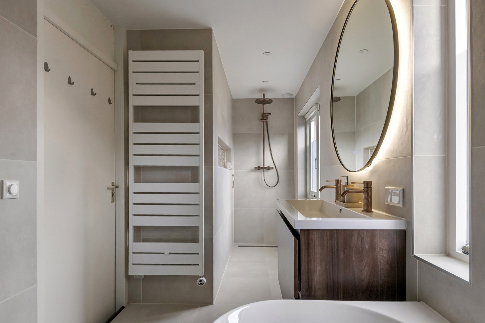 De inloopdouche is voorzien van zowel een regendouche als handdouche, uitgevoerd in een stijlvolle koperkleur — perfect passend bij de zorgvuldig gekozen wand- en vloertegels. De designradiator zorgt voor een warme handdoek én een stijlvolle finishing touch.