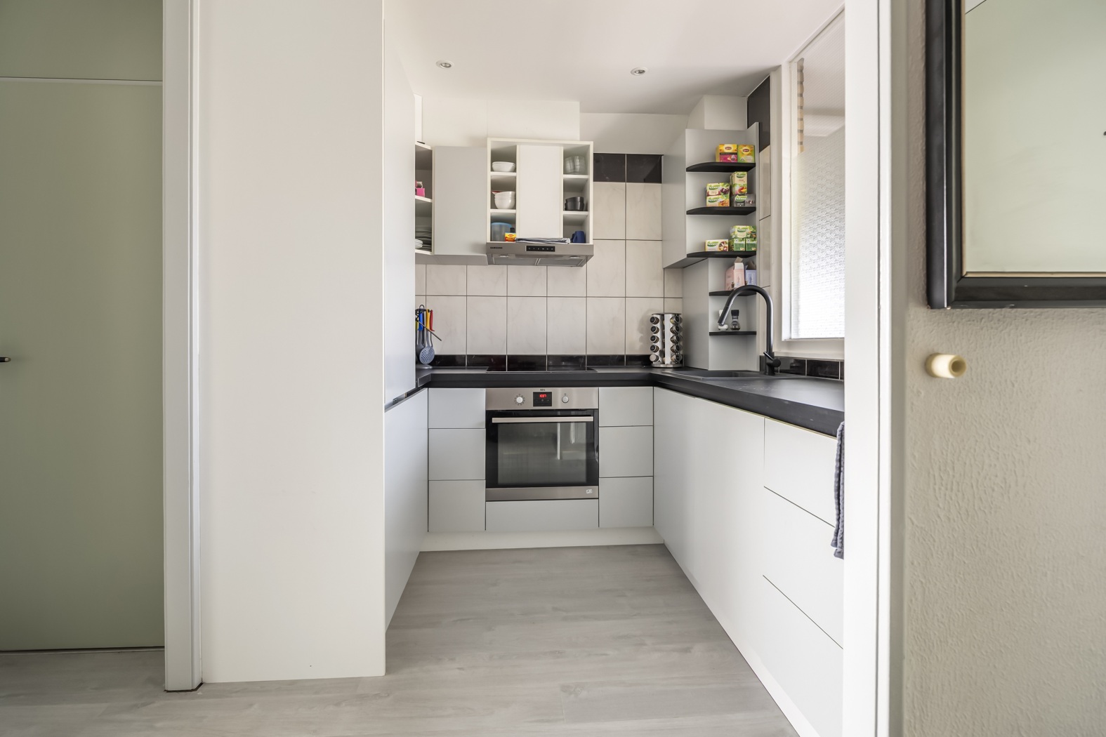 De eerste woonlaag voelt direct ruim en licht. De open entree zorgt voor een prettige verbinding met de keuken, die is uitgevoerd in een praktische U-opstelling met volop werk- en kastruimte en diverse inbouwapparatuur. Door het openmaken van de keuken (2 (gips)muren uit de keuken verwijderd) valt bij binnenkomst direct het daglicht mooi naar binnen en kijk je als het ware het zonnetje in. Bovendien zorgt de open indeling ervoor dat je tijdens het koken gemakkelijk in contact blijft met anderen in de ruimte.