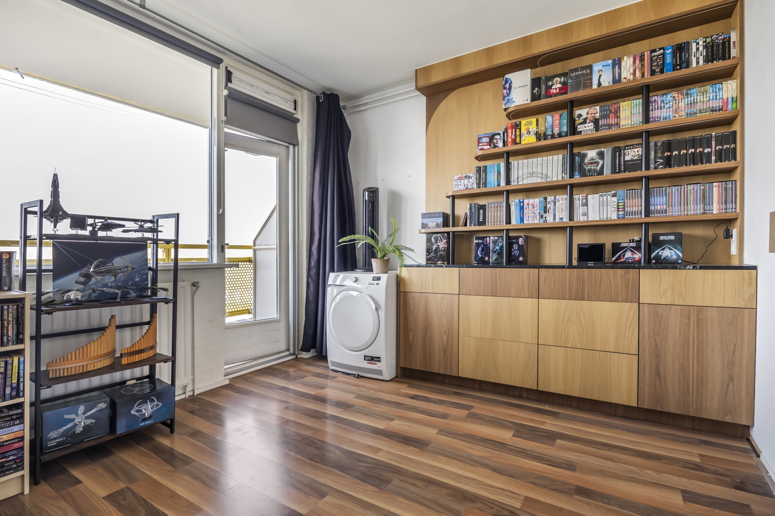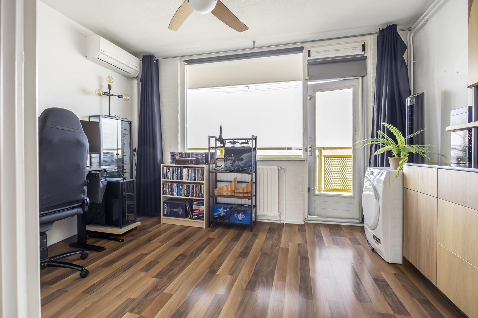 De lichte woonkamer biedt alle ruimte voor een comfortabele zithoek én een grote eettafel, ideaal om te ontspannen of gezellig te tafelen met familie en vrienden. Vanuit hier stap je zo het balkon op. Hier zit je heerlijk beschut en kijk je uit over het groen: een fijne plek om op zonnige dagen rustig te genieten. De woonkamer is bovendien voorzien van een fraaie laminaatvloer, airconditioning en een praktische trapkast.