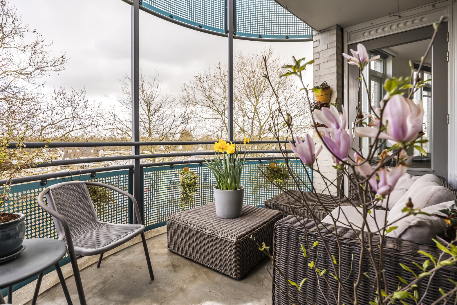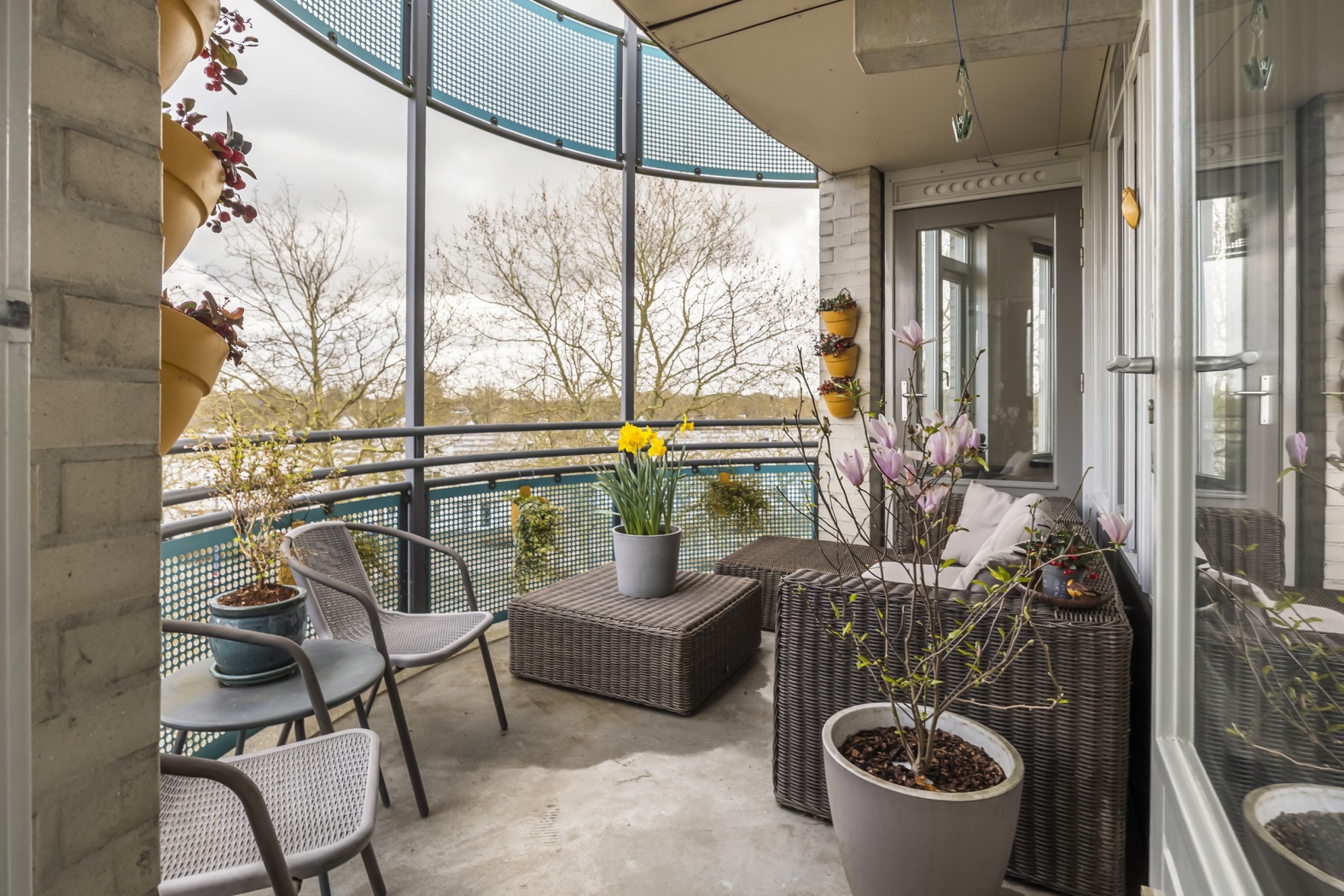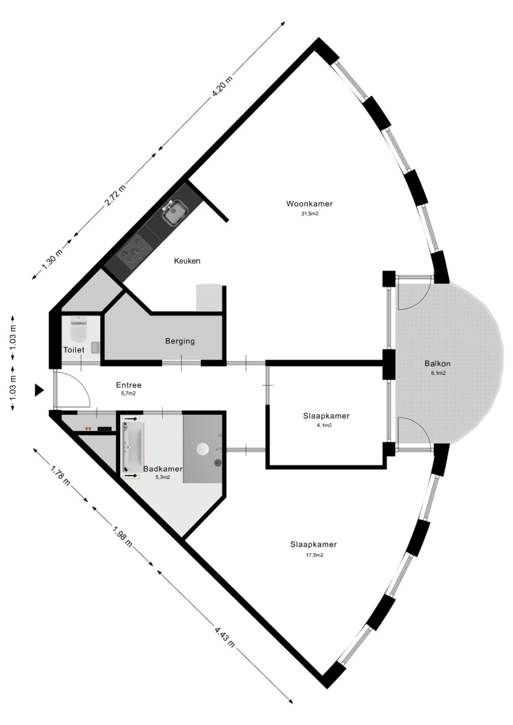 •Zonnig, halfrond balkon (ca. 8 m²) op het zuiden, bereikbaar vanuit de woonkamer en hoofdslaapkamer