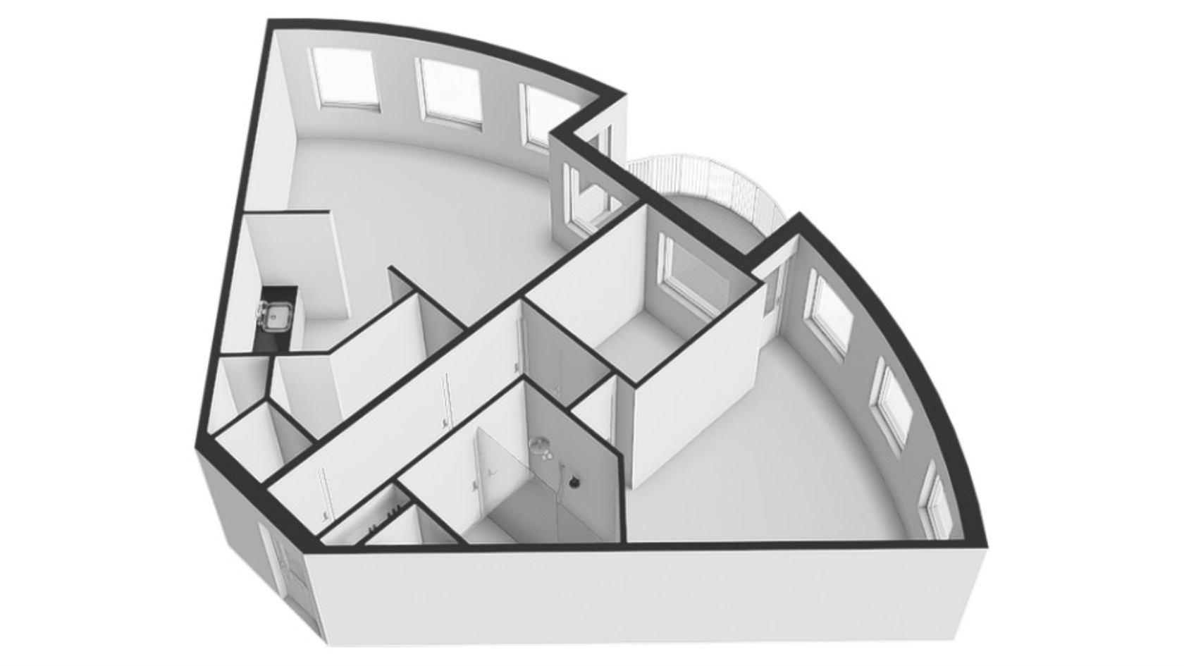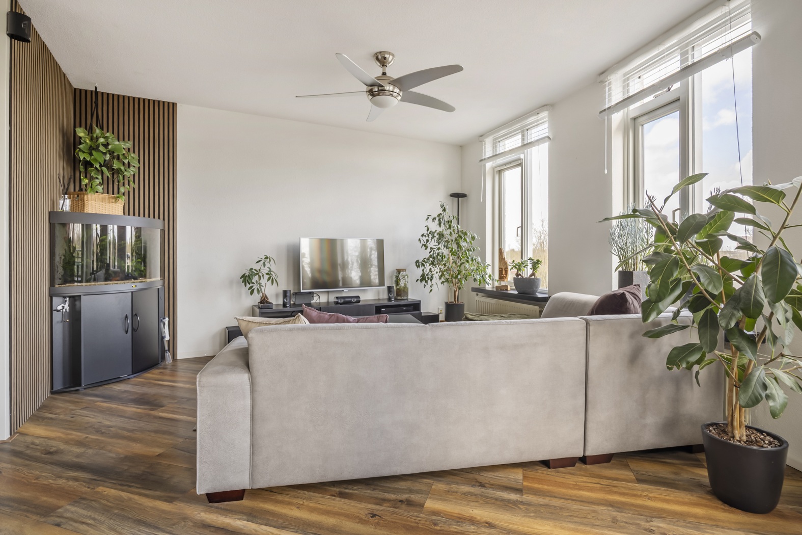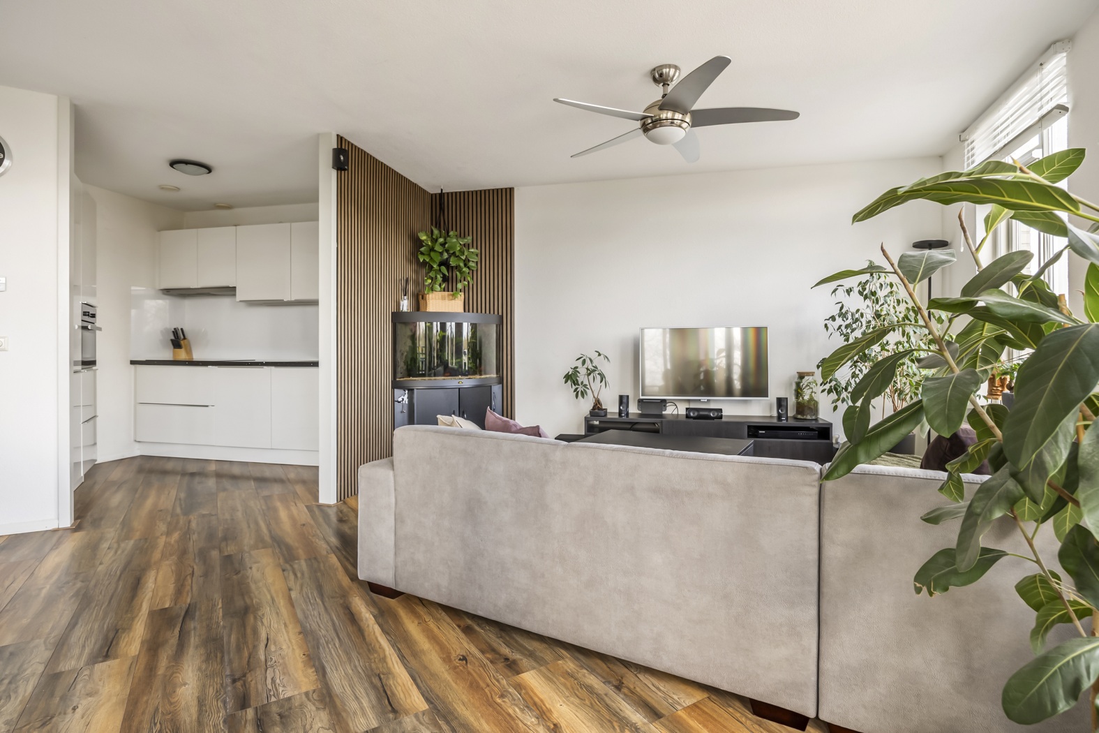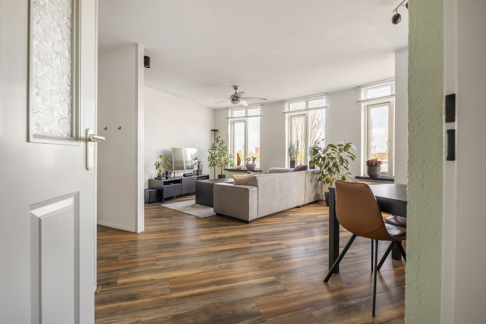 De woonkamer (ca. 32 m²) is heerlijk licht en ruim, met een speelse waaiervormige indeling en grote raampartijen die zorgen voor een prachtige lichtinval. Er is volop ruimte voor een gezellige zit- en eethoek. Vanuit de woonkamer stap je zo het zonnige balkon op: een heerlijke plek voor wie graag van het buitenleven geniet.