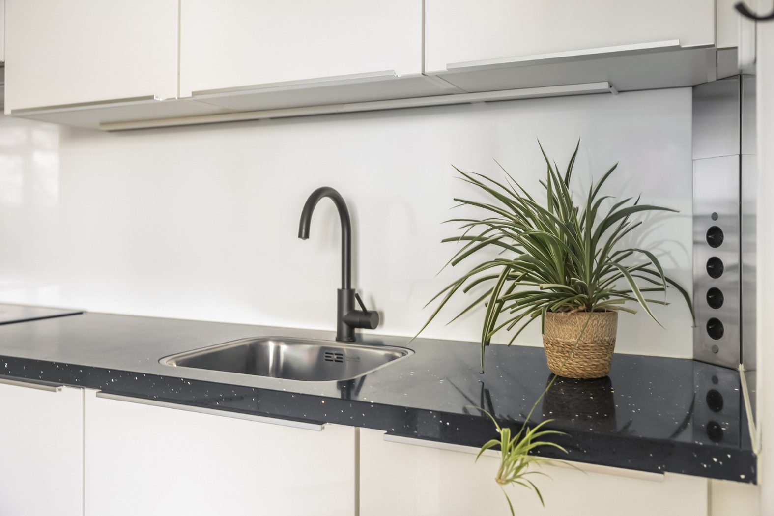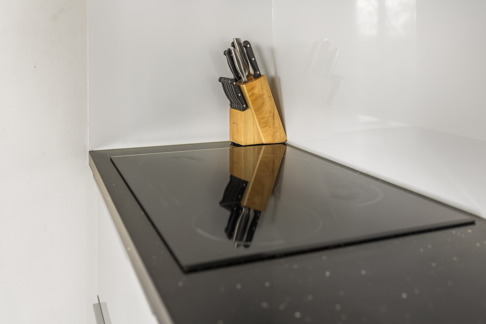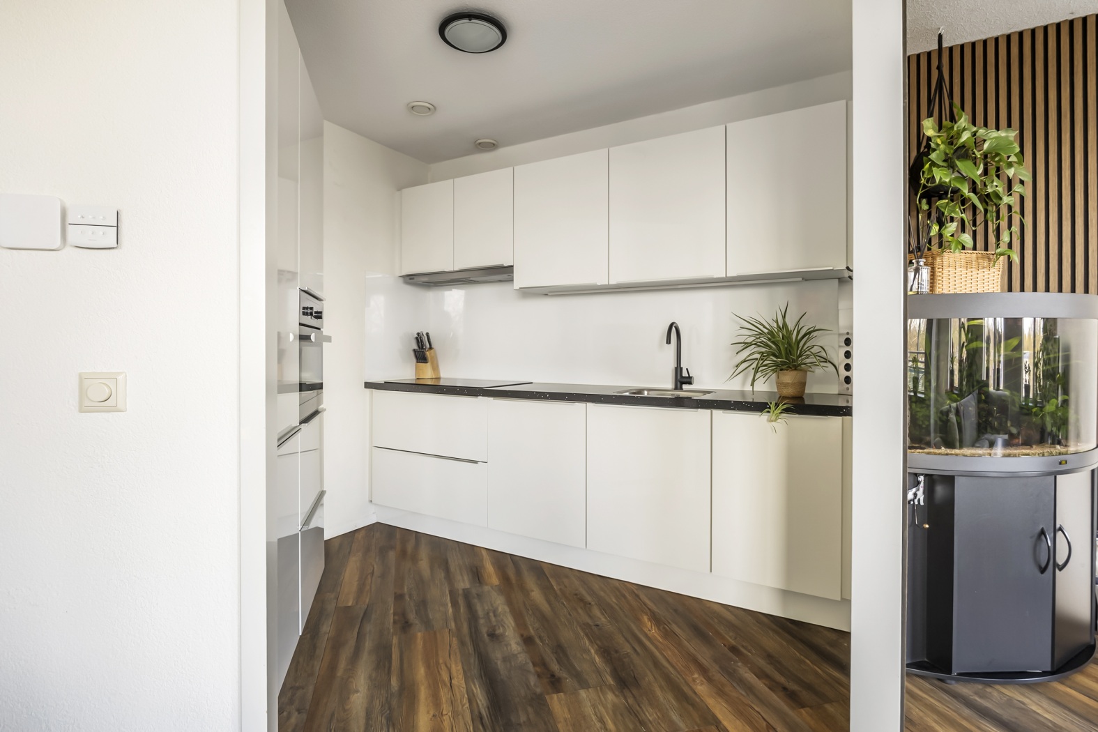 De half open keuken heeft een strakke, moderne uitstraling met een greeploze witte opstelling en veel werk- en kastruimte. Uiteraard voorzien van alle gemakken, zoals een inductie kookplaat, afzuigkap, combimagnetron, koel-/vriescombinatie en een vrijwel nieuwe vaatwasser.