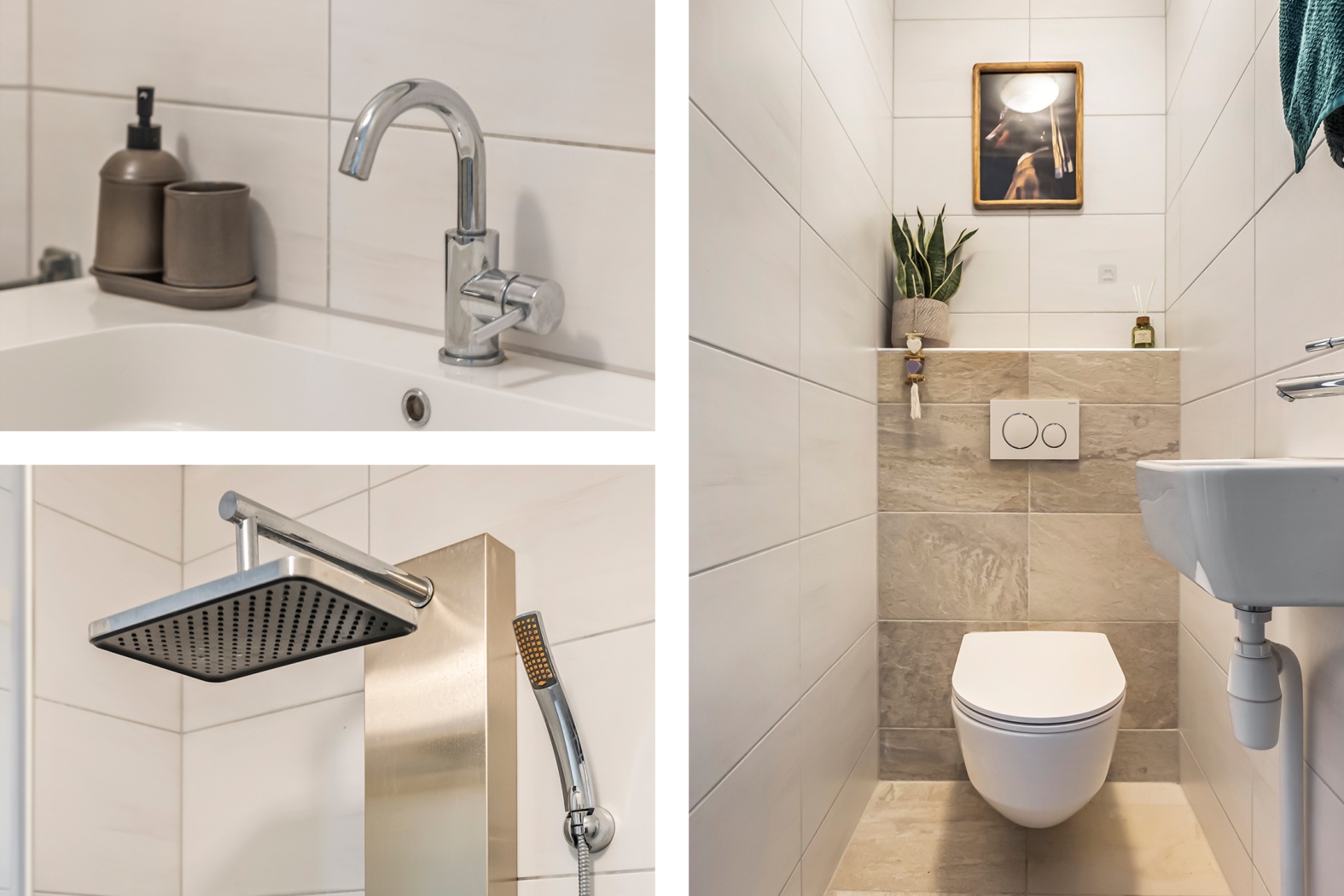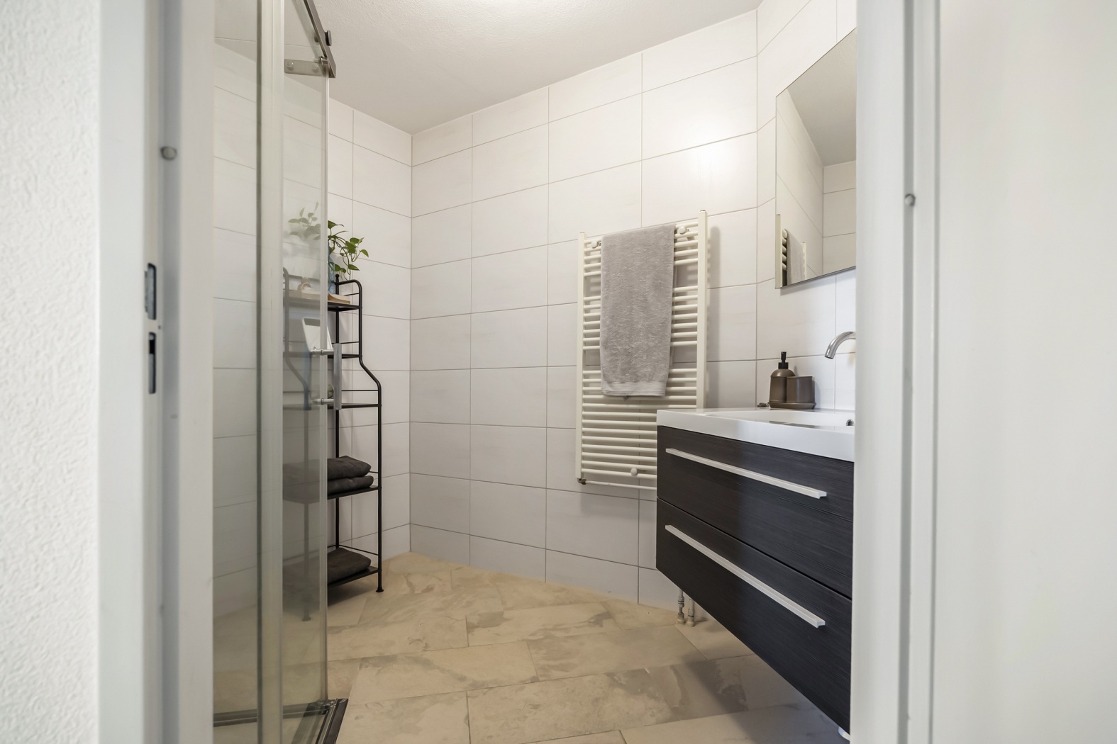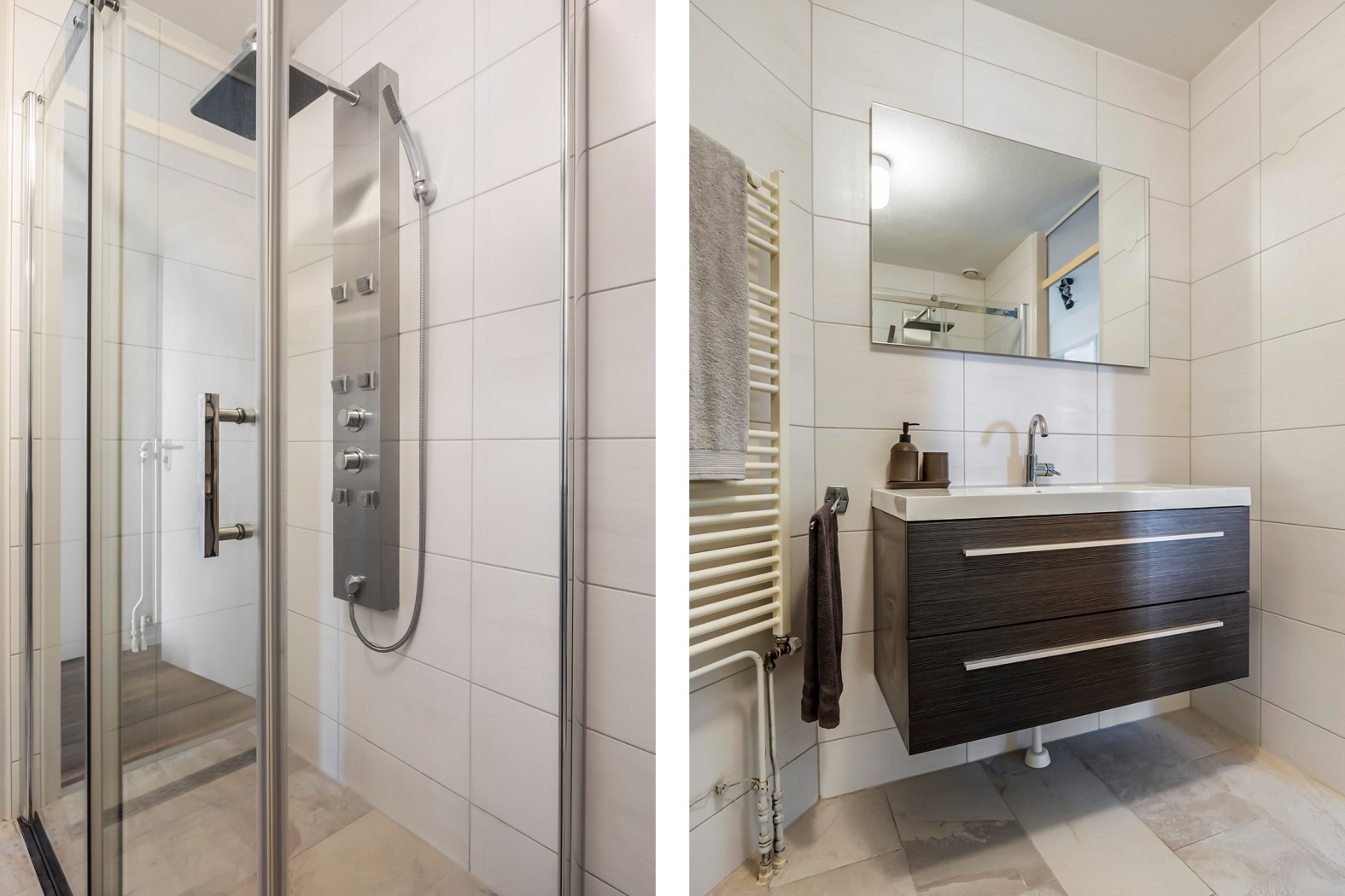 De badkamer is stijlvol en luxe uitgevoerd en beschikt over een ruime douchecabine met een modern douchepaneel, inclusief stortdouche, massagejets en handdouche. Daarnaast vind je er een fraai wastafelmeubel met spiegel en een designradiator, wat zorgt voor extra comfort en een verzorgde uitstraling.