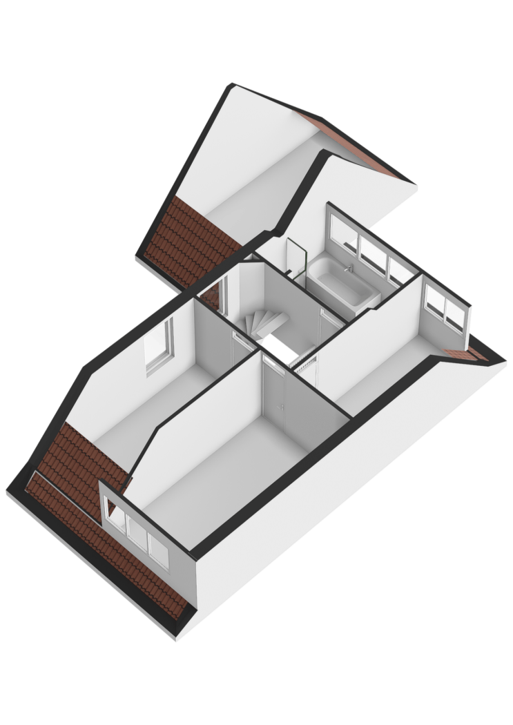 De badkamer aan de achterzijde, eveneens met dakkapel, is uitgevoerd met een ligbad, wastafel met spiegelkast, een zwevend toilet en een aparte kwartronde douchecabine.
