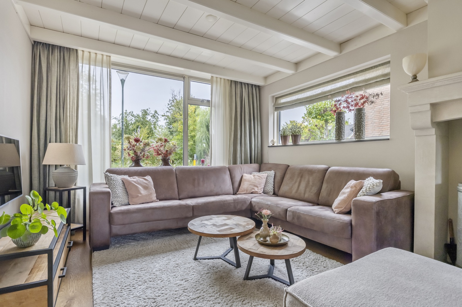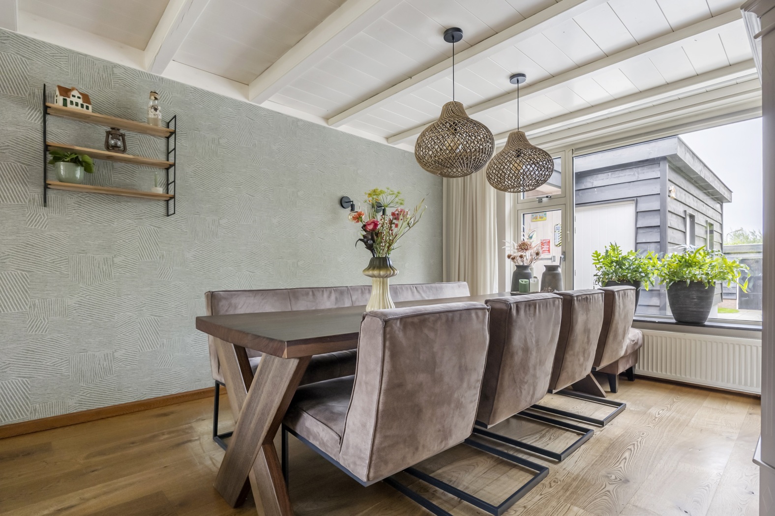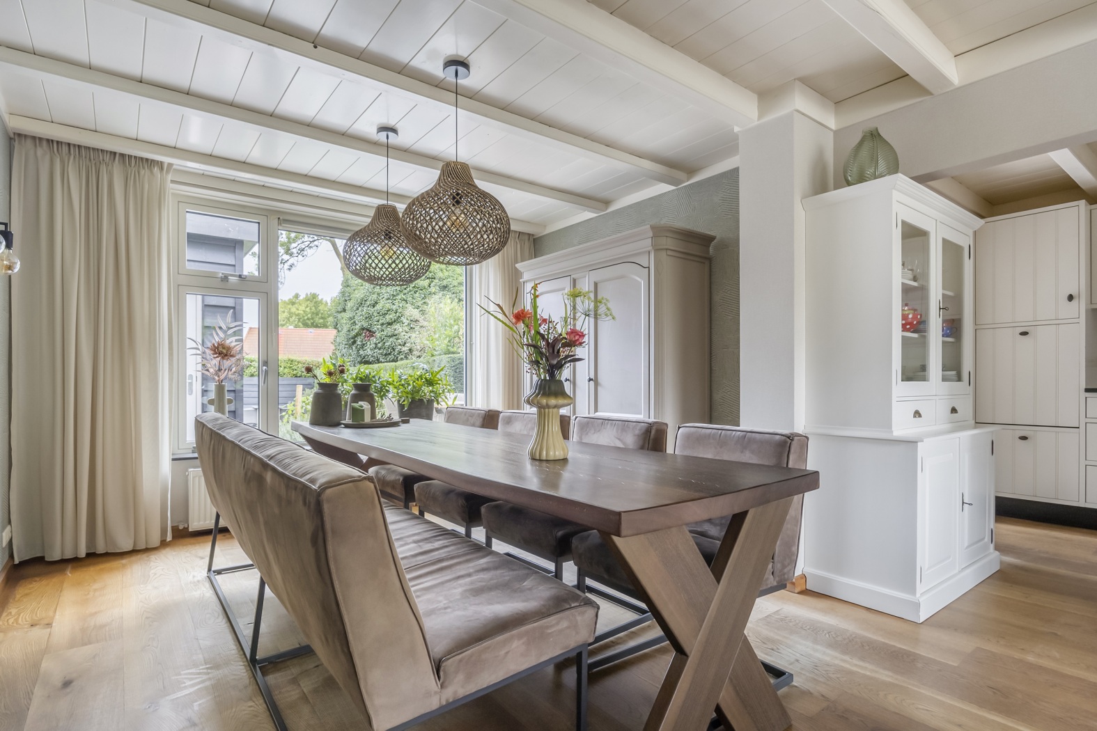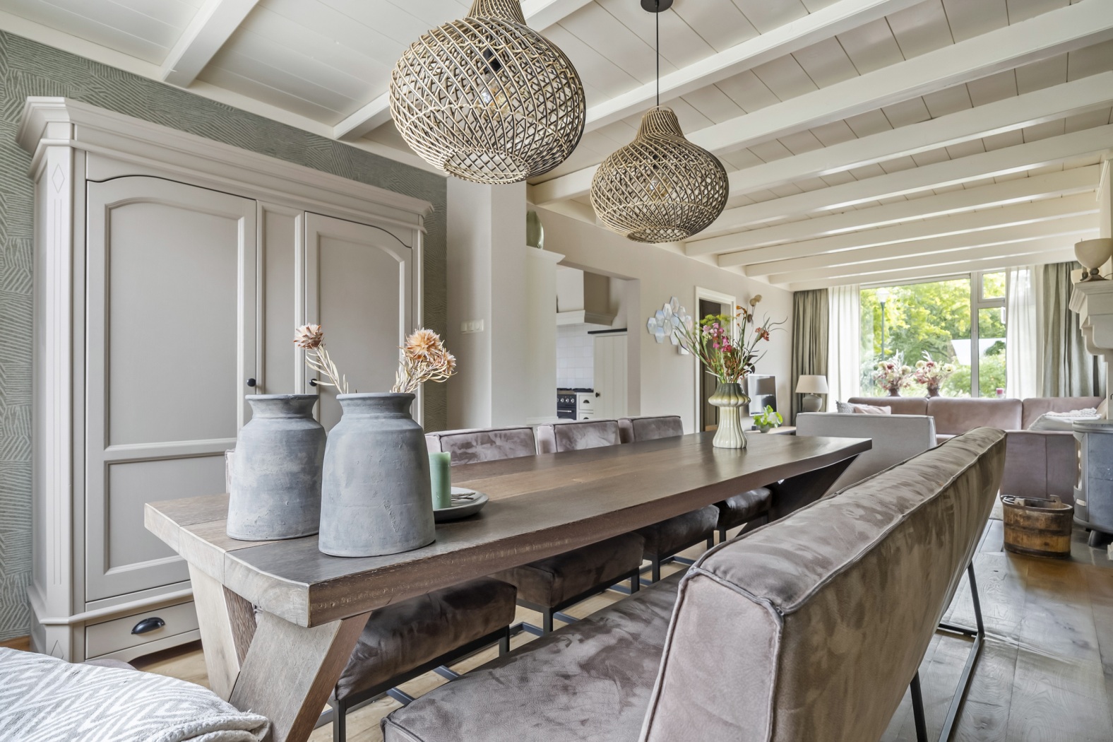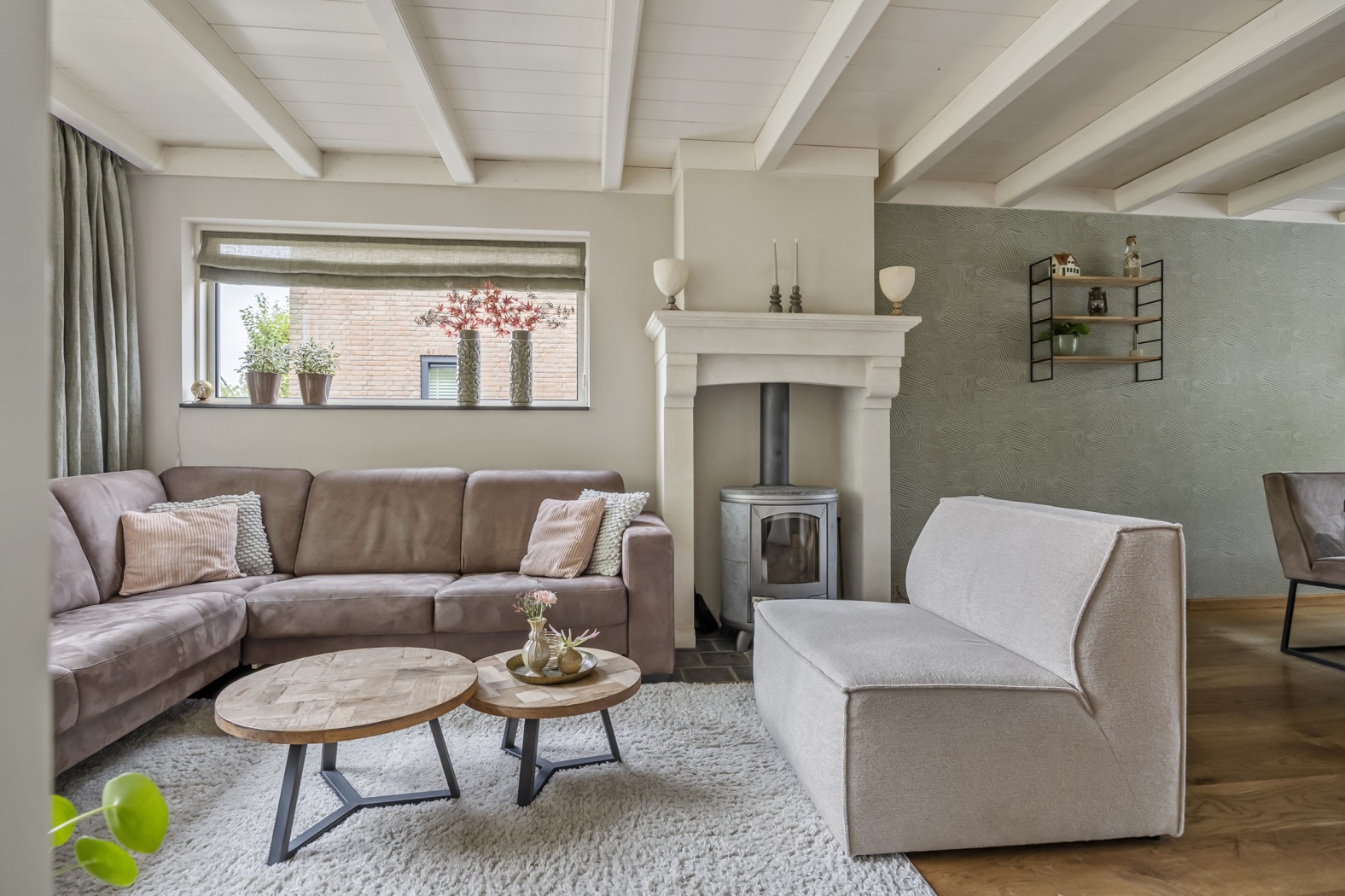 De woonkamer van 31 m² is een fijne plek om tot rust te komen. Brede houten vloerdelen, grote ramen aan de voor- en achterzijde én een extra zijraam zorgen voor volop licht. De haardmantel met houtkachel maakt het extra sfeervol – ideaal voor lange winteravonden. Er is meer dan genoeg ruimte voor een gezellig zitgedeelte én een royale eettafel, met achterin een leuk zicht op de tuin. Het witgeschilderde balkenplafond geeft de ruimte net dat vleugje karakter waardoor je je meteen thuis voelt.