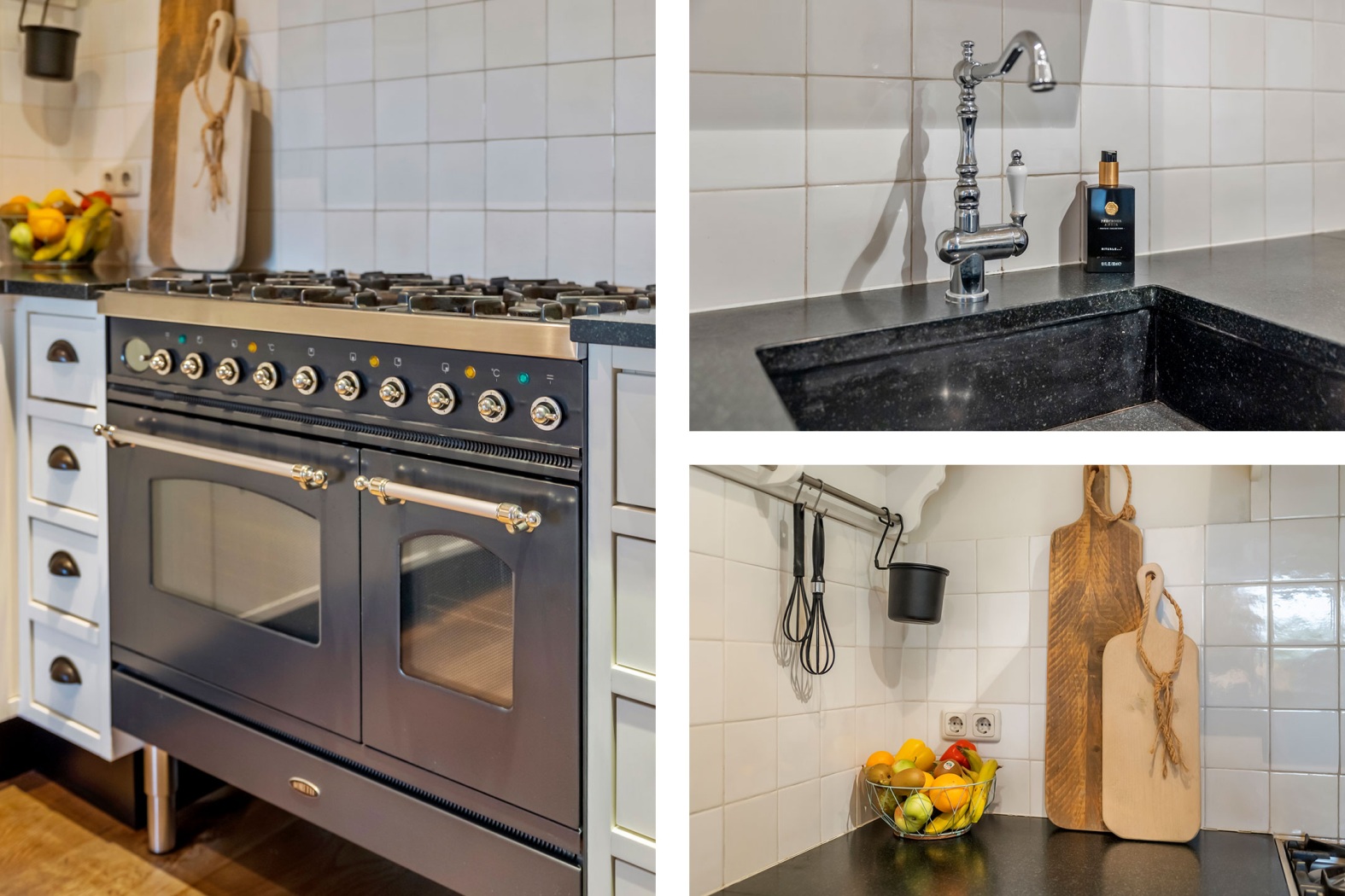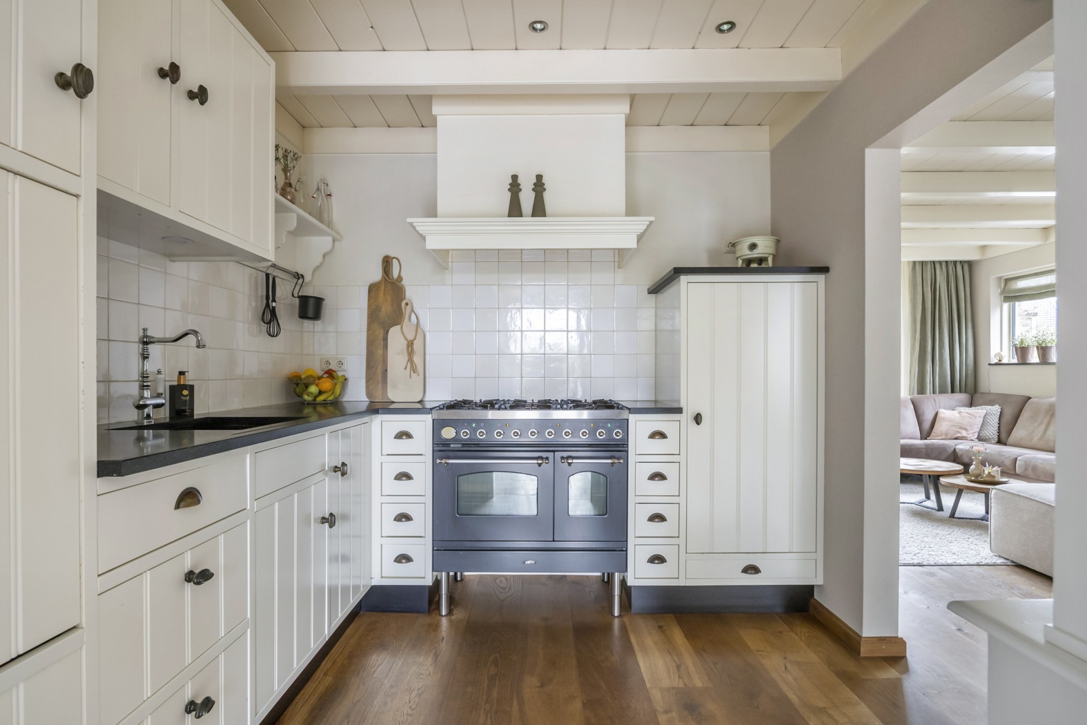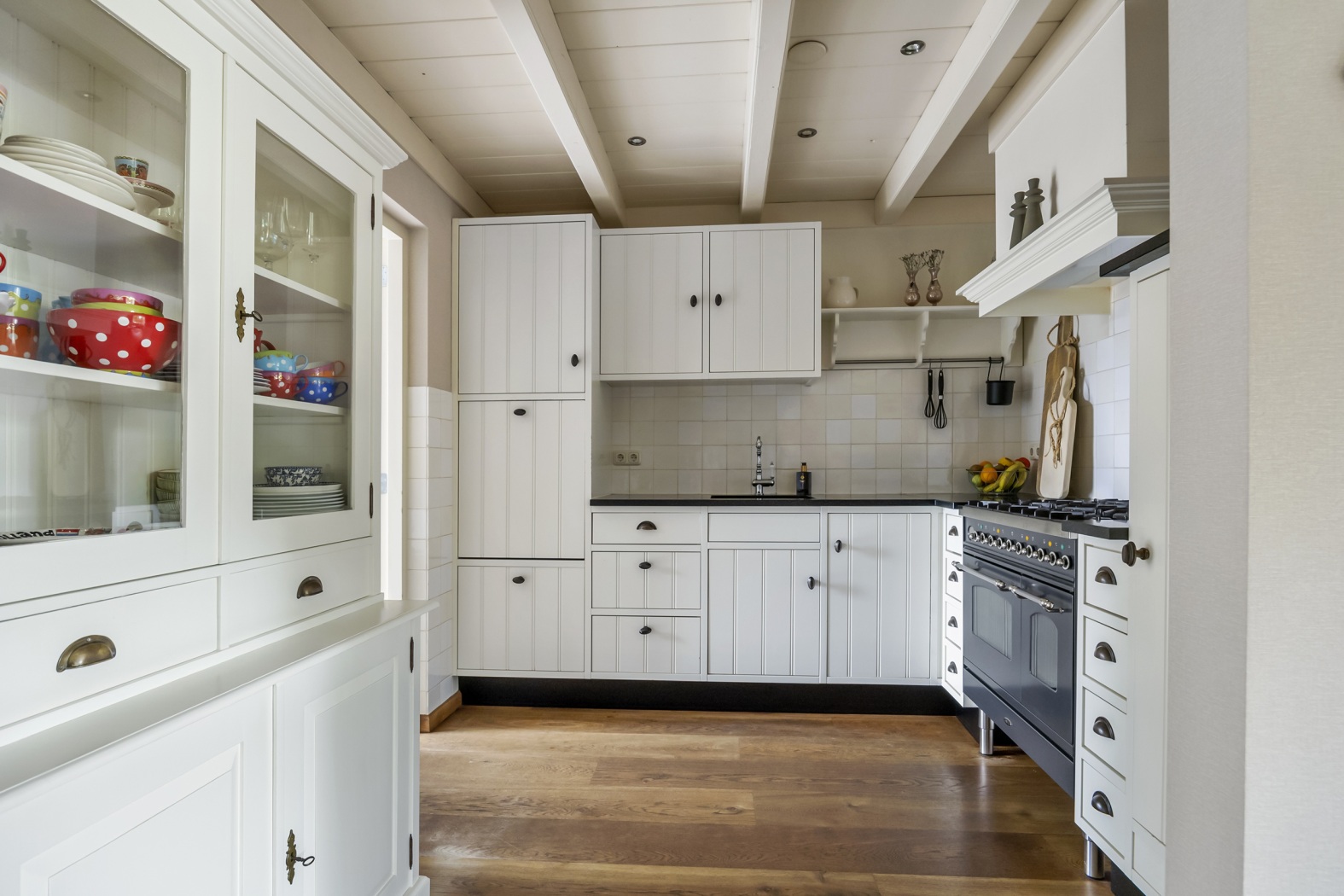 De halfopen keuken (8,4 m²) is uitgevoerd in een landelijke stijl en heeft een handige U-opstelling. Voor de kookliefhebbers: er staat een Boretti gasfornuis met twee ovens klaar, compleet met een schouw en afzuigkap met witjes. Natuurlijk ontbreken een koelkast en vaatwasser niet. Kortom: een keuken waar koken nog gewoon leuk is.