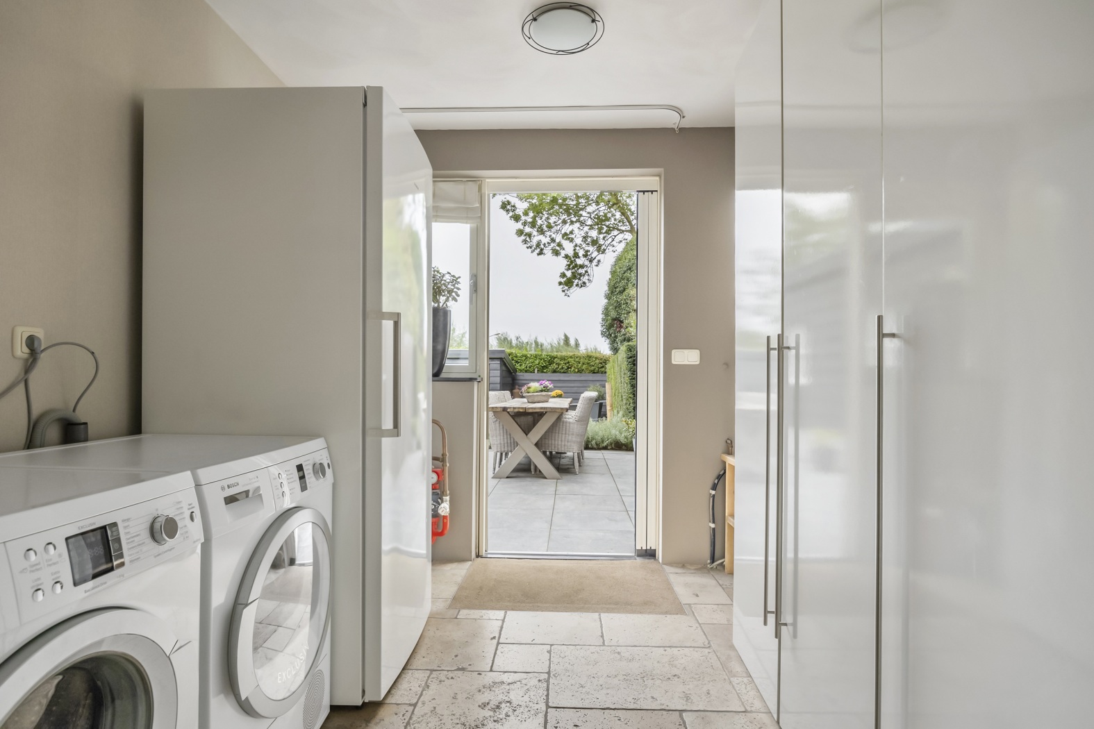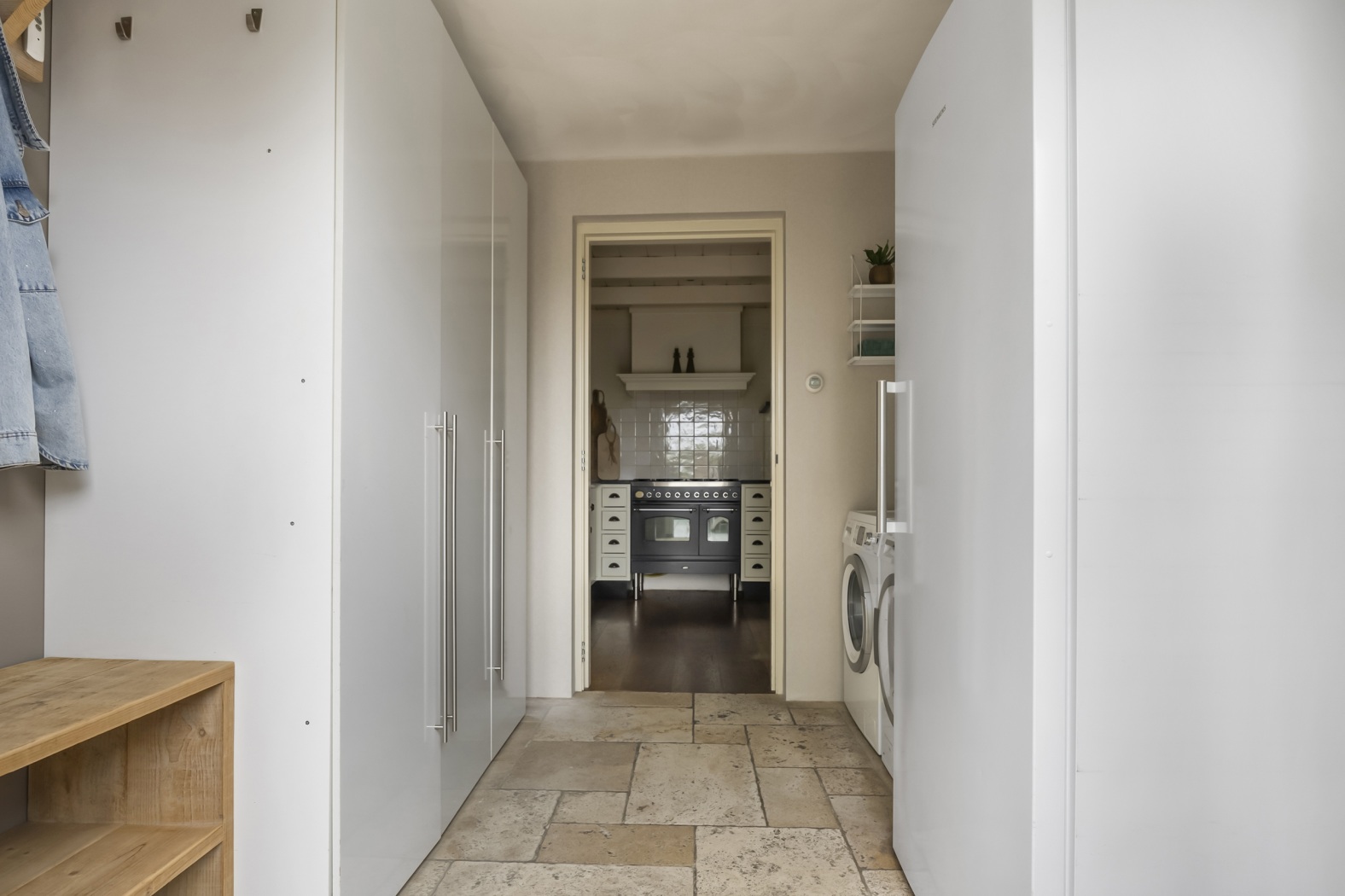 Aansluitend vind je de bijkeuken: praktisch en slim ingedeeld, met aansluitingen voor wasmachine en droger, ruimte voor een extra vriezer en kastruimte. Op de vloer liggen tegels. Via de deur loop je zo de tuin in – handig voor wie graag binnen en buiten combineert.