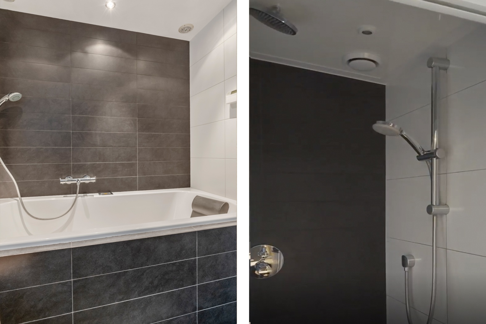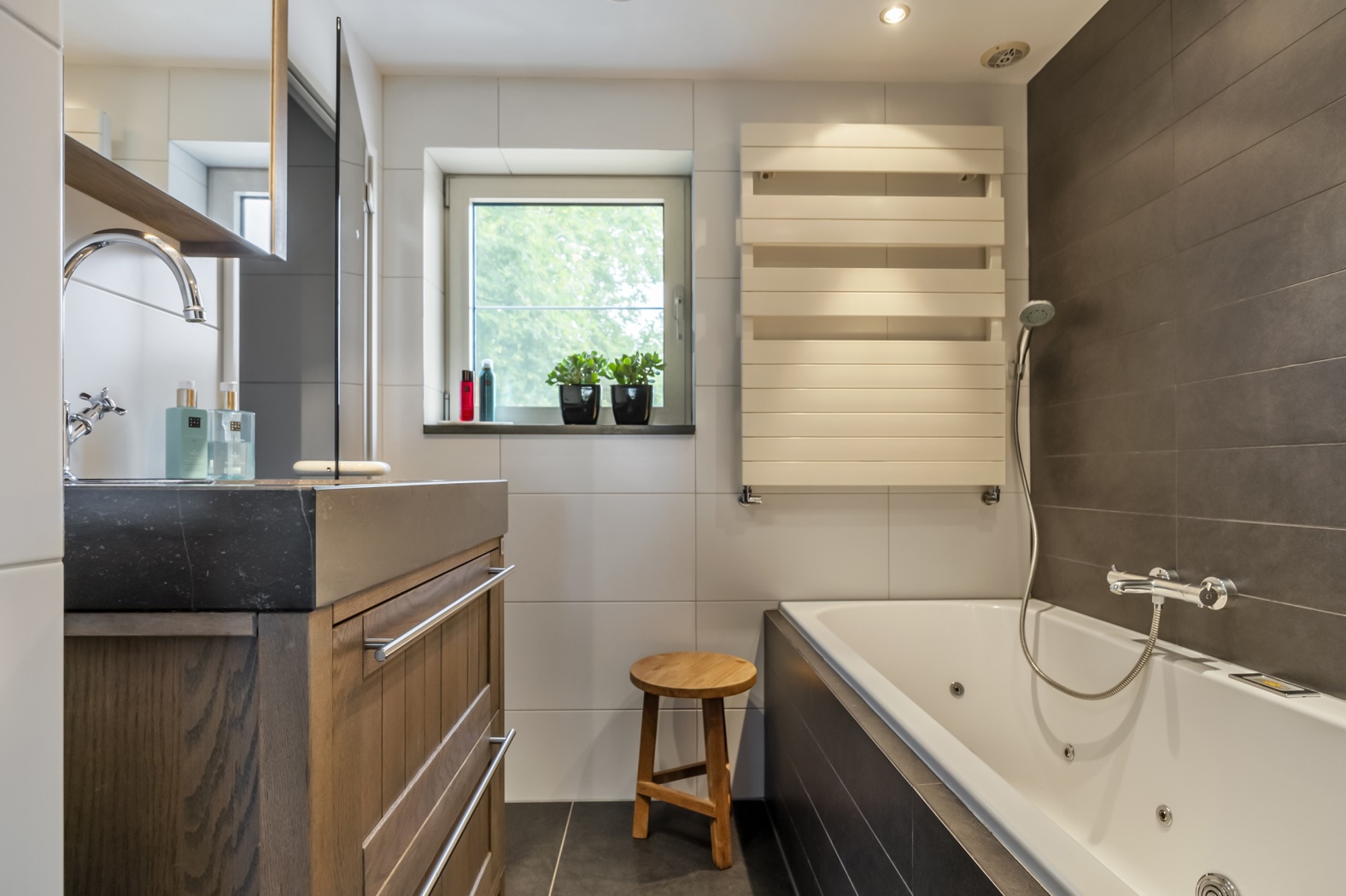 De moderne badkamer is een waar ontspanningsparadijs. Strakke, stijlvolle tegels en comfortabele vloerverwarming (slim aangesloten via de retourslang van de radiator) zorgen voor een aangenaam klimaat – zowel in de zomer als in de winter. Je vindt hier een elegant wastafelmeubel met spiegelkast, een Whirlpool ligbad, een royale inloopdouche én een praktische designradiator. Alles wat je nodig hebt om de dag fris en energiek te beginnen of juist in alle rust en comfort af te sluiten.