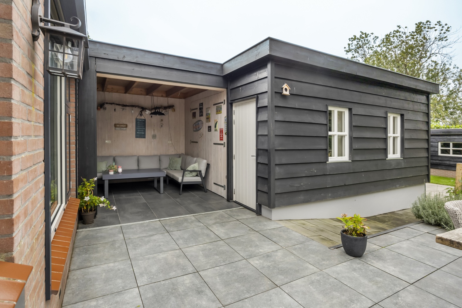 Aan de voorzijde ligt een oprit met carport, die via een sfeervolle overkapping doorloopt naar de achterzijde. Daar kom je uit bij de royale garage/schuur (carport en garage samen ca. 44 m²), uitgevoerd in dezelfde stijlvolle gepotdekselde afwerking. Binnen vind je verrassend veel comfort: vloerverwarming, een daklicht en meerdere ramen maken deze ruimte niet alleen praktisch, maar ook prettig om in te werken of te ontspannen. Op het dak zorgen de zonnepanelen voor een duurzame en energiezuinige toevoeging.