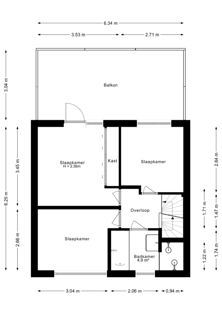 Op de eerste verdieping bevinden zich drie ruime slaapkamers. Aan de voorzijde ligt een lichte kamer, ideaal als kinderkamer, logeerkamer of werkkamer. Aan de achterzijde vind je twee slaapkamers met rolluiken, waaronder de master bedroom. Deze beschikt over praktische kastruimte én een deur naar het royale balkonterras van maar liefst 19 m², gelegen op het zonnige zuiden. Een heerlijke plek om ’s ochtends rustig te ontwaken of ’s avonds nog even van de laatste zonnestralen te genieten.