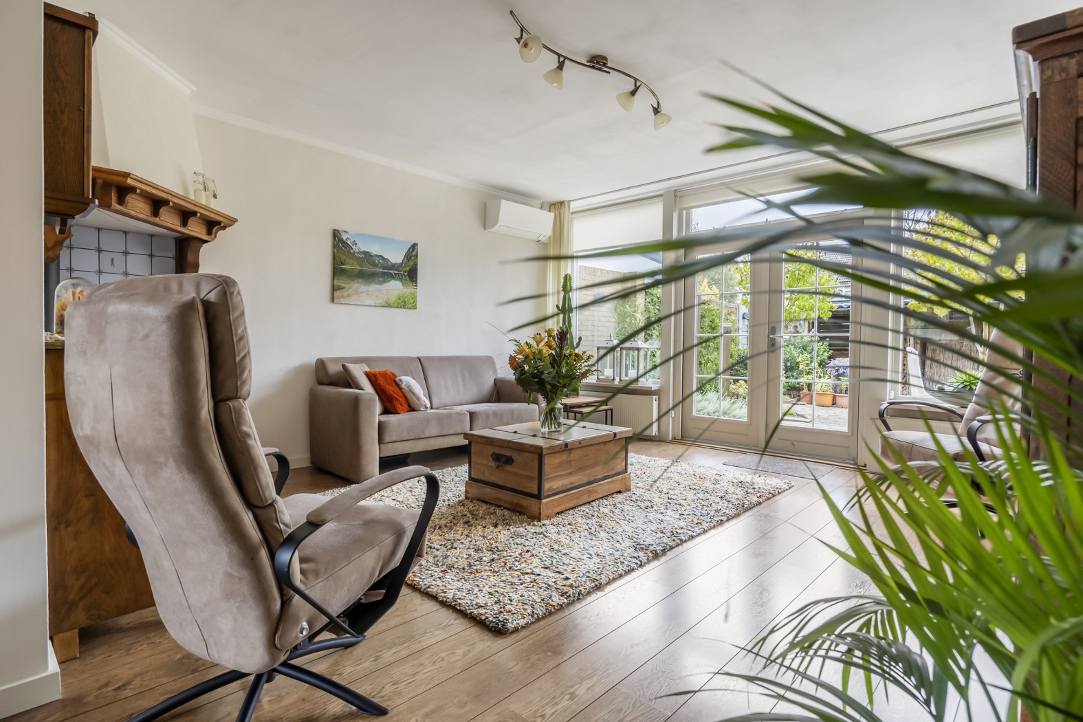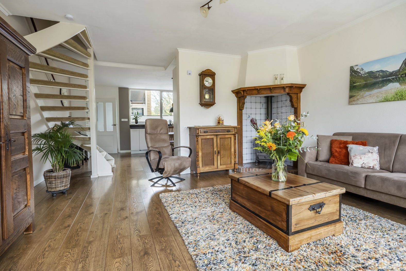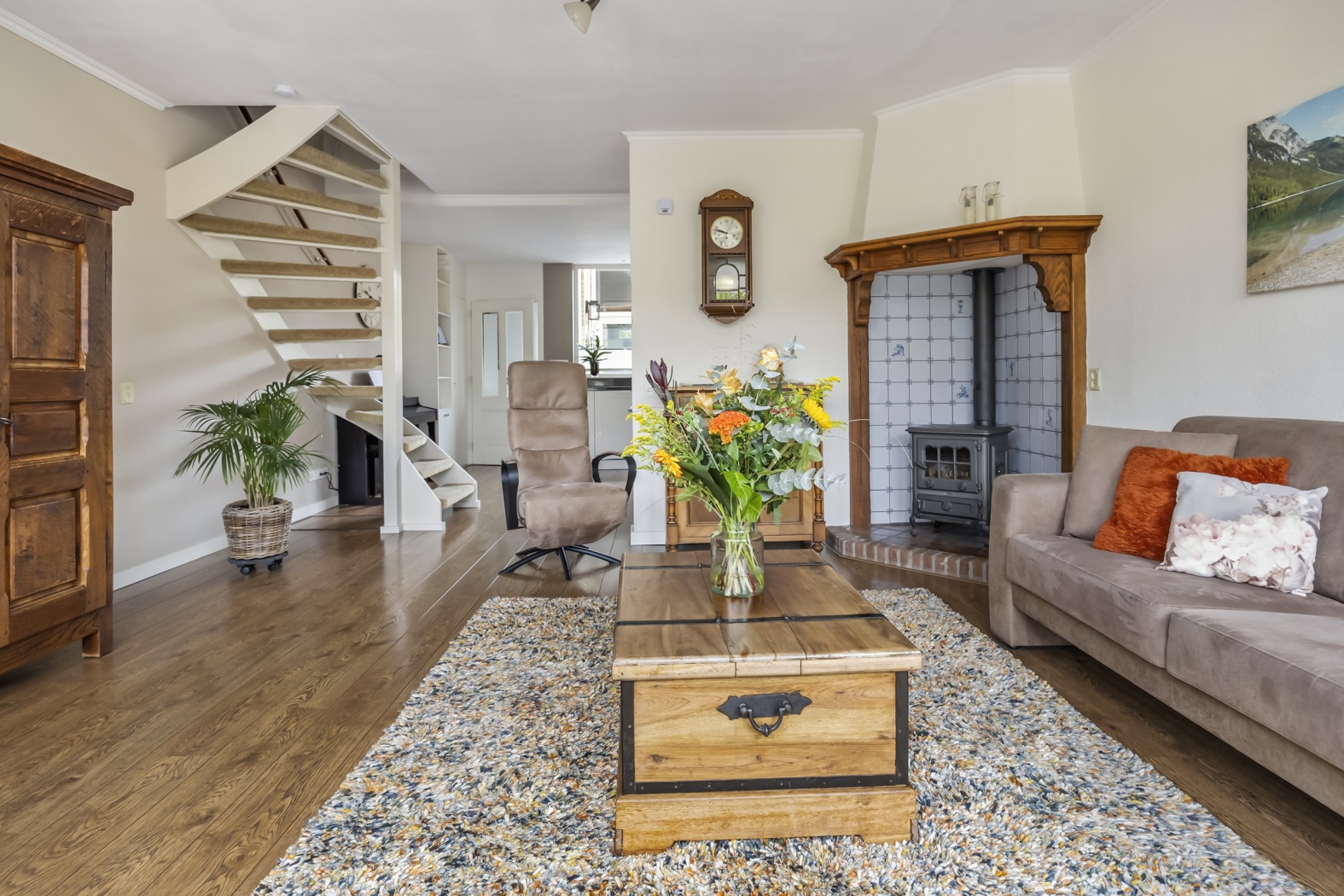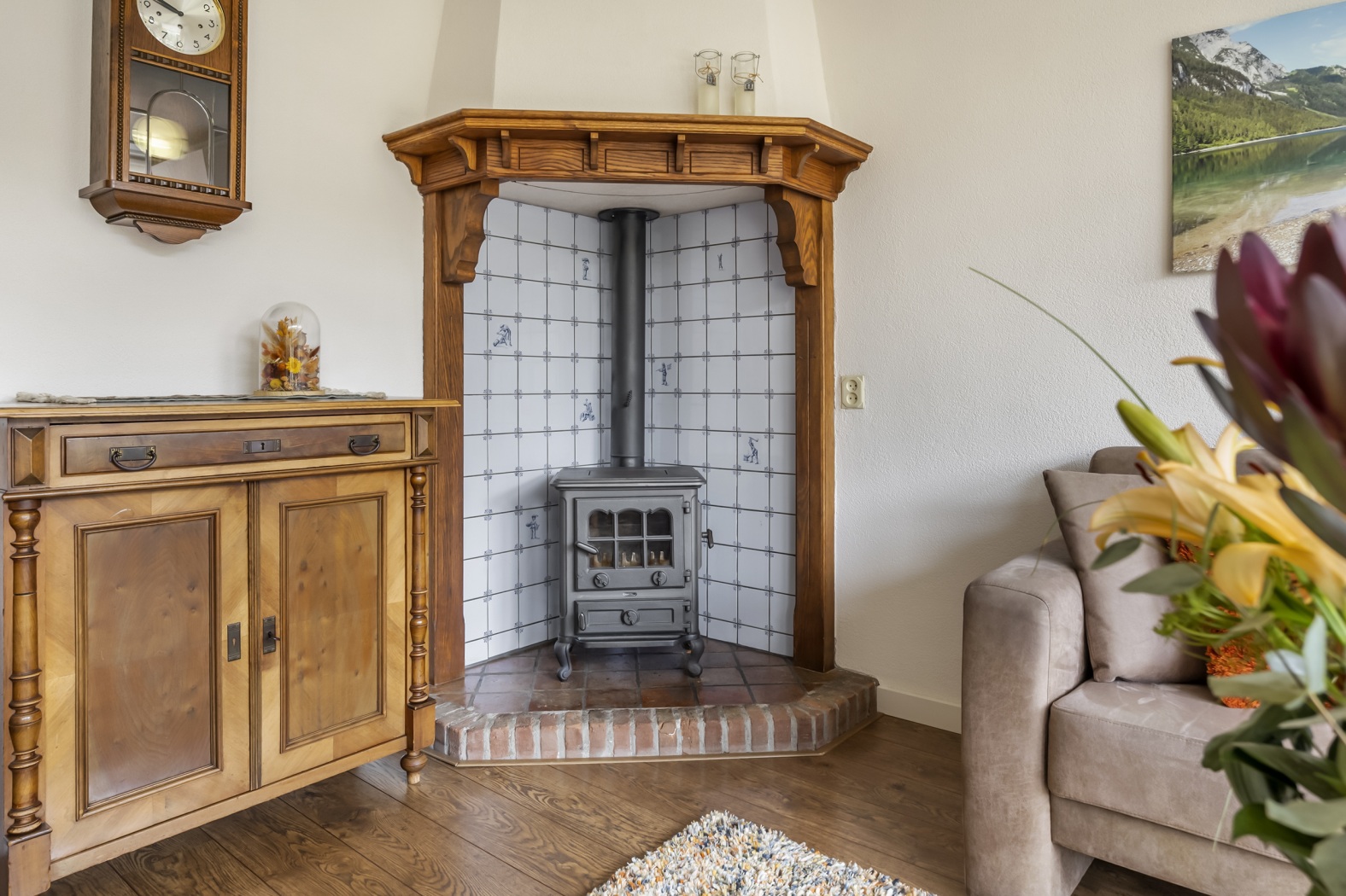 De woonkamer en keuken vormen samen een royale leefruimte van ca. 44 m². Aan de achterzijde bevindt zich de gezellige woonkamer, met dubbele openslaande deuren naar de tuin en het zonnige terras met zonnescherm – ideaal om binnen en buiten moeiteloos in elkaar te laten overlopen. In de hoek zorgt een sfeervolle schouw met tegeltjes en een houtkachel voor warmte, karakter en een vleugje nostalgie.