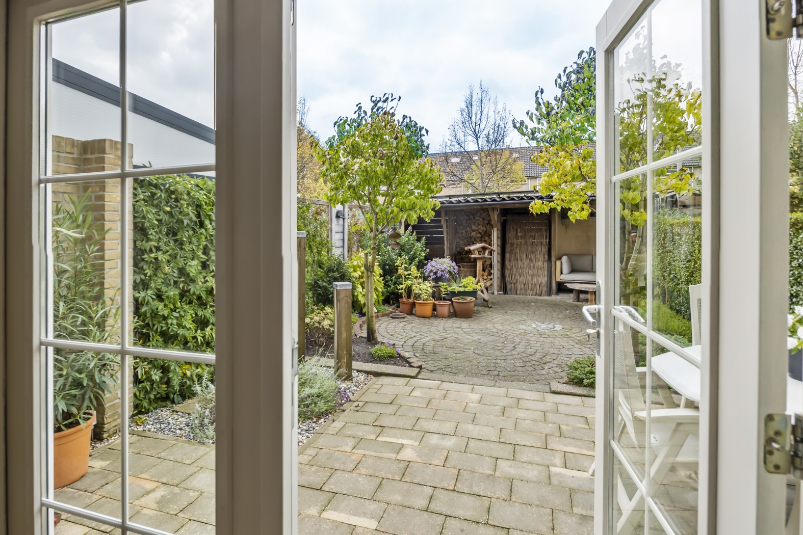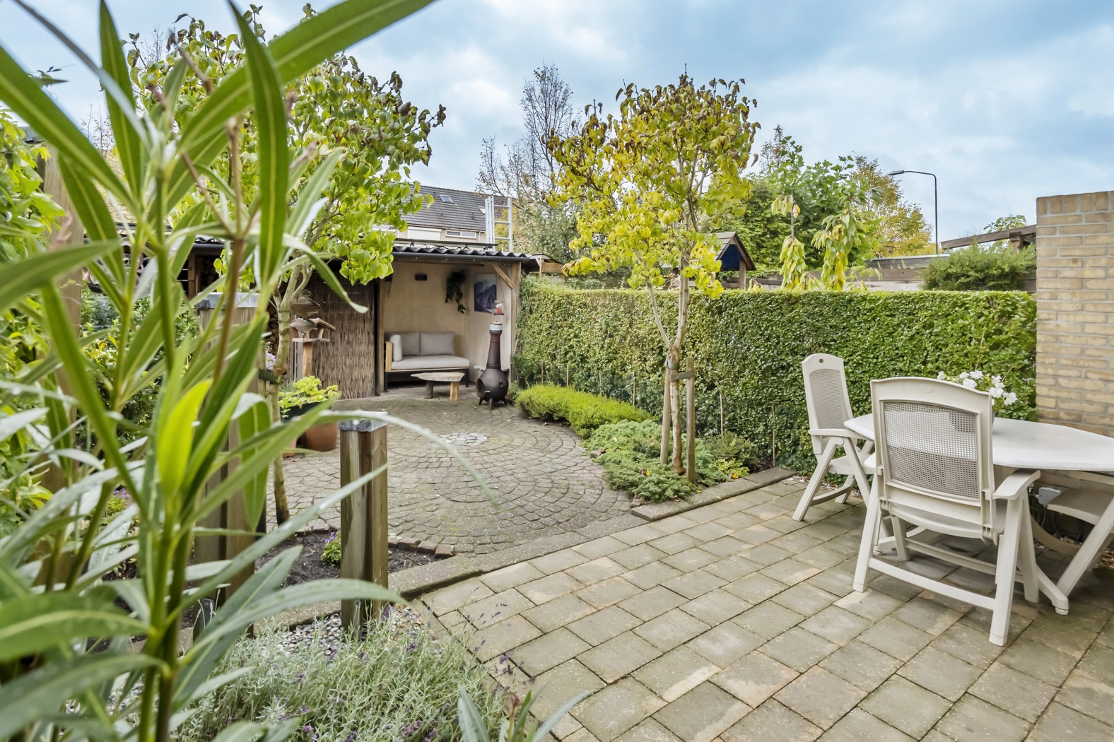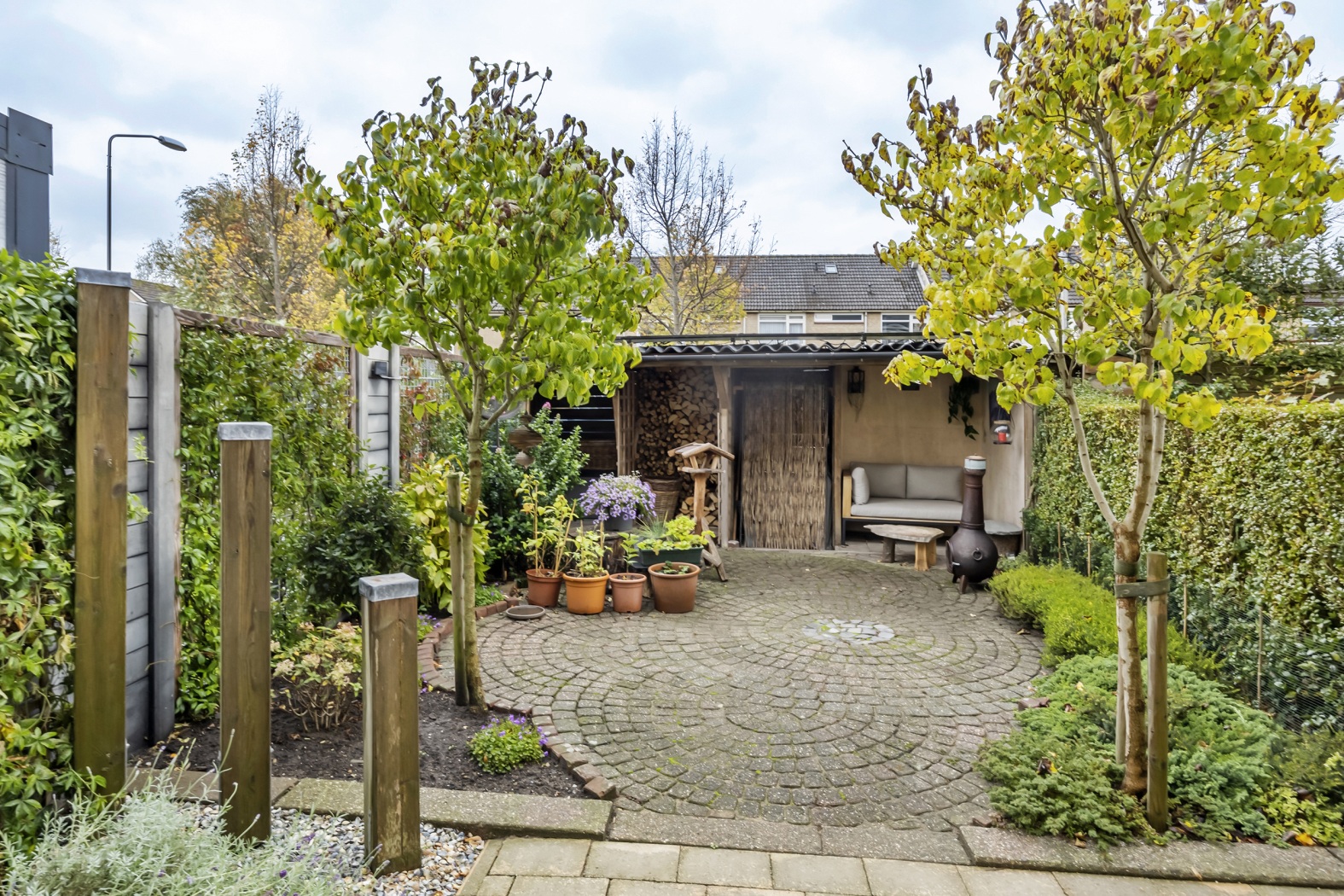 De zonnige tuin op het zuiden is een heerlijke plek om te ontspannen. Direct aan de achtergevel ligt een royaal terras met elektrisch bedienbaar zonnescherm, ideaal tijdens warme zomerdagen. De tuin is speels aangelegd met ronde vormen in de sierbestrating, een schutting en een groene haag voor de privacy, borders en enkele bomen die voor extra sfeer zorgen. Achter in de tuin een kleine lounge overkapping + extra overkapping voor haardhout. Via een poort in de schutting is er directe toegang tot de openbare weg.