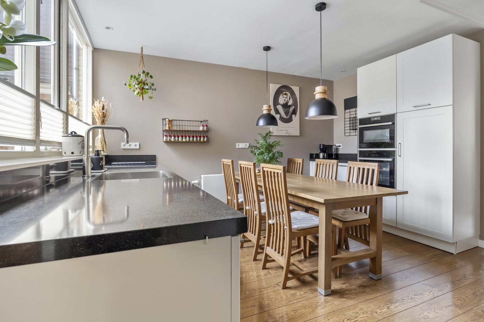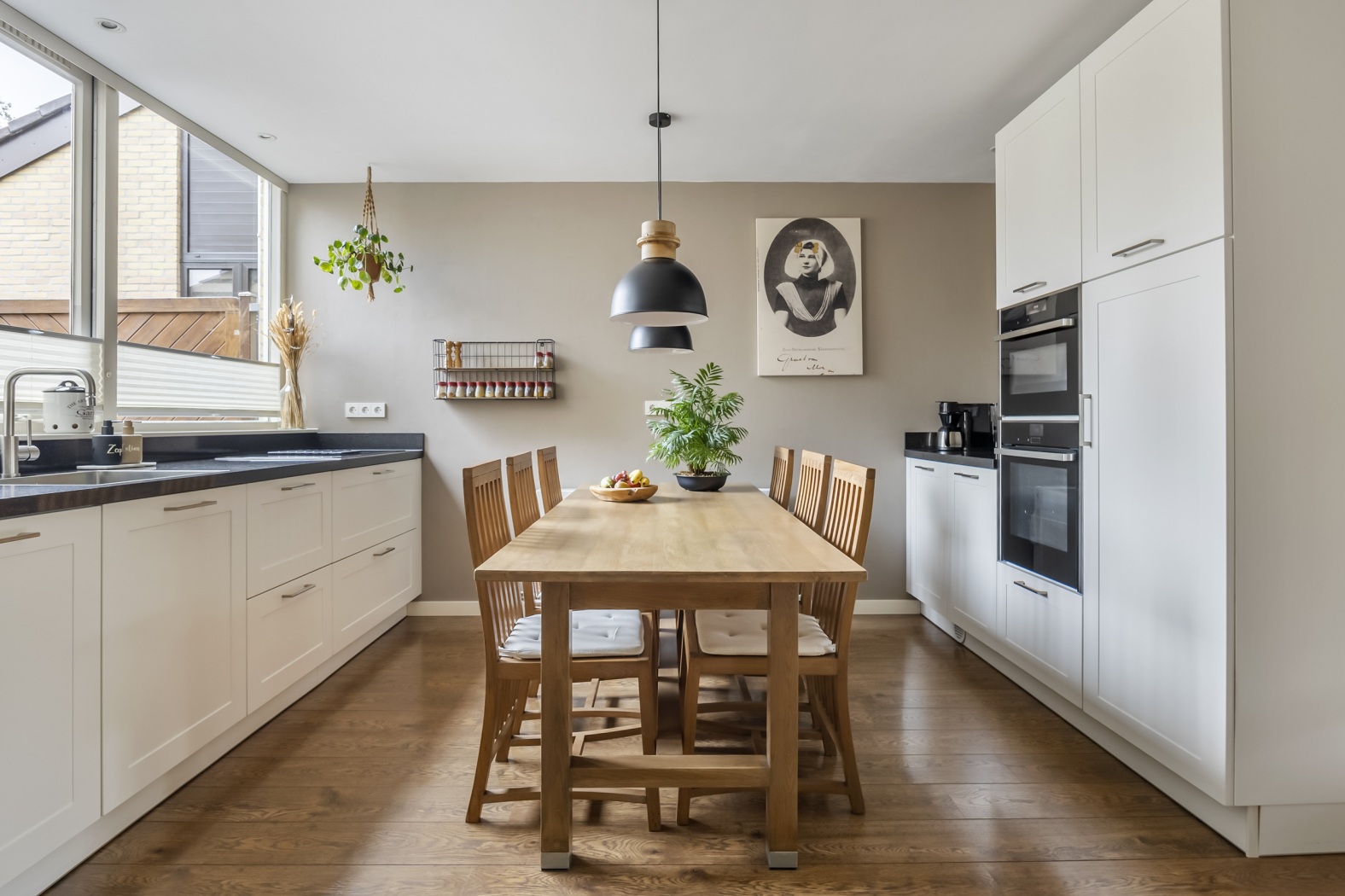 De keuken aan de voorzijde is praktisch én sfeervol ingericht, met een rechte opstelling onder het raam en aan de overzijde een apparatenwand en een knusse koffiecorner. De witte kastfronten creëren een frisse, tijdloze uitstraling. De keuken is voorzien van diverse inbouwapparaten, waaronder een kookplaat met geïntegreerde afzuiging, een combi-oven, een stoomoven, een koelkast en een vaatwasser.