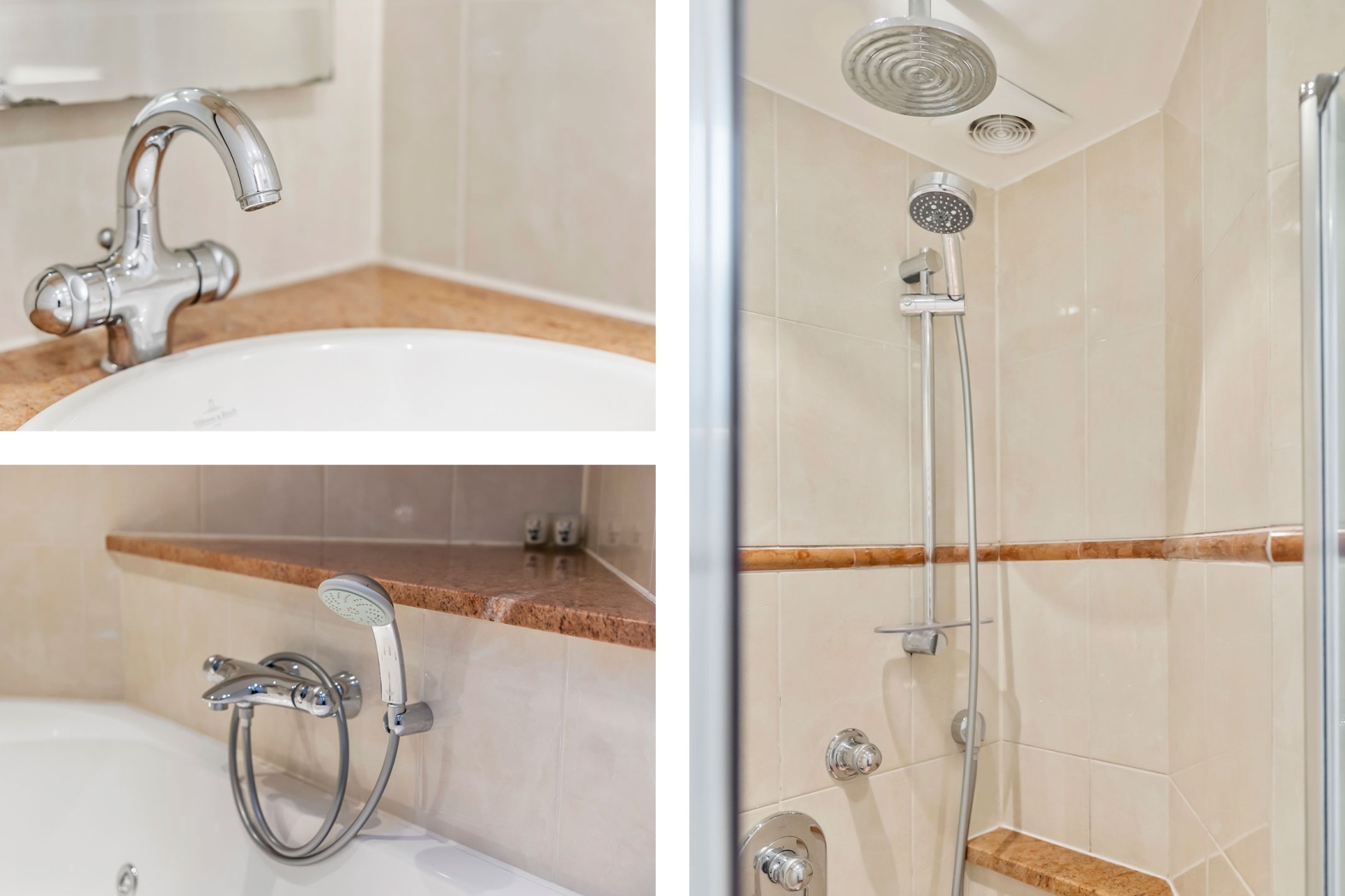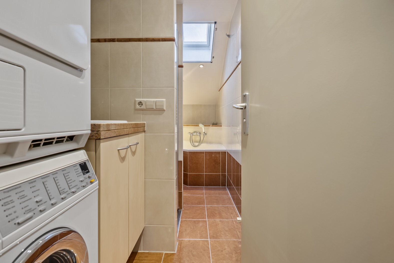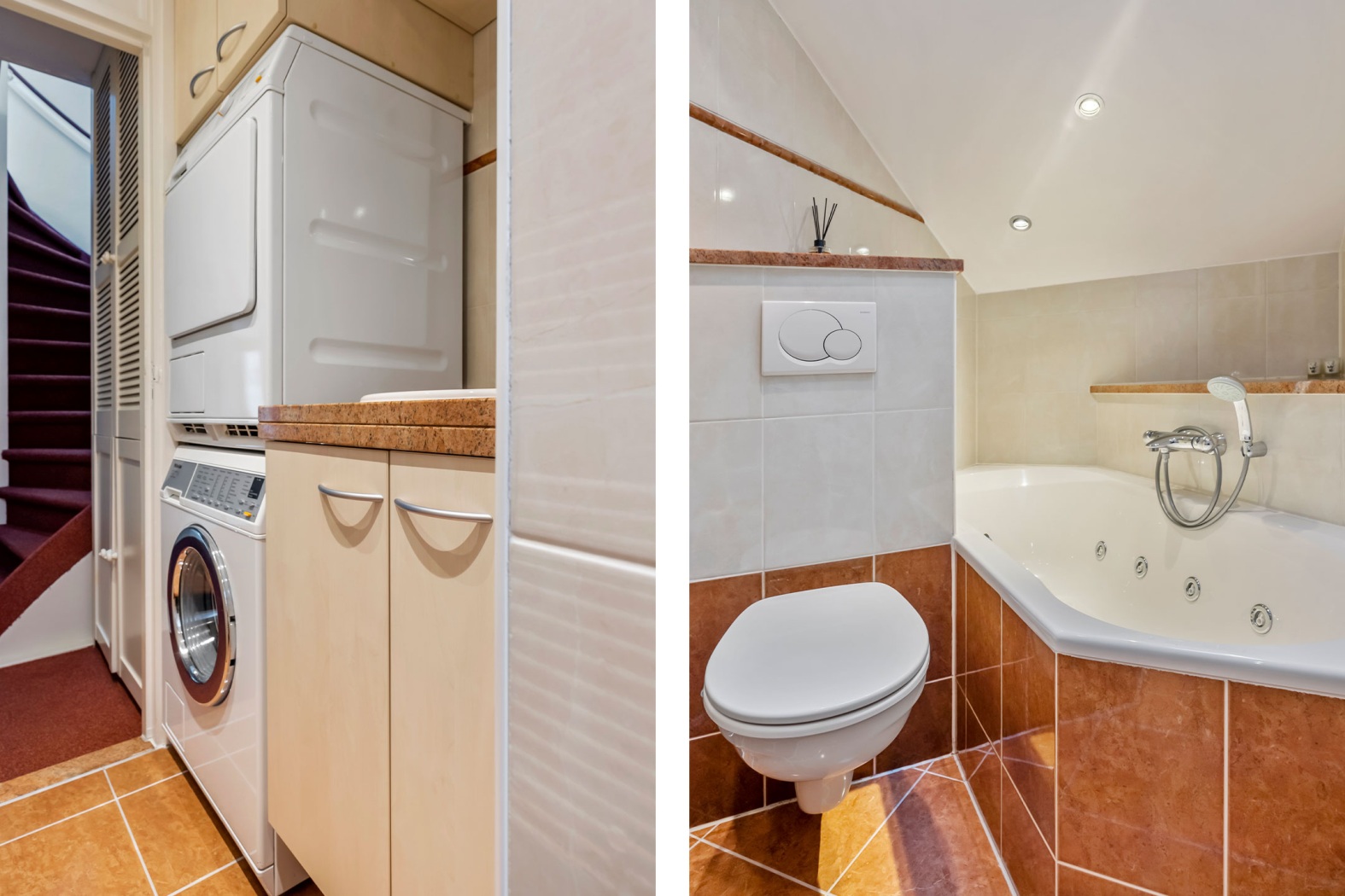 De badkamer van ca. 6,4 m² is uitgerust met een doucheruimte met regendouche, een whirlpool-ligbad en een wastafelmeubel. Er is tevens een aansluiting voor wasmachine en droger, met daarnaast én erboven handige kastjes voor extra bergruimte. Voor de doucheruimte ligt een vloer lus die zorgt voor heerlijke warmte onder de voeten.