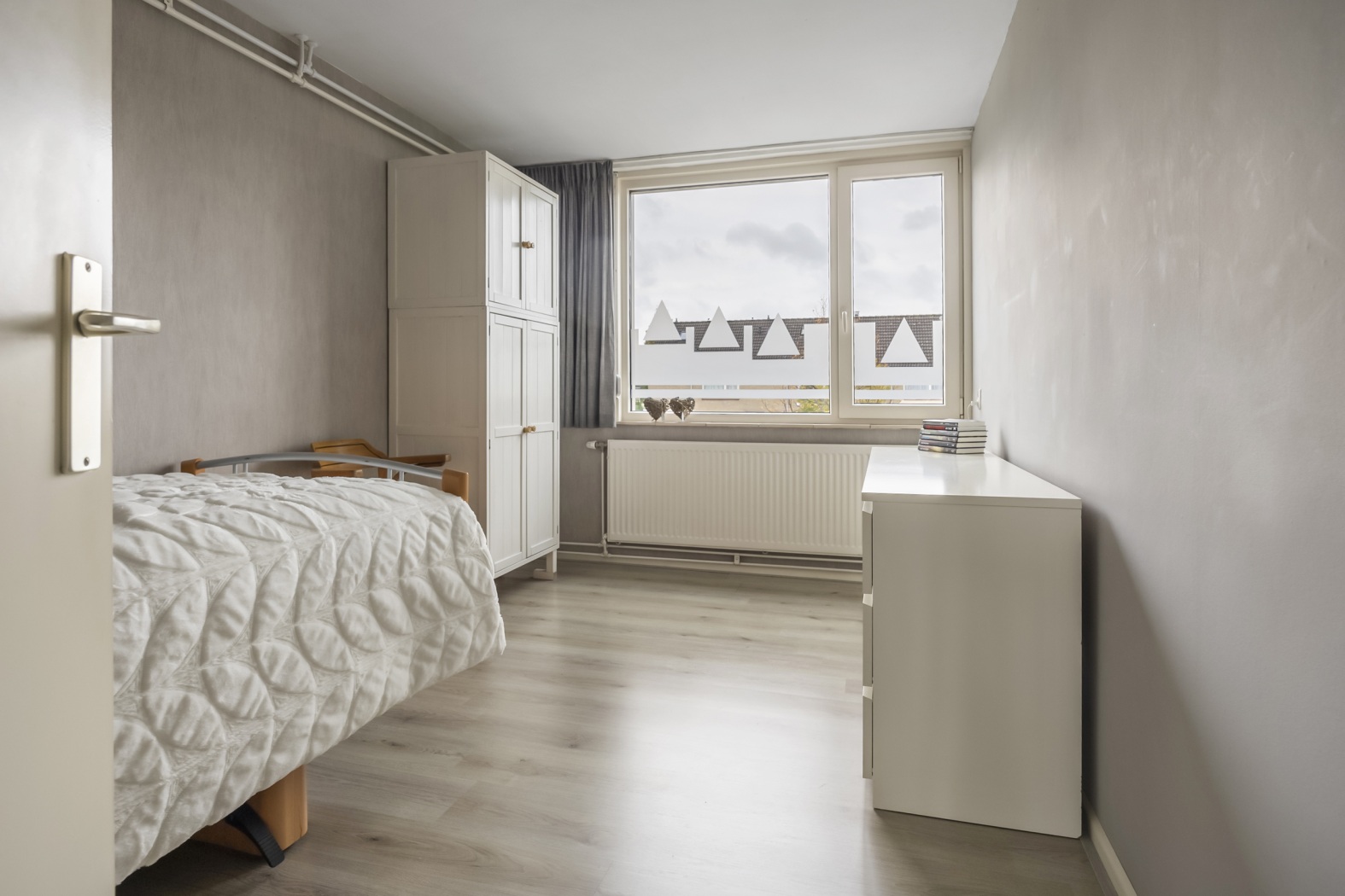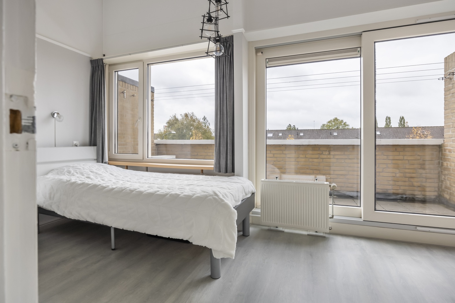 De woningbrede slaapkamer aan de achterzijde is heerlijk ruim en uitgerust met een wastafelmeubel. Via de schuifpui stap je direct het zonnige balkon op het zuiden op (circa 7 m²). Een heerlijke plek om ’s ochtends de deuren open te zetten en meteen van de zon te genieten.