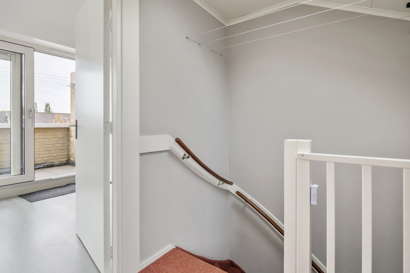 De overloop is voorzien van een dakraam en praktische kastruimte, en biedt toegang tot twee slaapkamers.