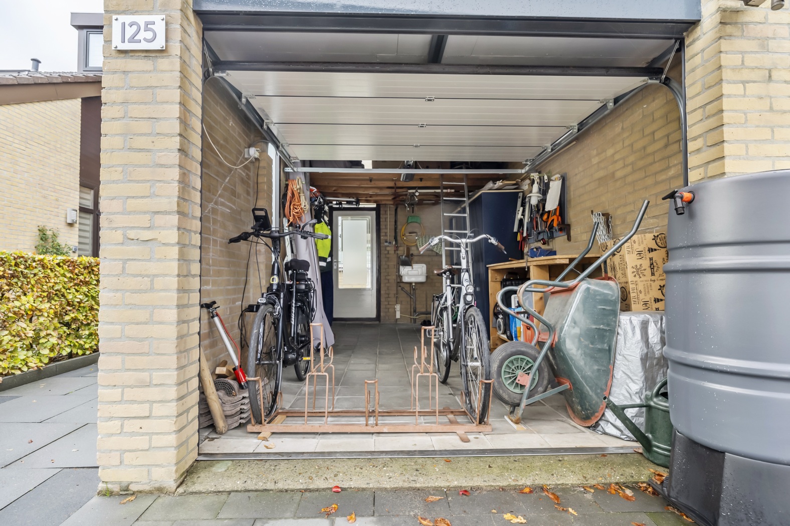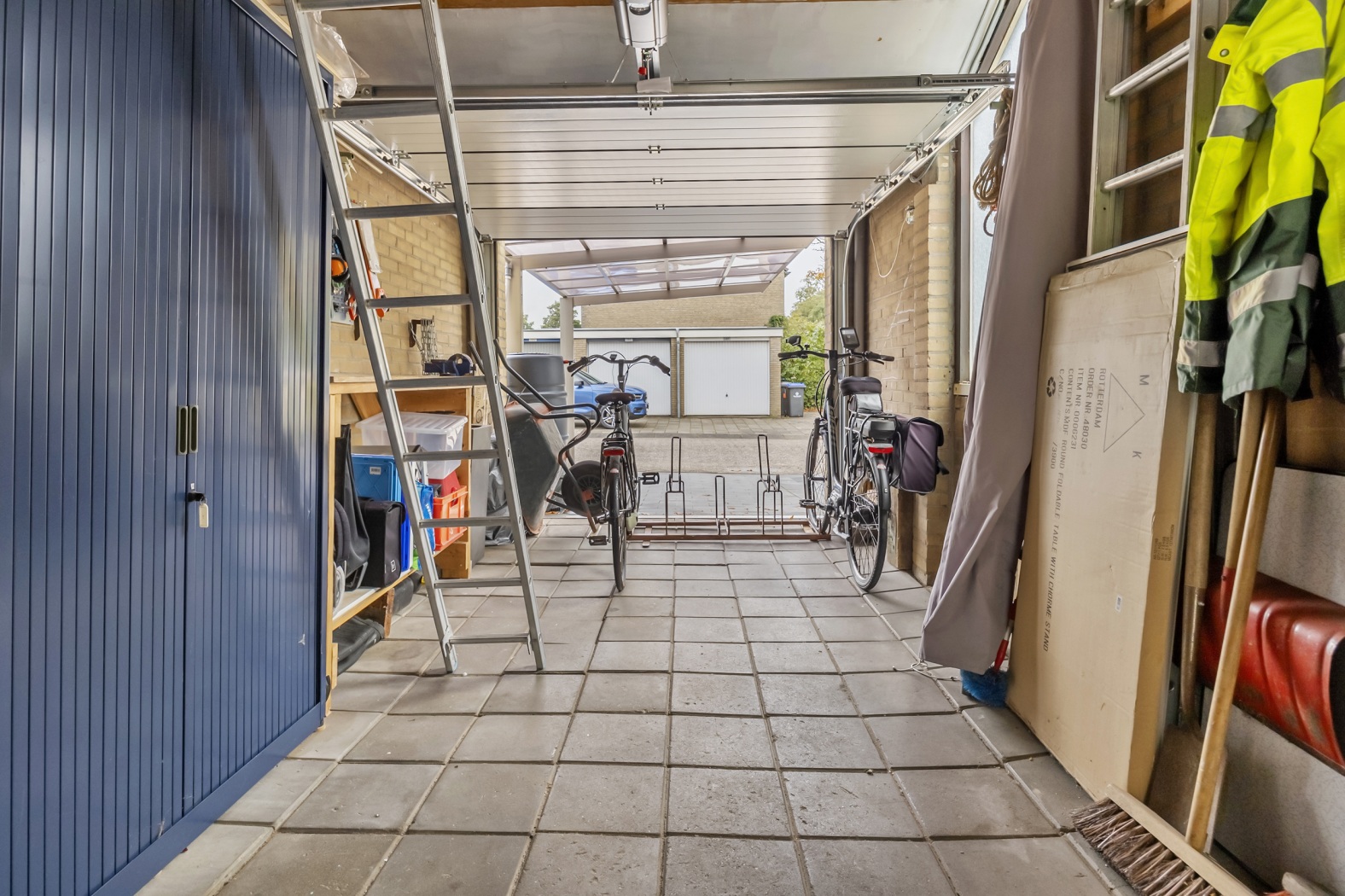 Aan de voorzijde van de woning vind je de carport en de garage, voorzien van een elektrische roldeur én een praktische loopdeur. Boven de garage bevindt zich een handige insteek zolder, bereikbaar via een losse trap – ideaal voor extra bergruimte.