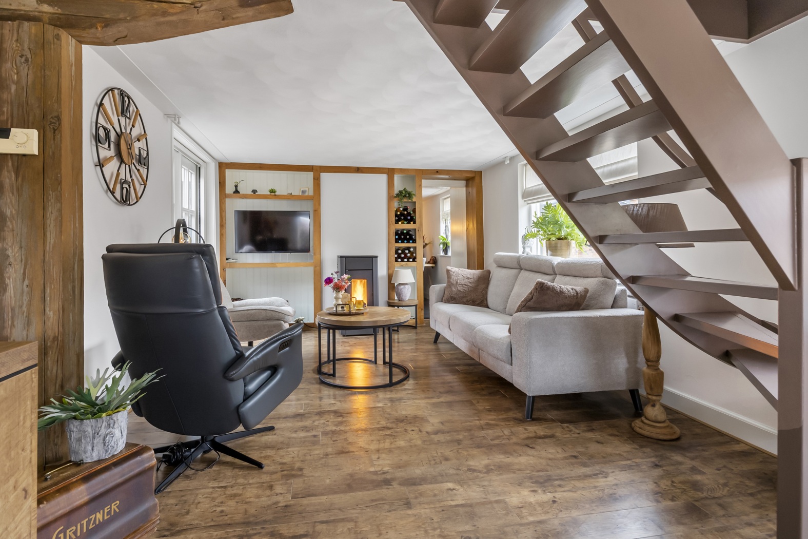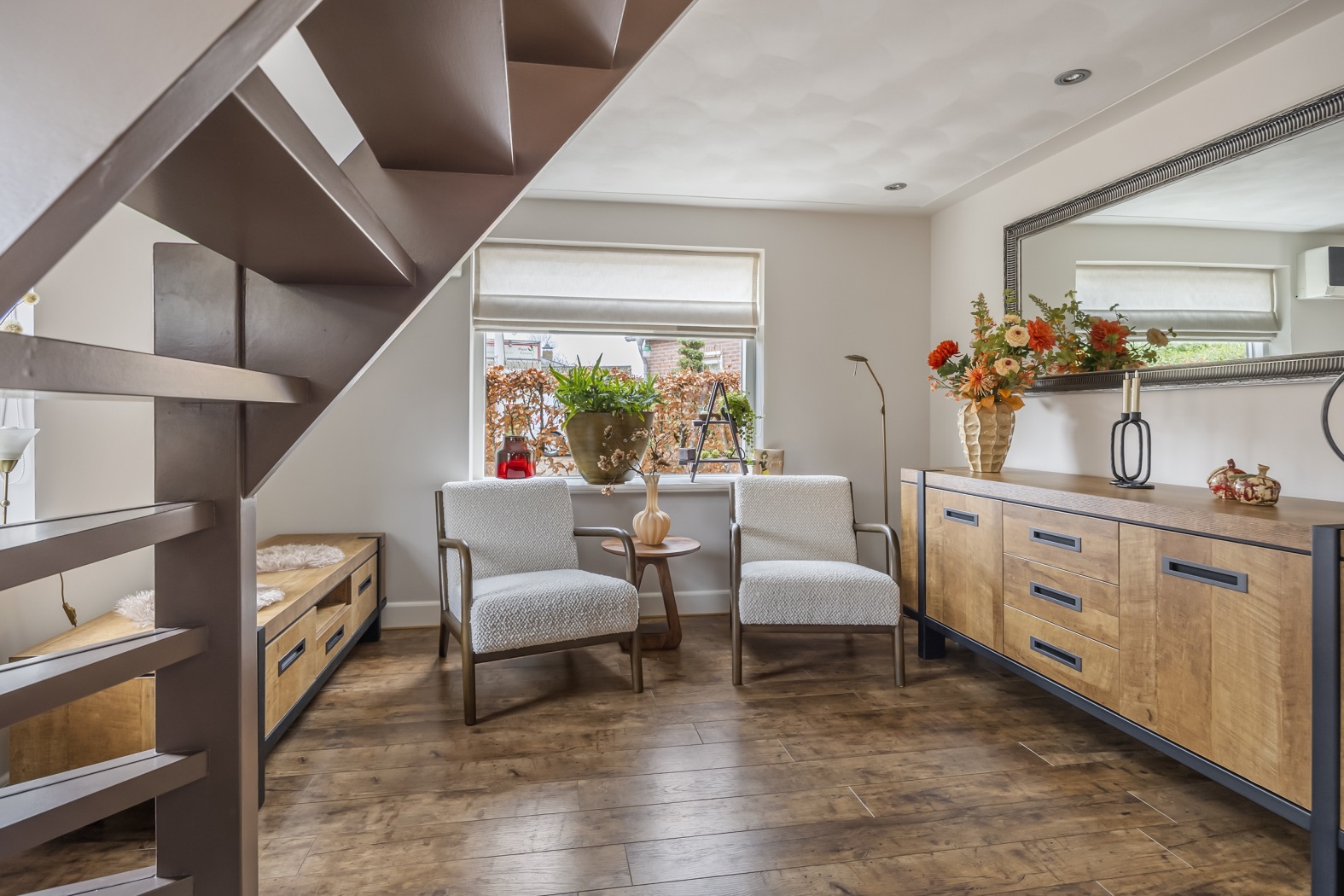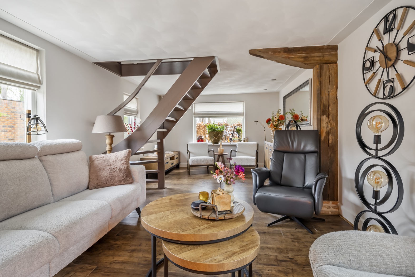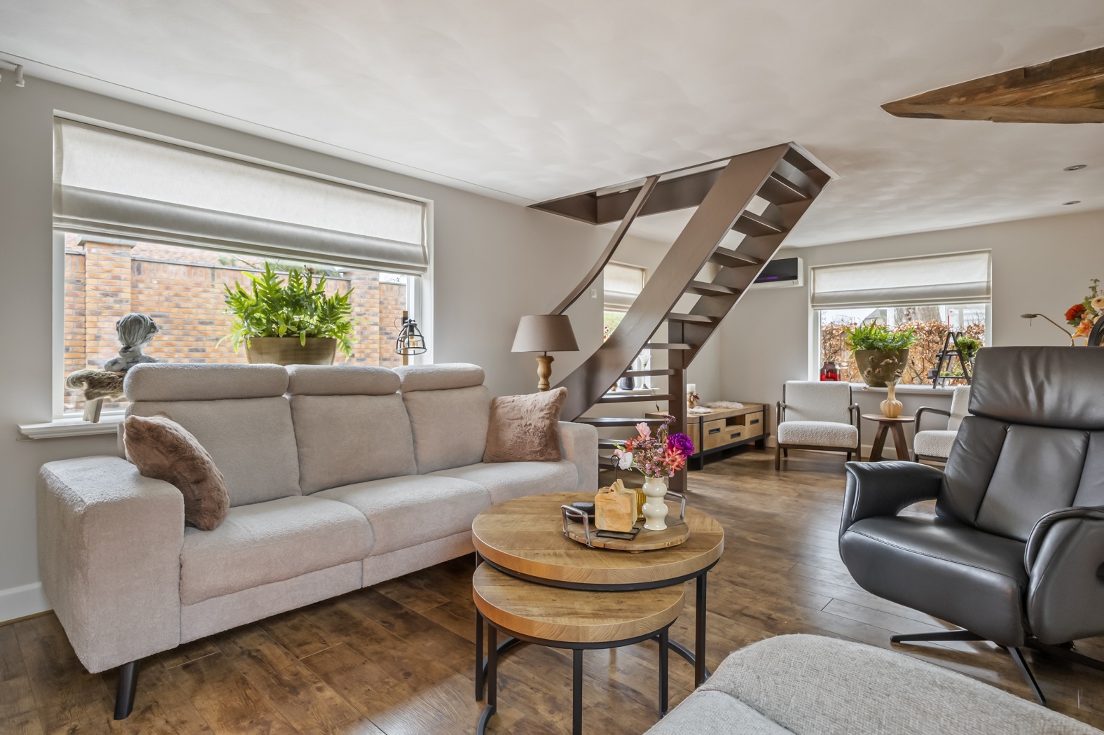 De woonkamer (ca. 25 m²) is een heerlijke, sfeervolle ruimte met strakke wanden, vloeren en plafonds. De dubbele terrasdeuren verbinden binnen moeiteloos met het terras en de tuin. De trap naar de verdieping is slim in de ruimte geplaatst. Tussen de woonkamer en de woonkeuken zorgt een stijlvolle cinewall voor een speelse scheiding, compleet met tv-wand, palletkachel en praktische wijnopslag.