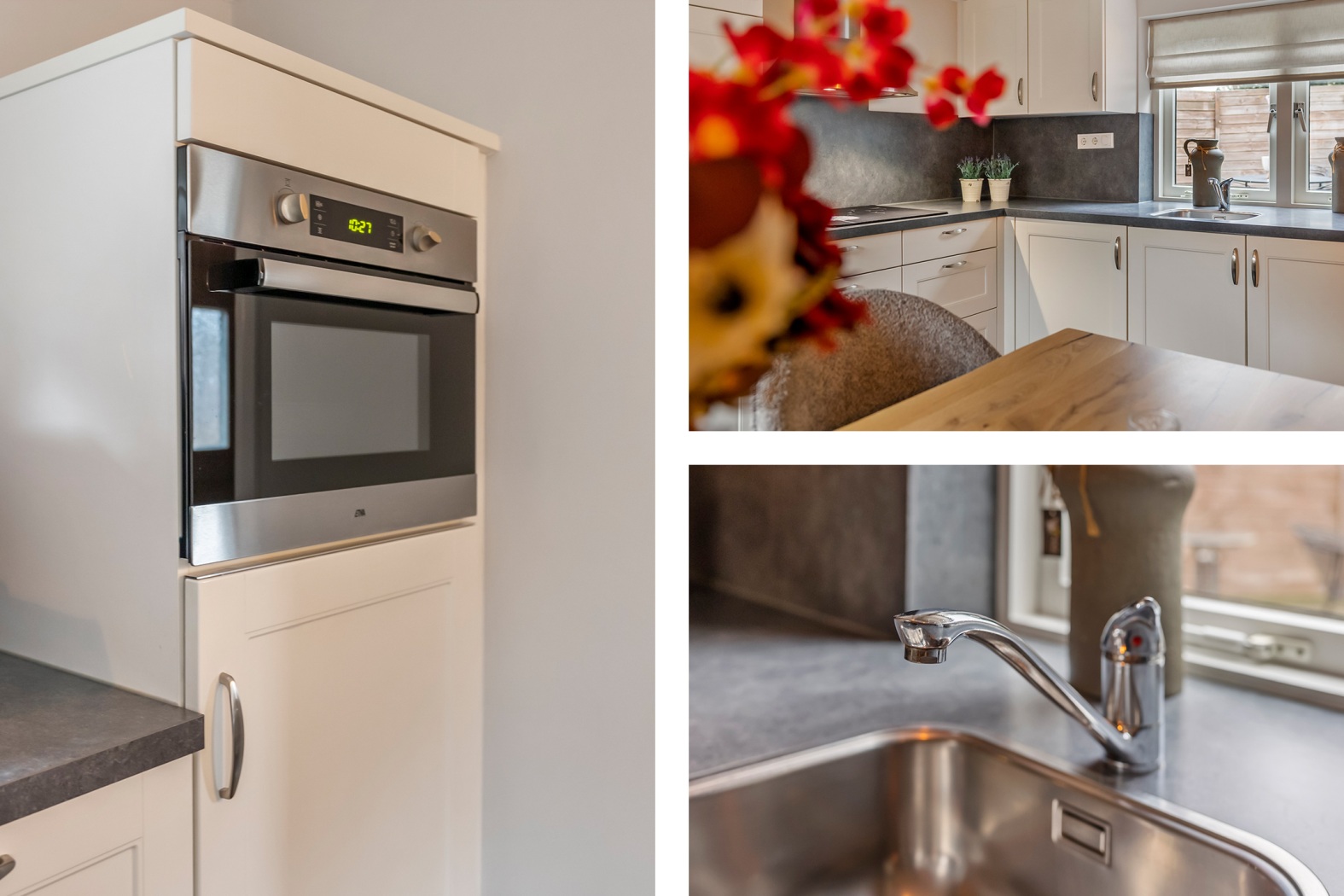 De moderne woonkeuken is uitgevoerd in een fijne hoekopstelling met lichte kastfronten en diverse inbouwapparatuur, waaronder een inductiekookplaat, RVS afzuigkap, combi-oven, koel-/vriescombinatie en vaatwasser. De plavuizenvloer en het strakke stucplafond geven een nette uitstraling, terwijl het raam boven het aanrecht zorgt voor prettig daglicht en uitzicht op de tuin.