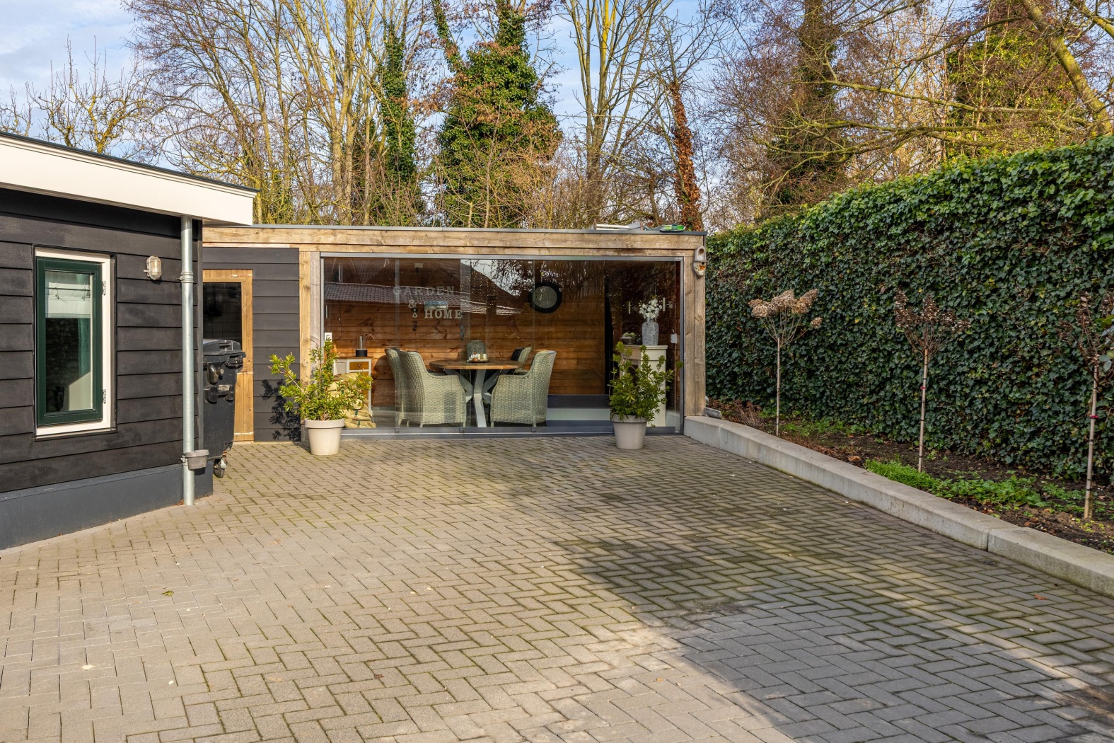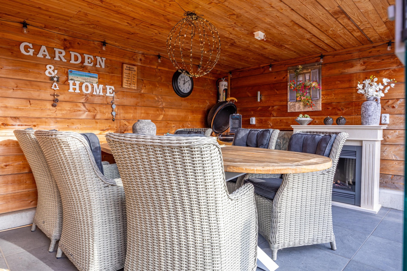 De tuin ligt op het noorden en oosten, maar biedt verrassend veel plekjes om van de zon te genieten. Rondom is alles strak en onderhoudsvriendelijk aangelegd met grijze klinkers in een stijlvol visgraatpatroon. Naast de woning is er parkeerruimte op eigen terrein voor twee auto’s. Direct achter de woning – bereikbaar via de dubbele terrasdeuren vanuit de woonkamer – stap je zo het terras/tuin op. Hier staat ook de fijne loungeoverkapping (ca. 13 m²) met glazen schuifwanden: een heerlijke plek voor lange avonden, barbecueën en gezellig tafelen, ongeacht het seizoen. Aangrenzend vind je een praktische houten berging (ca. 11 m²) voor fietsen, tuinspullen en extra opslag.