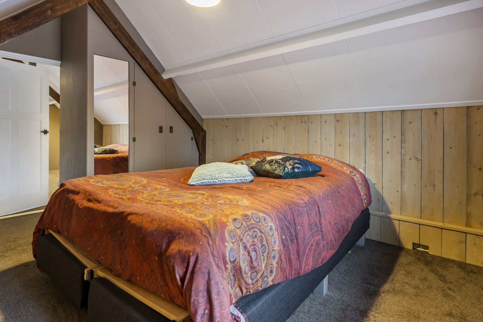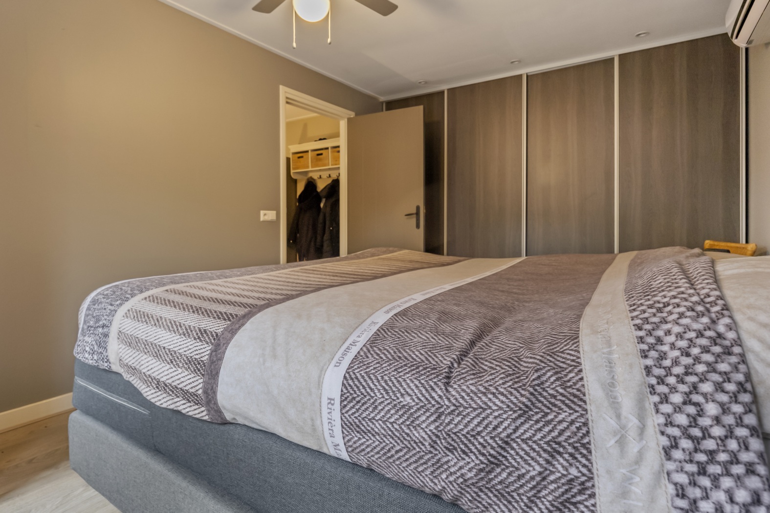 Wat een luxe: slapen en baden op de begane grond. Vanuit de hal bereik je de ouderslaapkamer in de aanbouw: een fijne, strakke kamer met laminaatvloer, airconditioning en een praktische 4-deurs schuifwandkast.