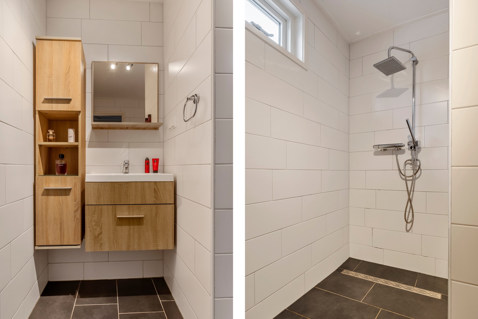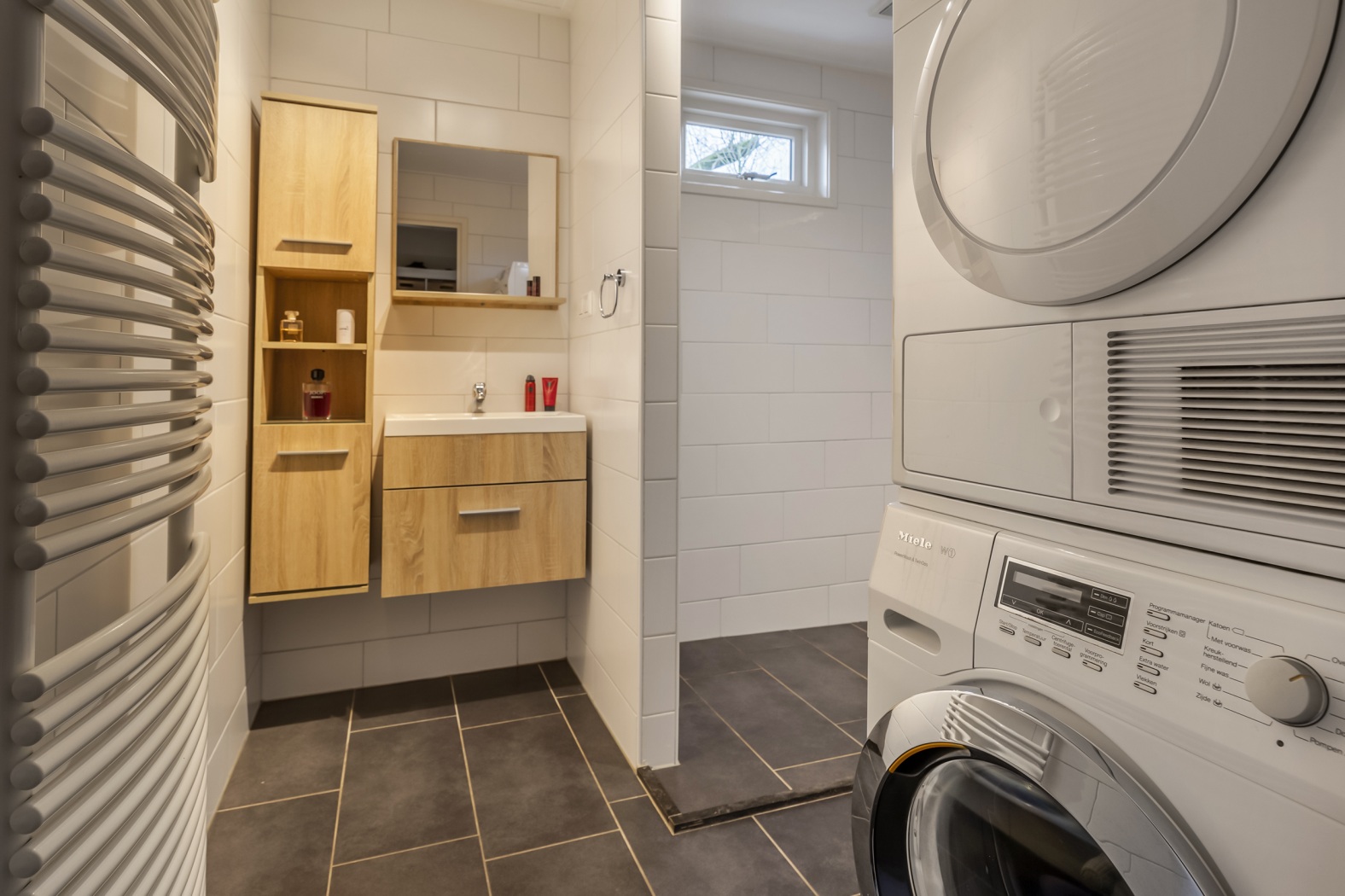 Ook de badkamer is vanuit de hal toegankelijk en ligt naast de slaapkamer. Deze is volledig betegeld en netjes ingericht met een inloopdouche met regendouche én handdouche, een wastafelmeubel en een designradiator. Daarnaast is er ruimte voor de wasmachine en droger. Het klepraampje zorgt voor daglicht en natuurlijke ventilatie. Het toilet is separaat en eveneens vanuit de hal bereikbaar.