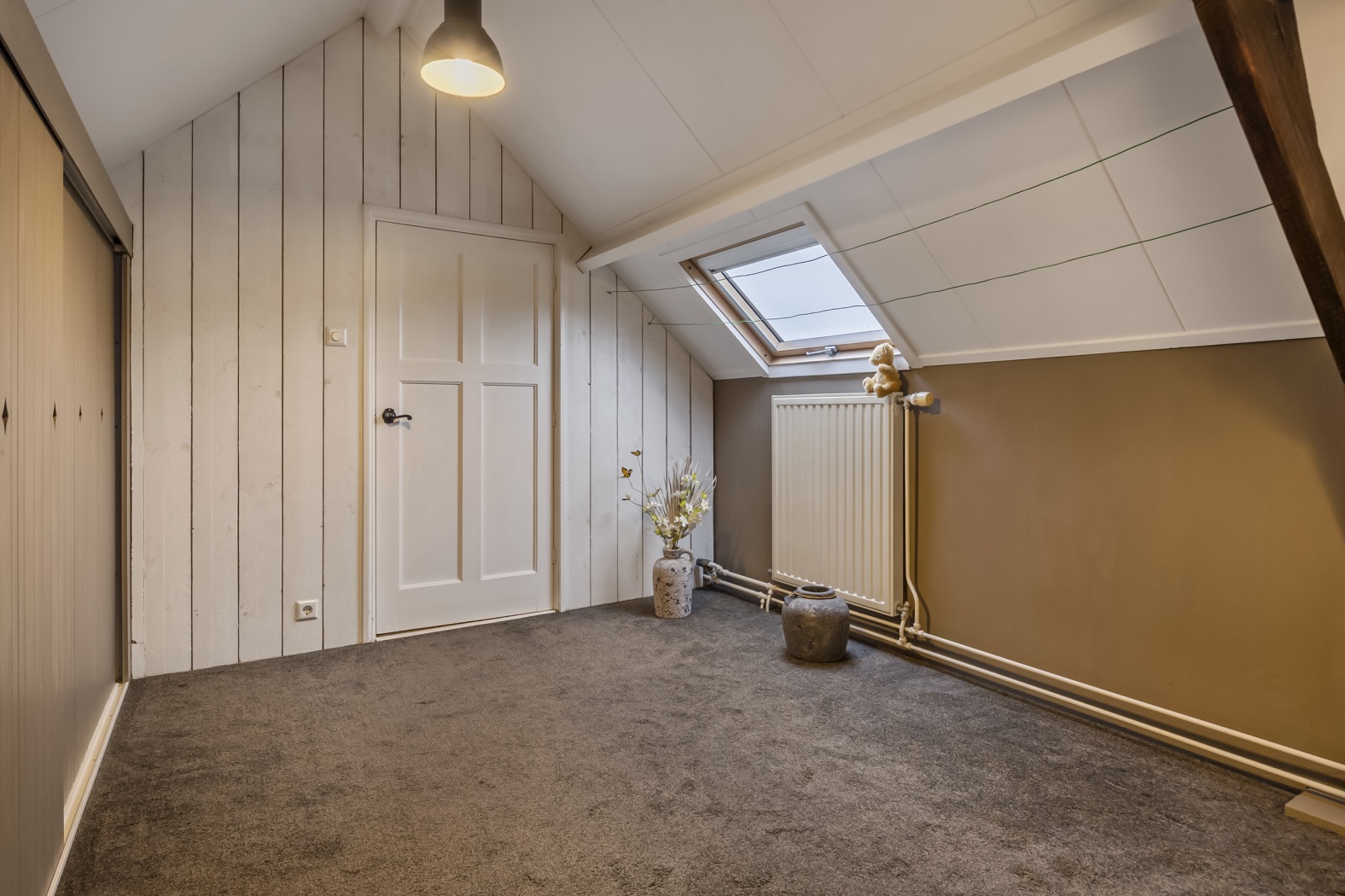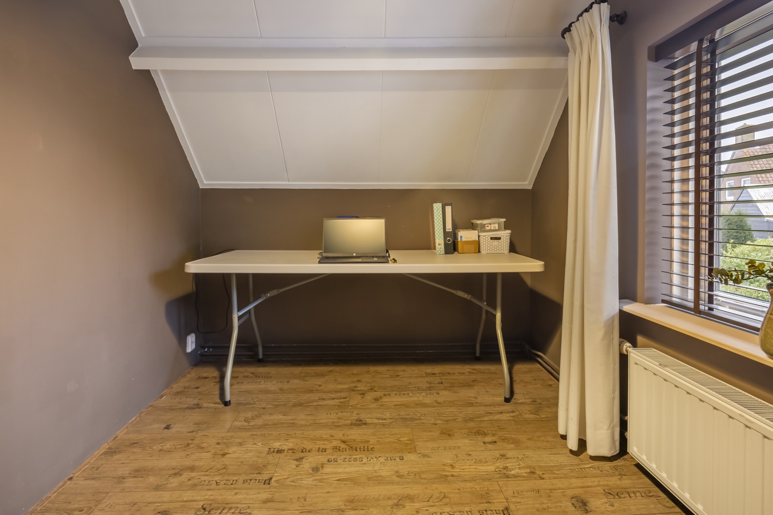 Op de verdieping kom je uit op een lichte overloop met dakraam en volop praktische bergruimte dankzij de schuifwandkast. Vanaf hier zijn twee fijne kamers bereikbaar, ideaal als slaapkamers, werkkamer of hobbyruimte. Eén van de kamers beschikt bovendien over handige inbouw kastruimte. In totaal telt de woning dus drie slaapkamers.