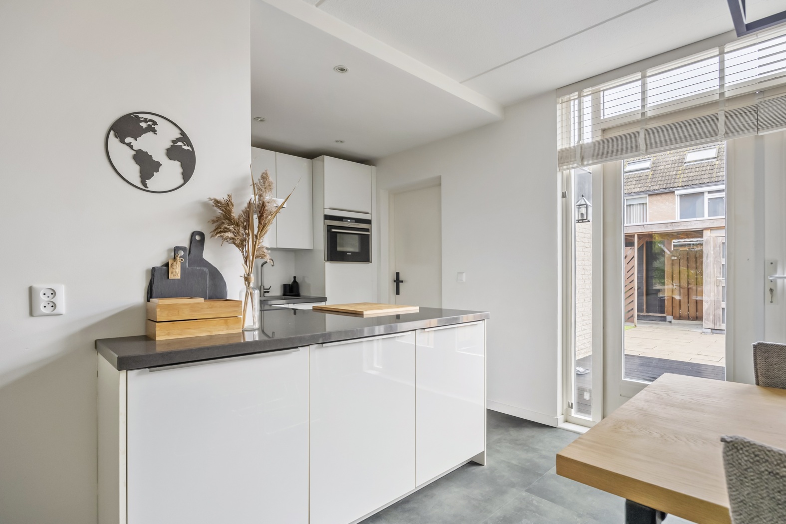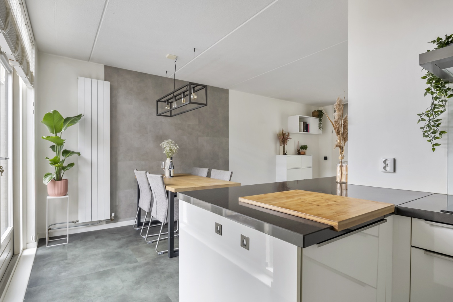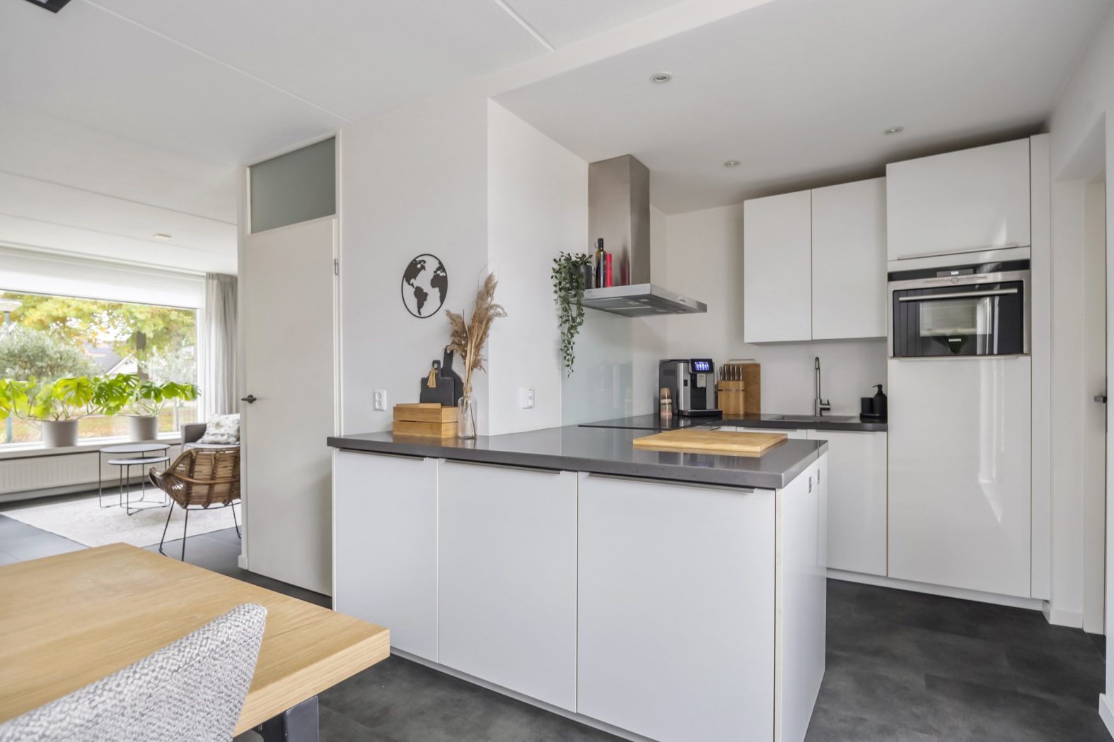De woonkamer loopt vloeiend over in het eetgedeelte en de moderne keuken. Het doorlopende werkblad creëert een natuurlijke verbinding tussen koken en tafelen — perfect voor wie houdt van gezelligheid tijdens het koken. De keuken is uitgerust met inbouwapparatuur en heeft een moderne, tijdloze uitstraling. Achter de keuken bevindt zich de bijkeuken, ideaal als extra opslagruimte, met plek voor een extra vriezer en een praktische doorgang naar de tuin.