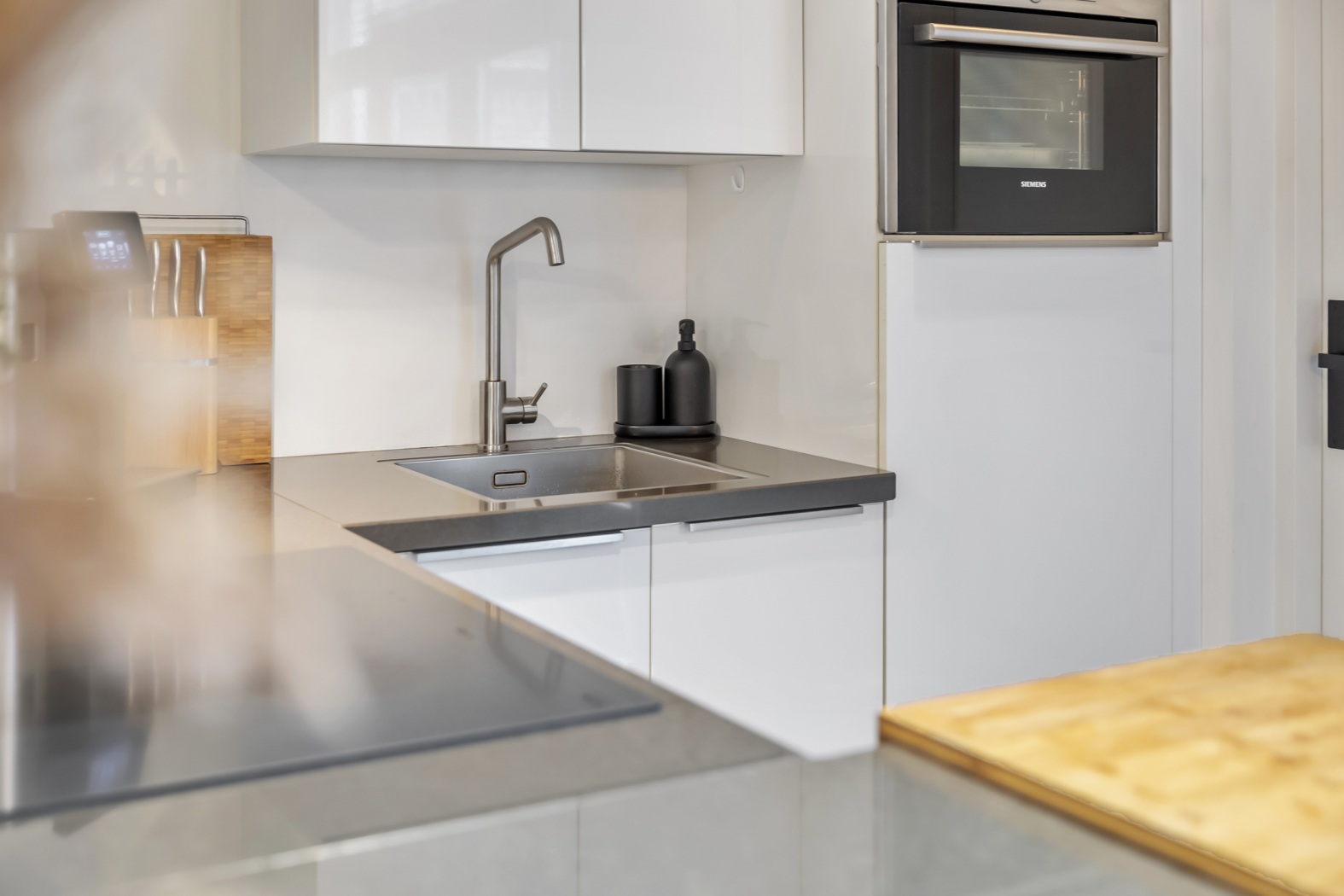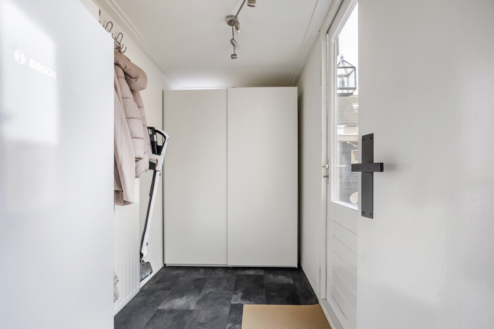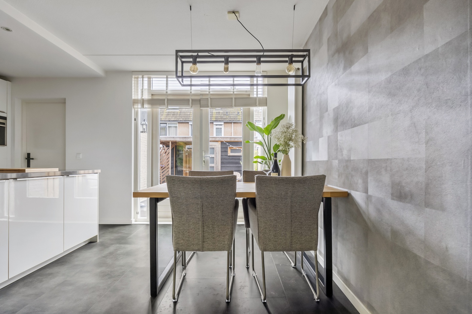 De woonkamer loopt vloeiend over in het eetgedeelte en de moderne keuken. Het doorlopende werkblad creëert een natuurlijke verbinding tussen koken en tafelen — perfect voor wie houdt van gezelligheid tijdens het koken. De keuken is uitgerust met inbouwapparatuur en heeft een moderne, tijdloze uitstraling. Achter de keuken bevindt zich de bijkeuken, ideaal als extra opslagruimte, met plek voor een extra vriezer en een praktische doorgang naar de tuin.
