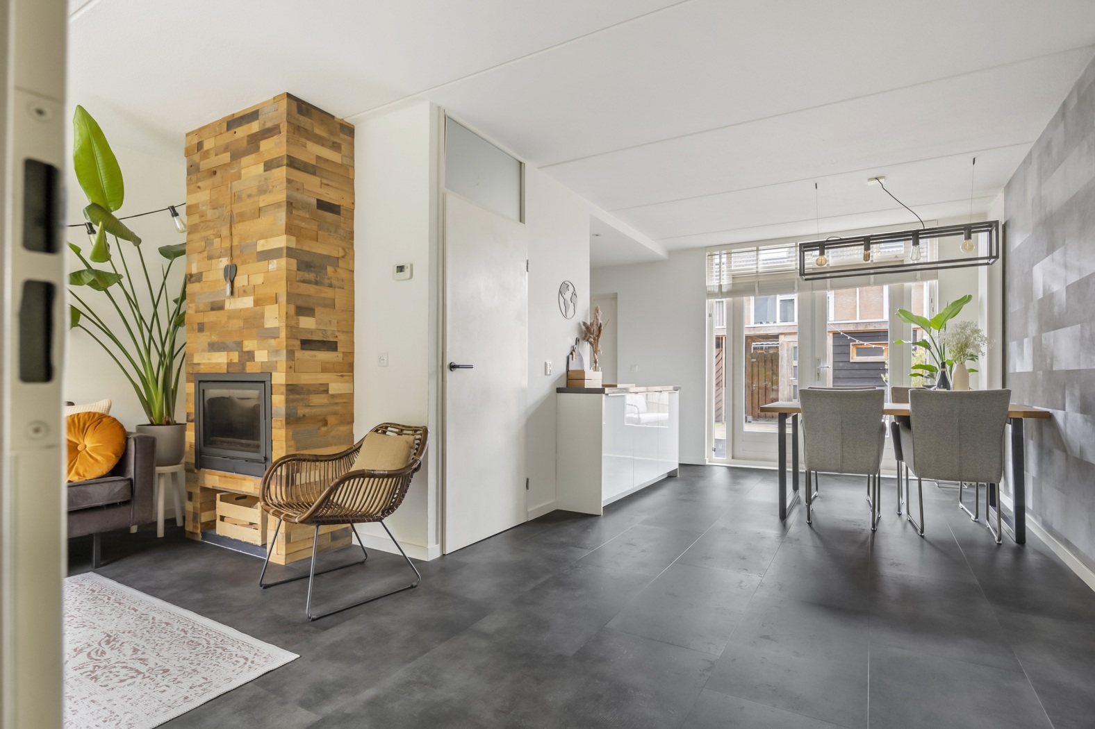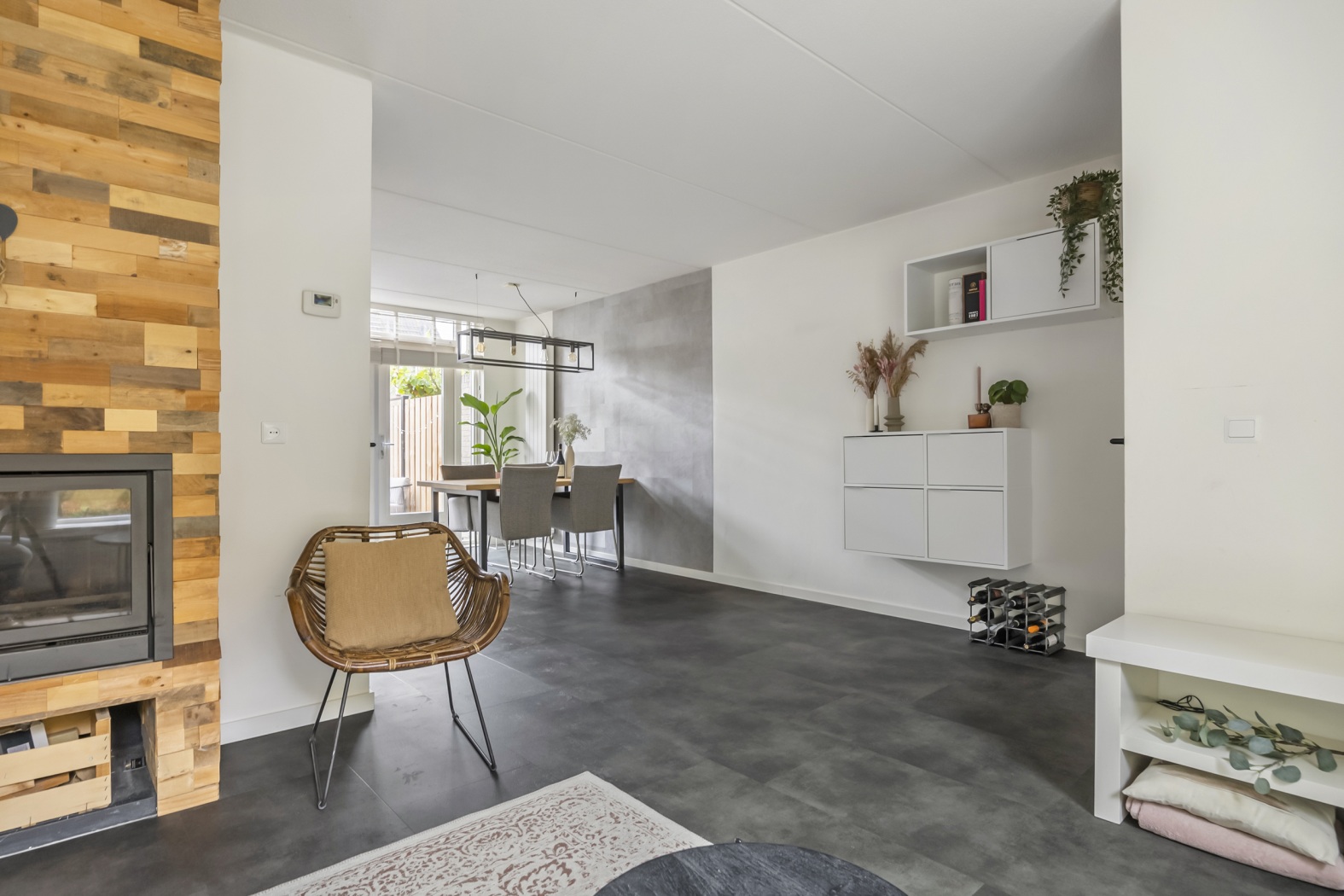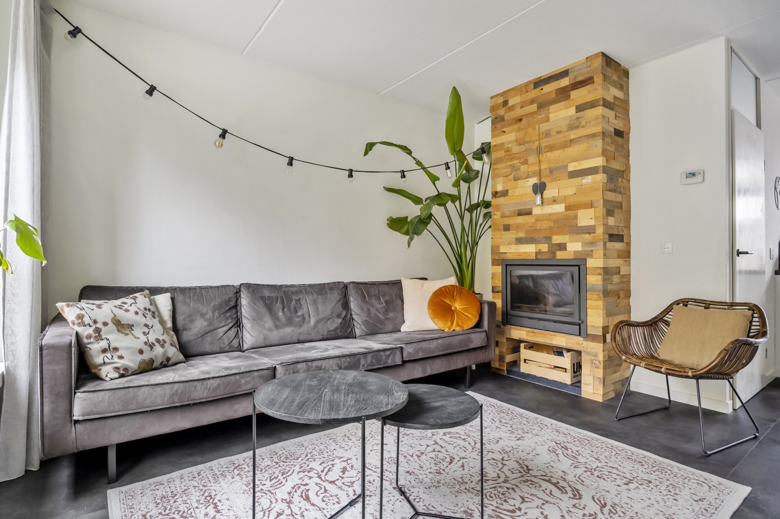 De voortuin is verzorgd en sfeervol aangelegd, waardoor de woning direct een uitnodigende indruk maakt. Via de hal stap je de gezellige woonkamer binnen — een lichte, prettige ruimte waar de houtkachel meteen zorgt voor warmte en sfeer. Grote ramen aan de voorzijde en openslaande deuren naar de tuin zorgen de hele dag door voor een prachtige lichtinval.
