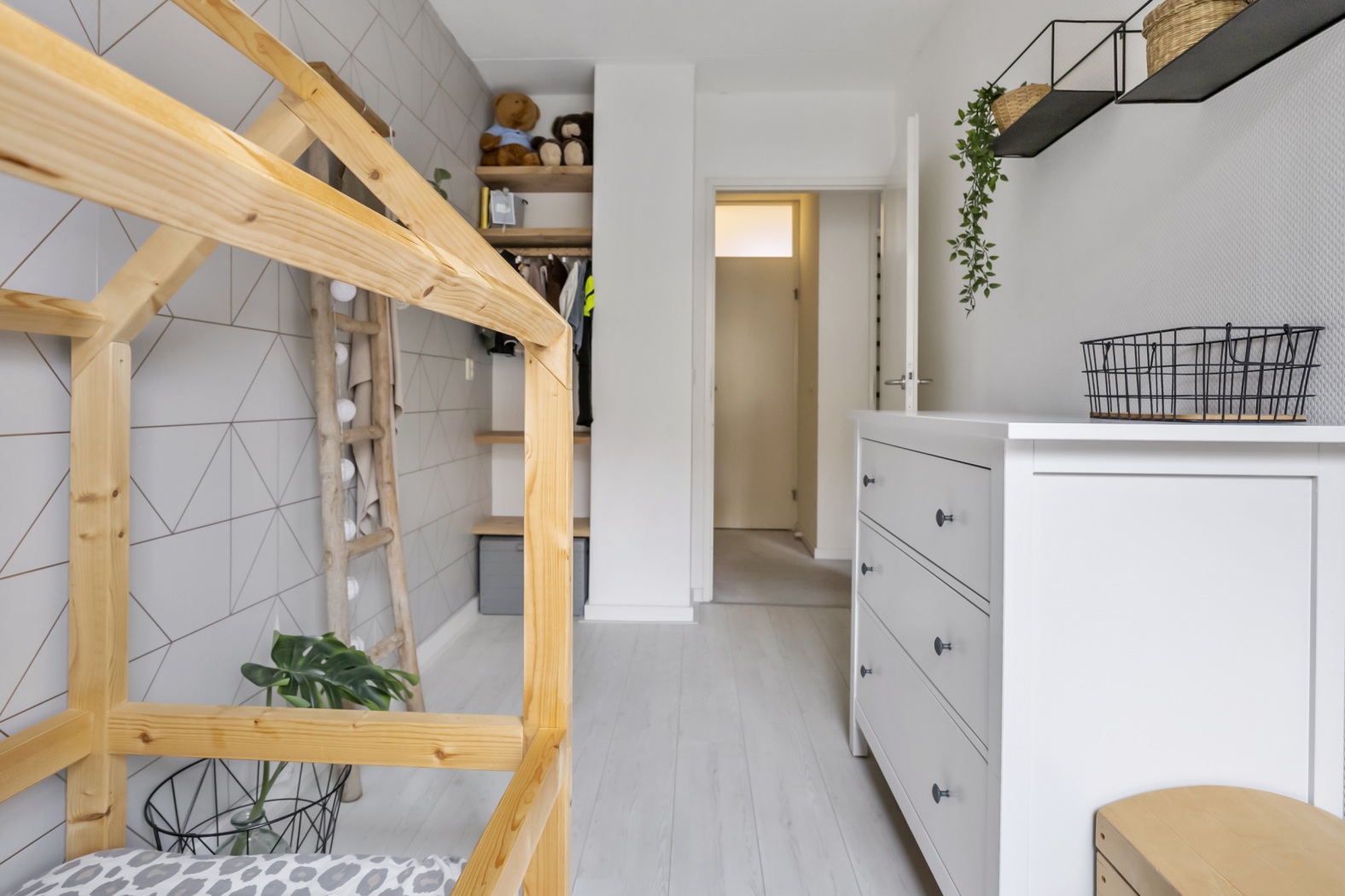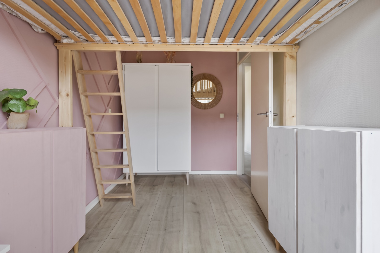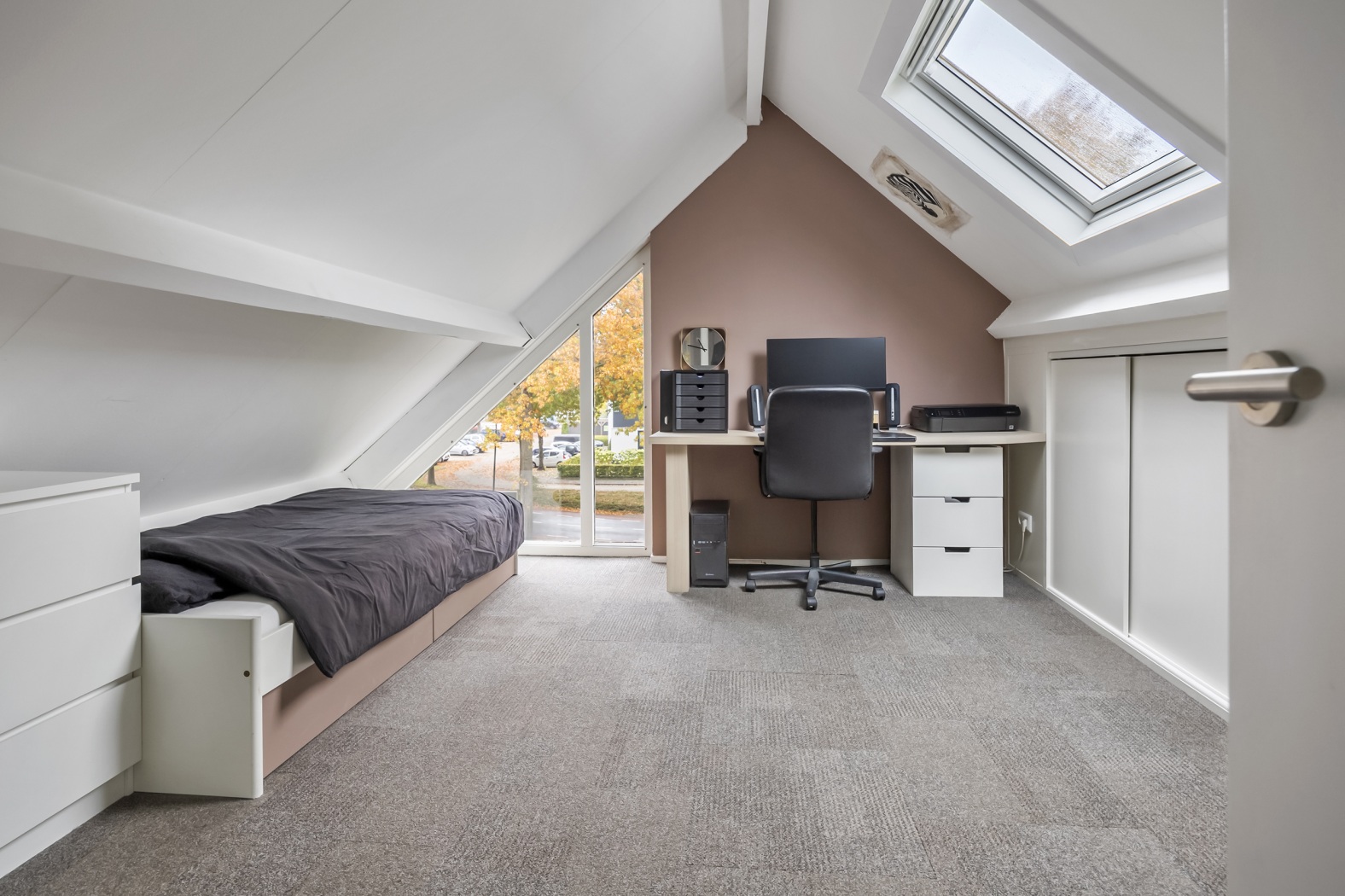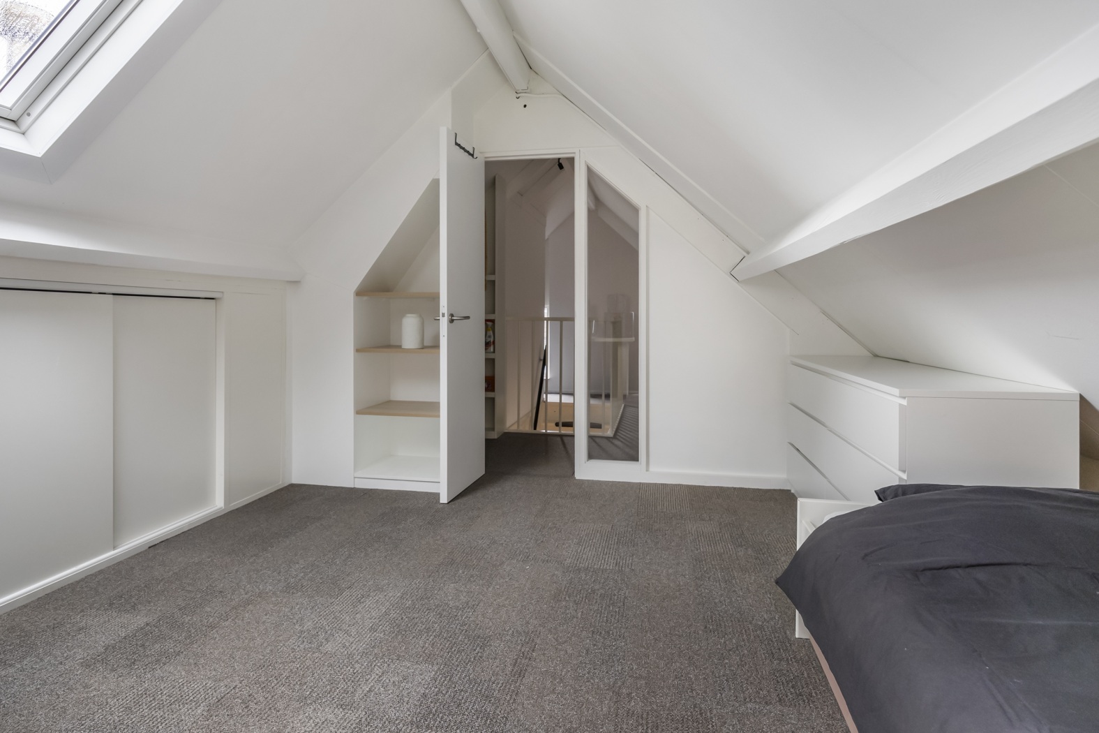 De tweede verdieping biedt een verrassend ruime vierde slaapkamer, met volop opbergruimte en mogelijkheden. De kamer heeft een dakraam en een speels gevelraam, waardoor er veel licht binnenvalt.