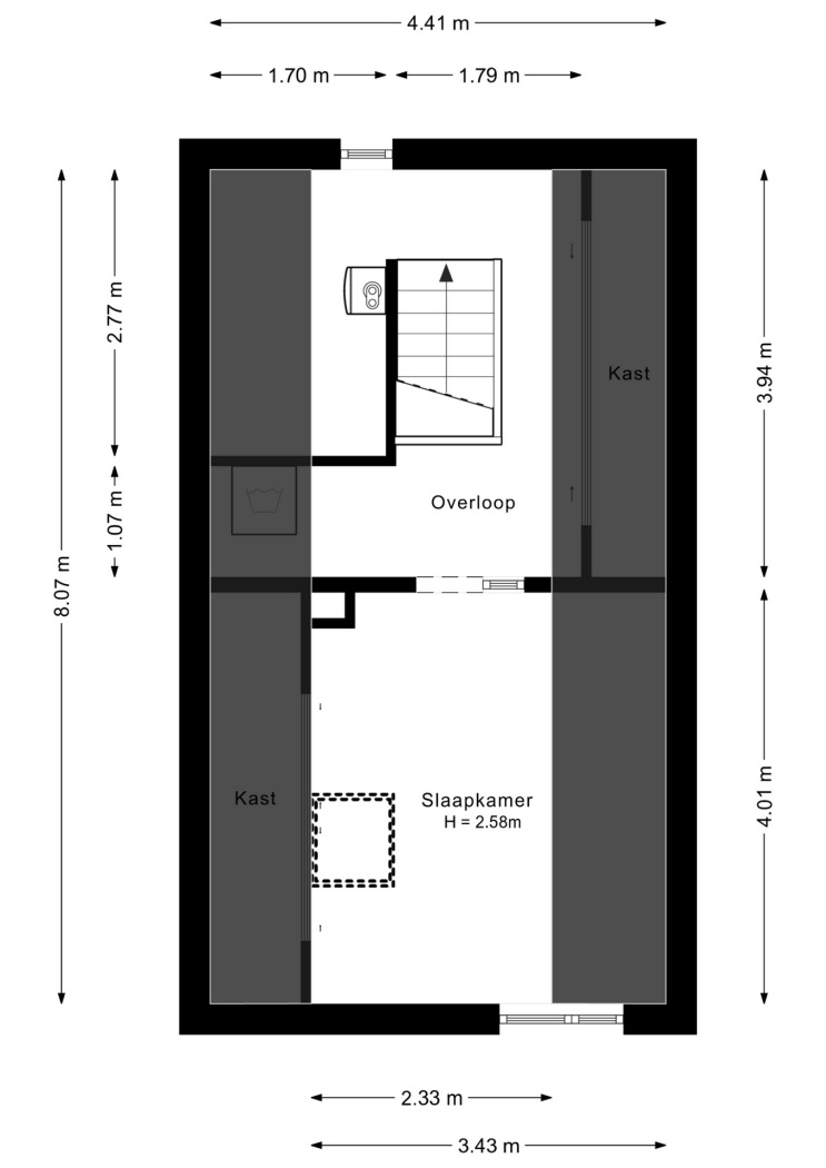 Op de overloop vind je ruimte voor de wasapparatuur en de cv-installatie. De zolderkamer is ideaal als logeerkamer, tienerkamer of thuiswerkplek. Ook hier is gedacht aan comfort, met goede isolatie en een nette afwerking.