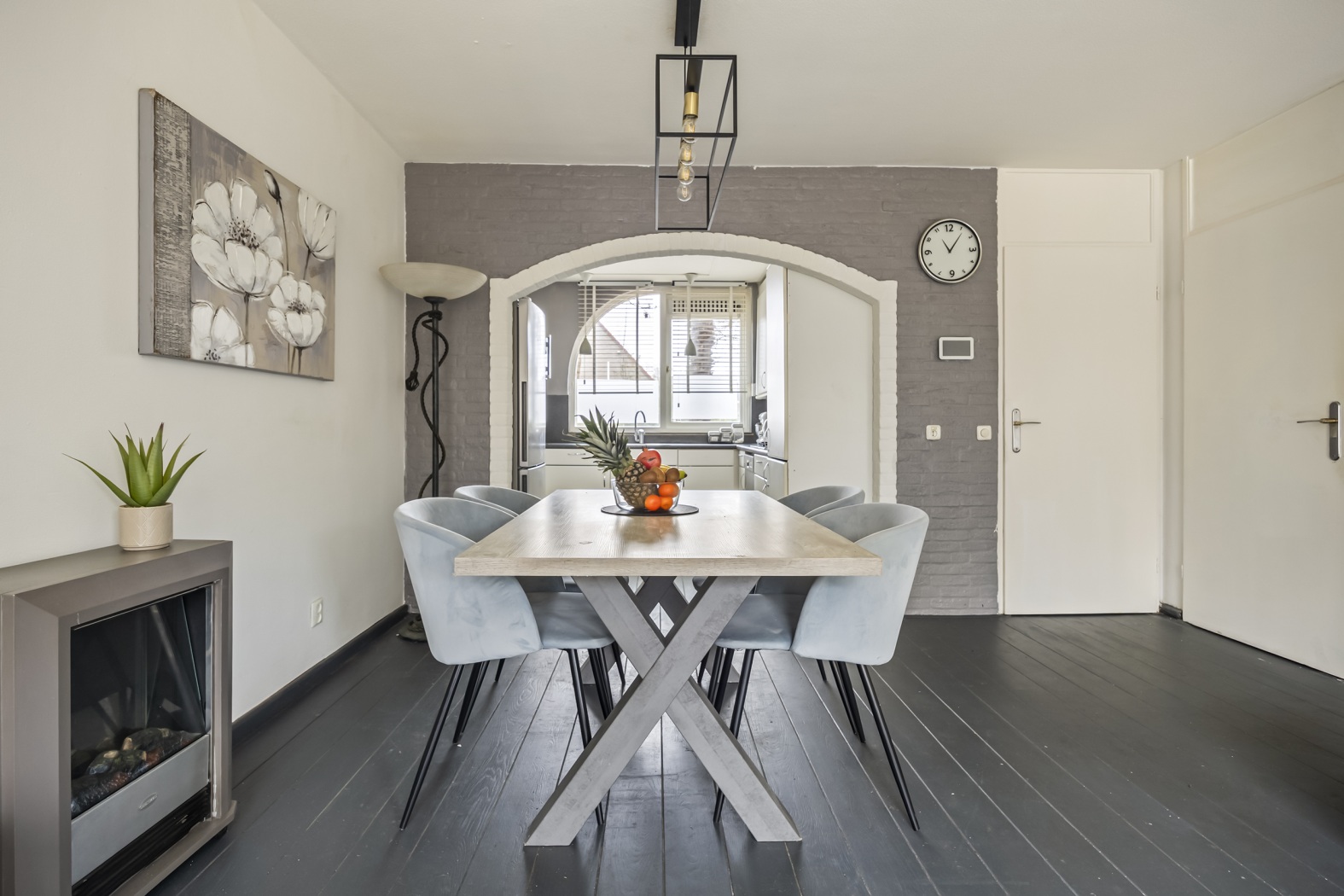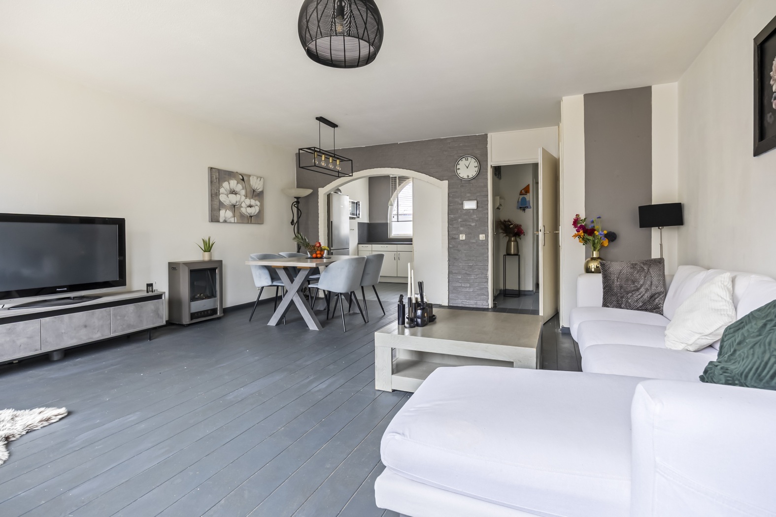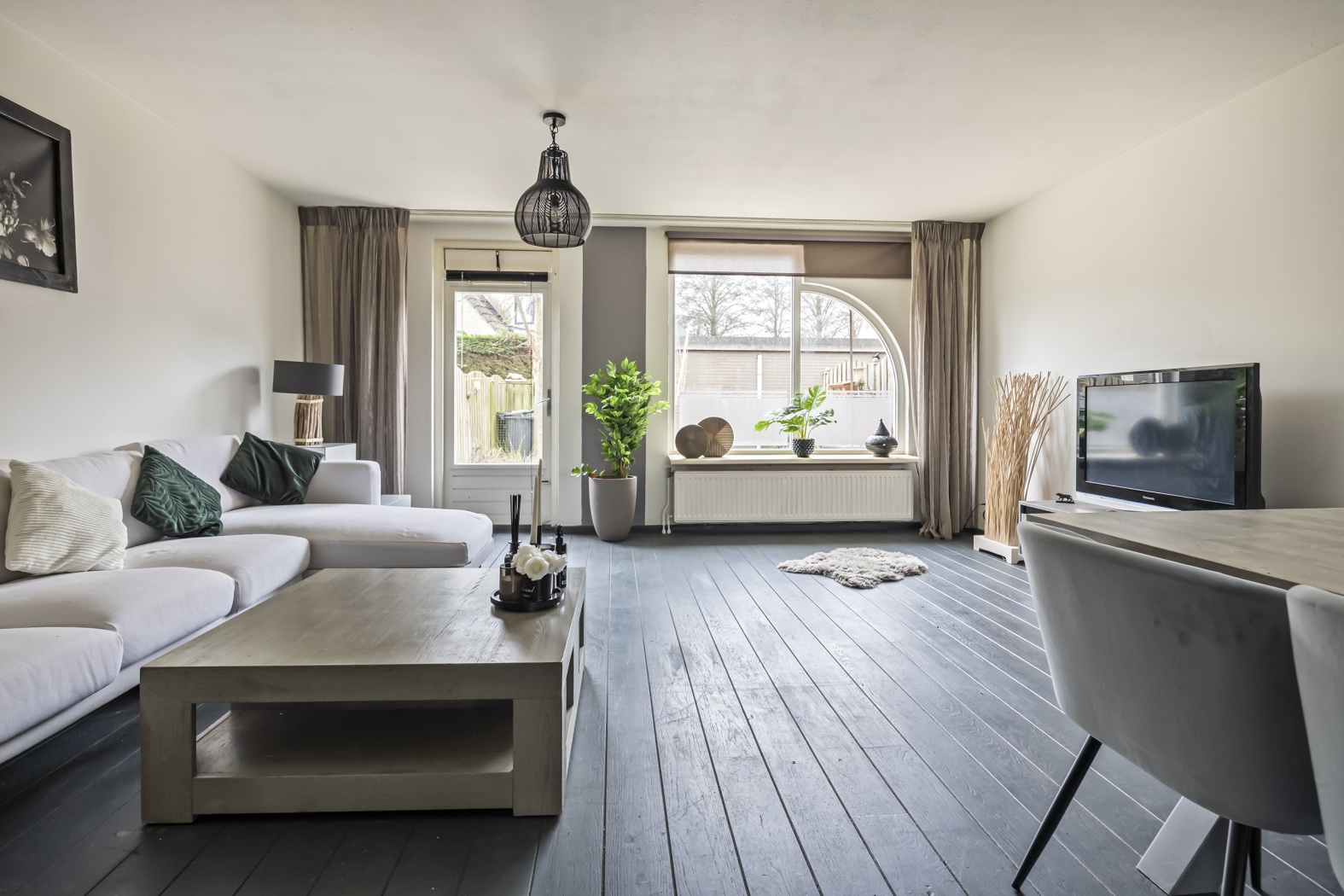 Bij binnenkomst valt direct de ruime en lichte woonkamer op. Dankzij de grote raampartijen – met als leuk en speels detail de half afgeronde ramen aan zowel de voor- als achterzijde, heeft de ruimte een eigen karakter en een prettige lichtinval. Er is volop plek voor een gezellige zithoek en een royale eettafel.
