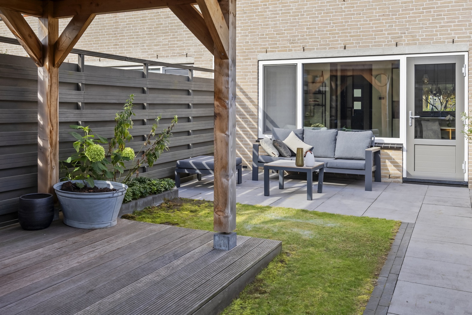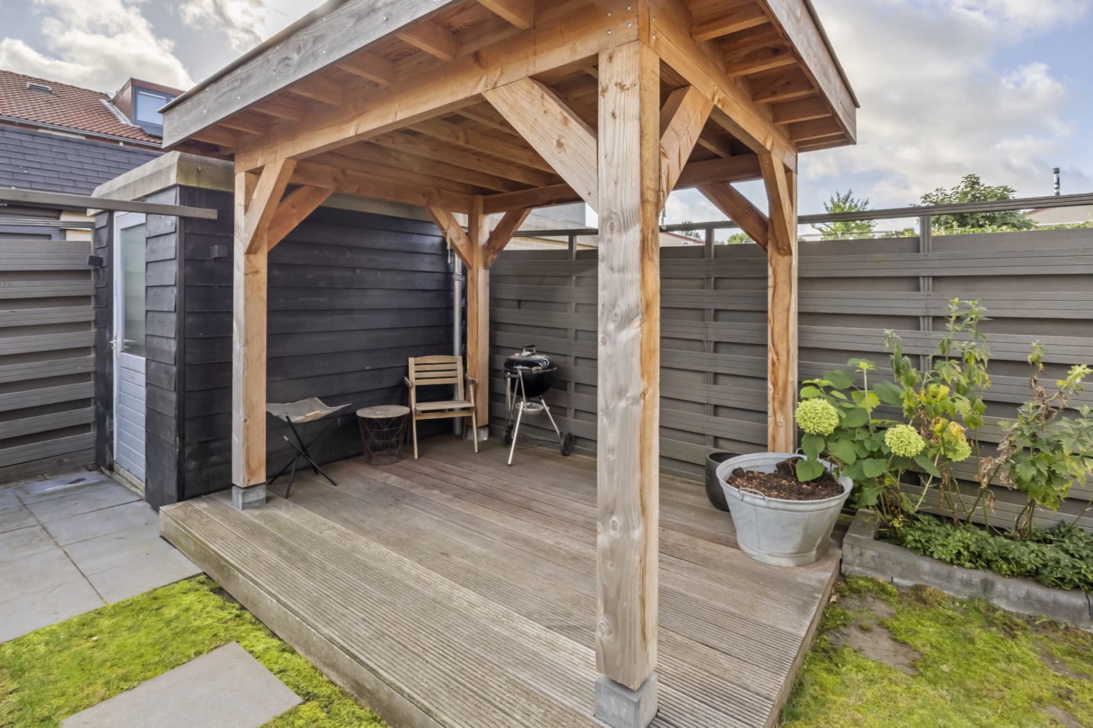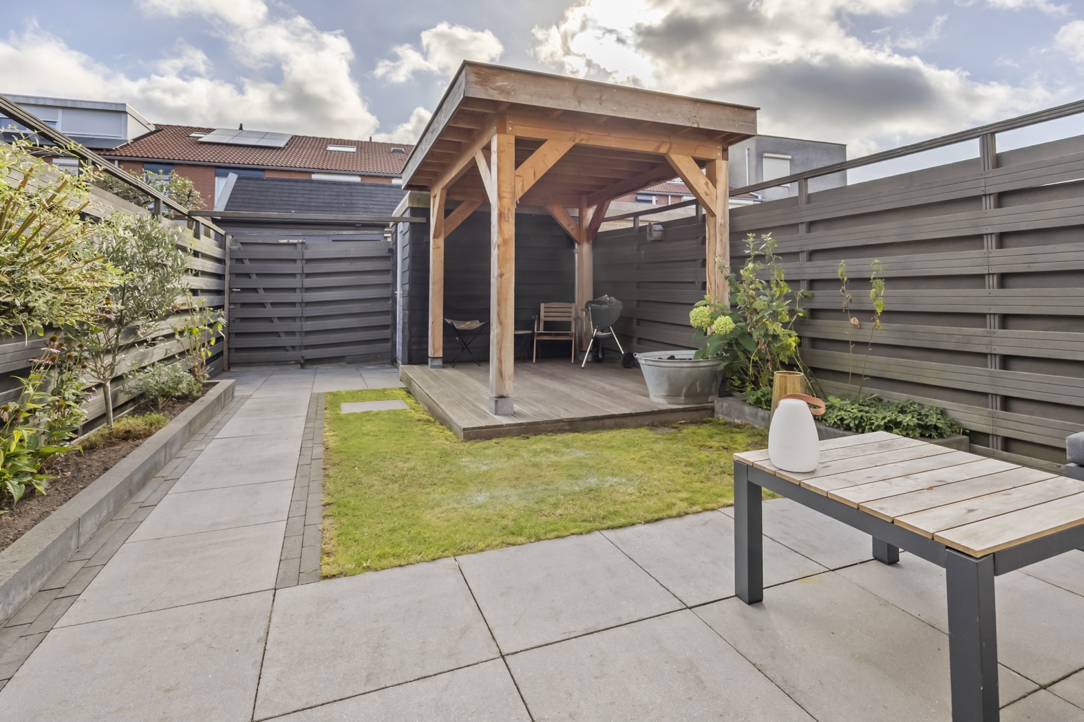 -Verzorgde achtertuin met overkapping, berging en achterom