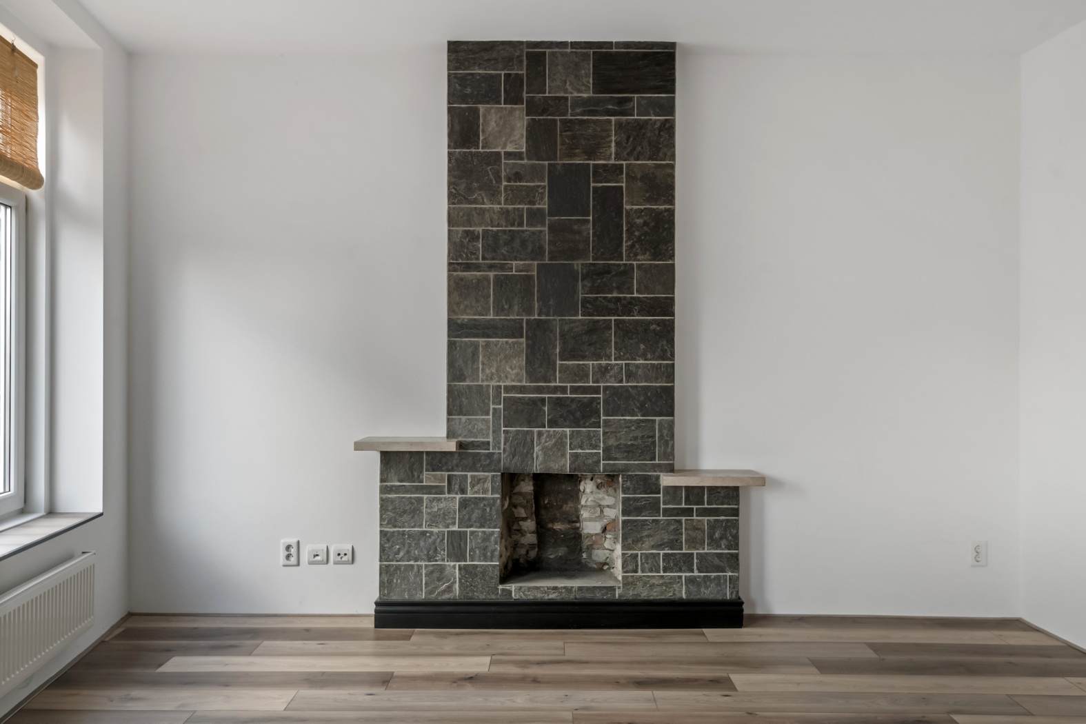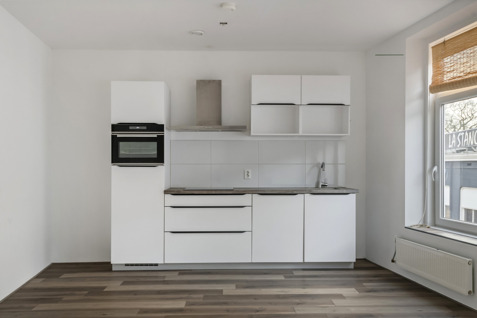 De woonkamer van 27 m² is een heerlijk lichte en uitnodigende ruimte, mede dankzij de drie royale ramen. De decoratieve leisteen sfeerhaard geeft het geheel een warme uitstraling — gezelligheid zónder gedoe met hout, rook of as. De keuken, uitgevoerd met lichte fronten, staat in een praktische rechte opstelling en is uitgerust met alles wat je nodig hebt: een inductiekookplaat, afzuigkap, koelkast, vaatwasser en combi-oven. Koken wordt hier bijna vanzelf leuk of in elk geval een stuk makkelijker om overtuigend te doen alsof je een hobbychef bent.