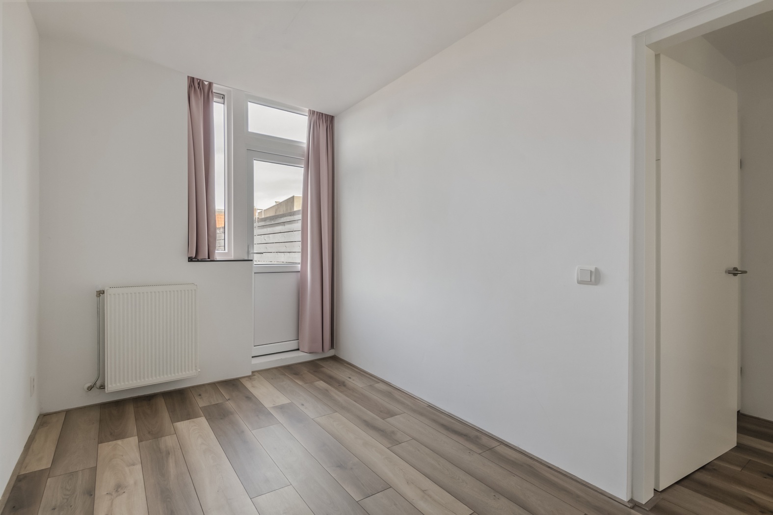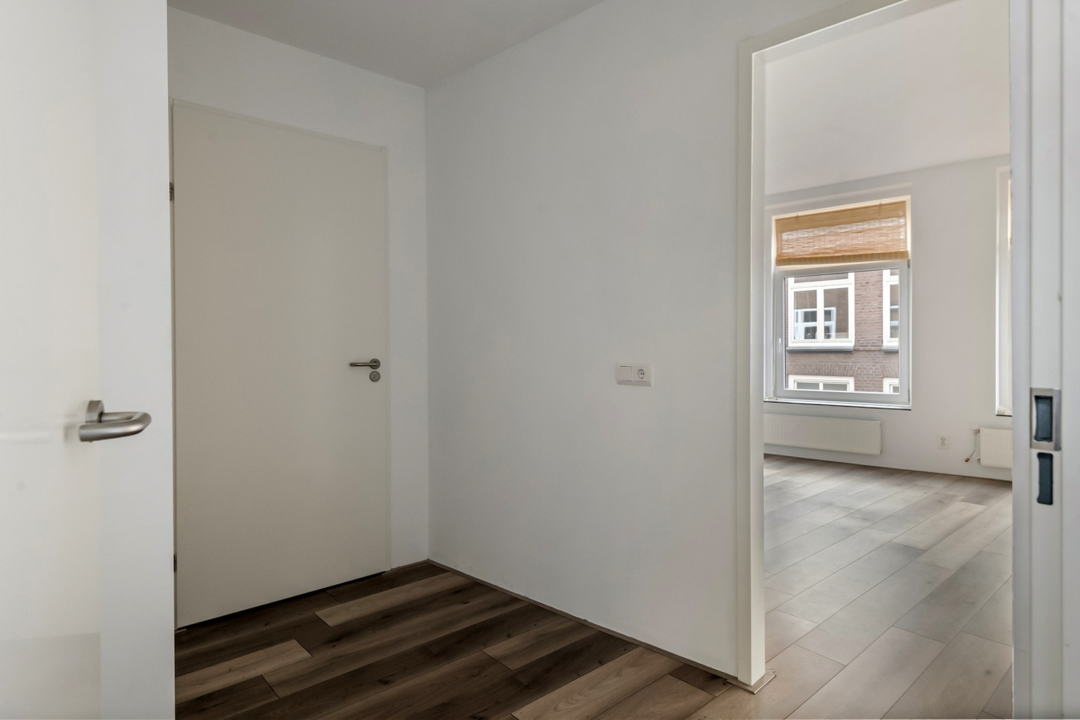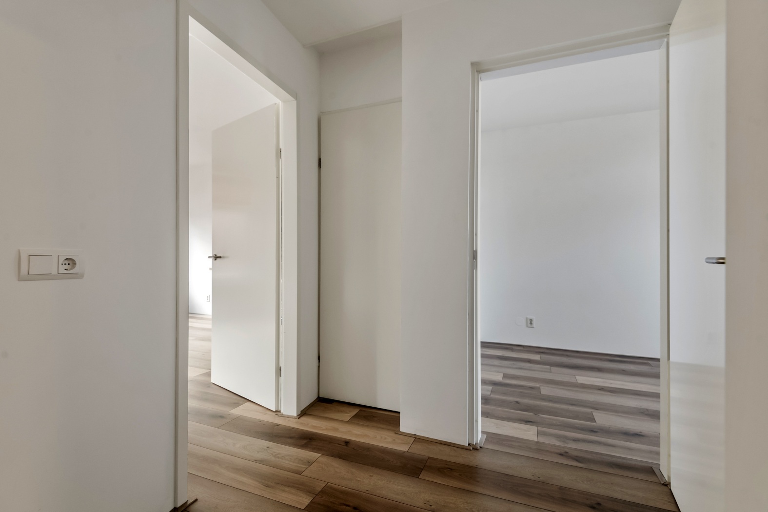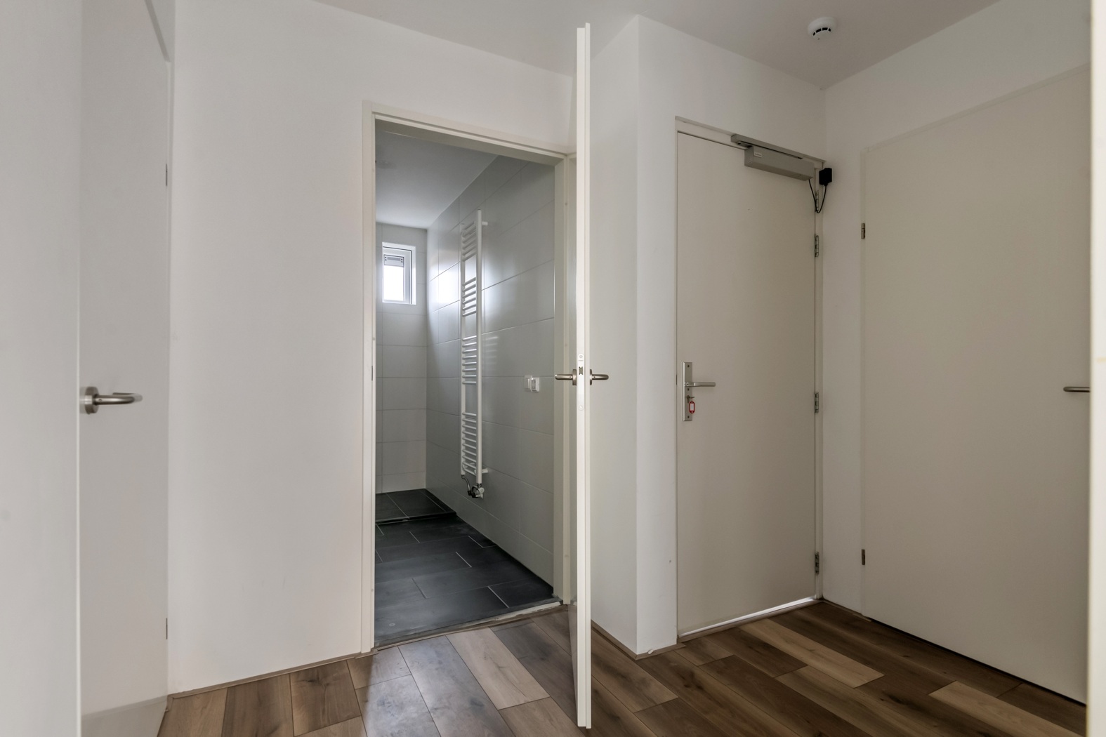 Bij binnenkomst word je verwelkomd door een nette, frisse hal die toegang biedt tot alle vertrekken. Dankzij de strak afgewerkte laminaatvloer voelt het appartement meteen rustig, ruimtelijk en helemaal in balans — alsof de kamers het onderling gewoon goed met elkaar kunnen vinden.