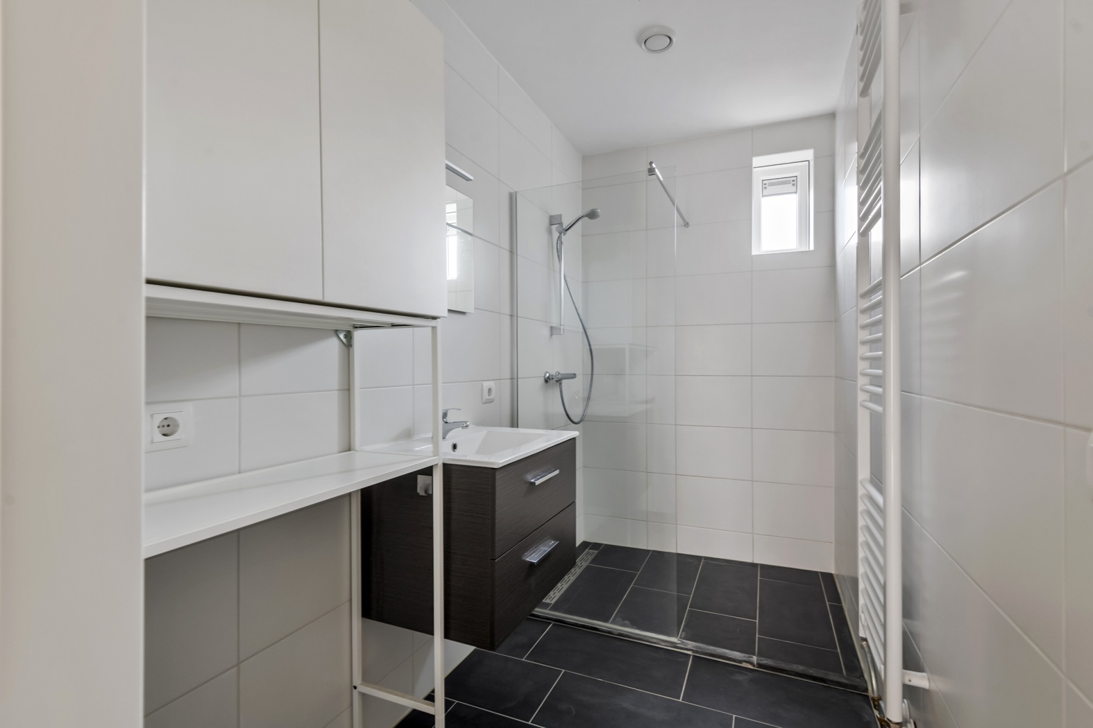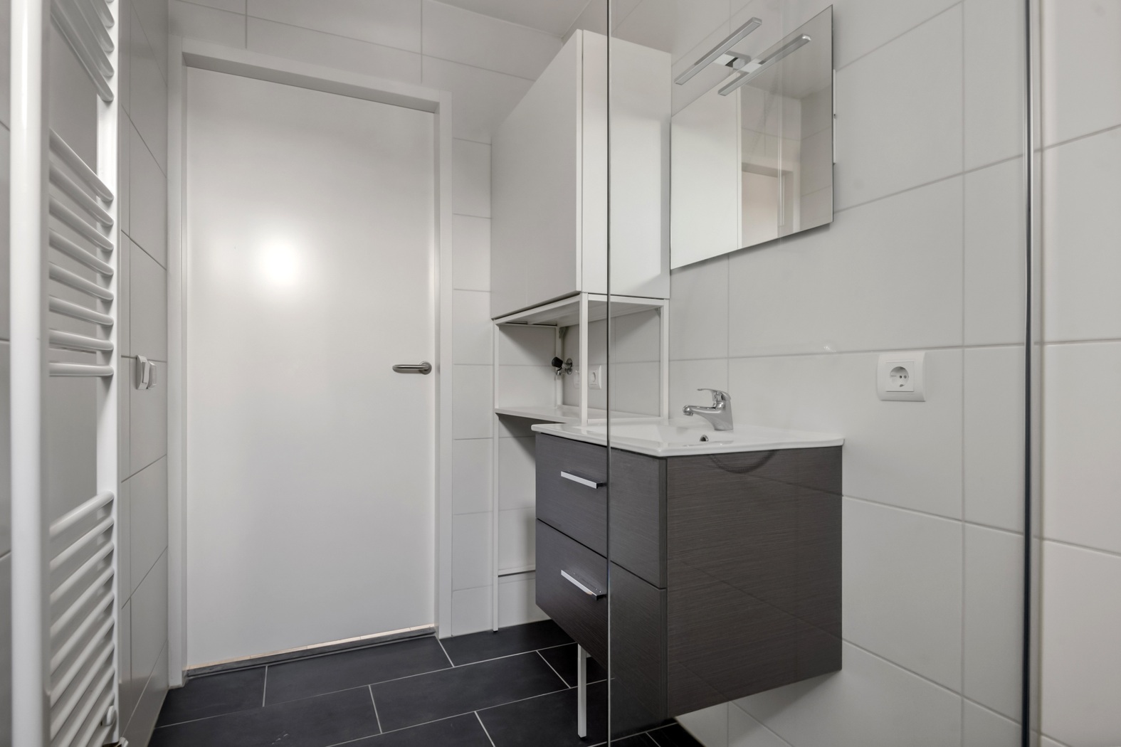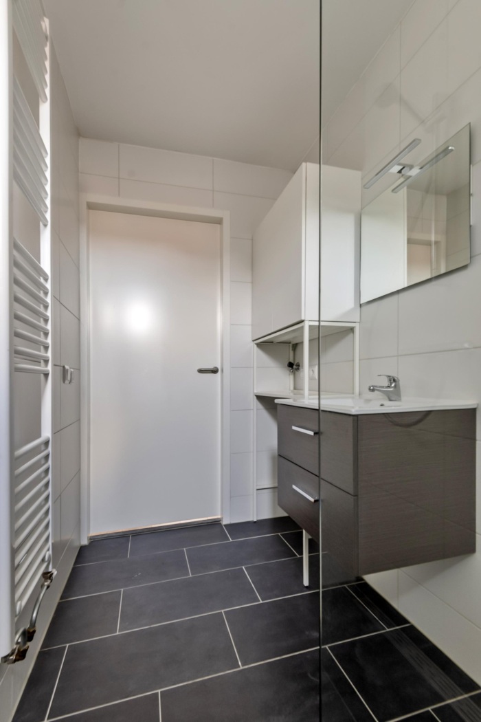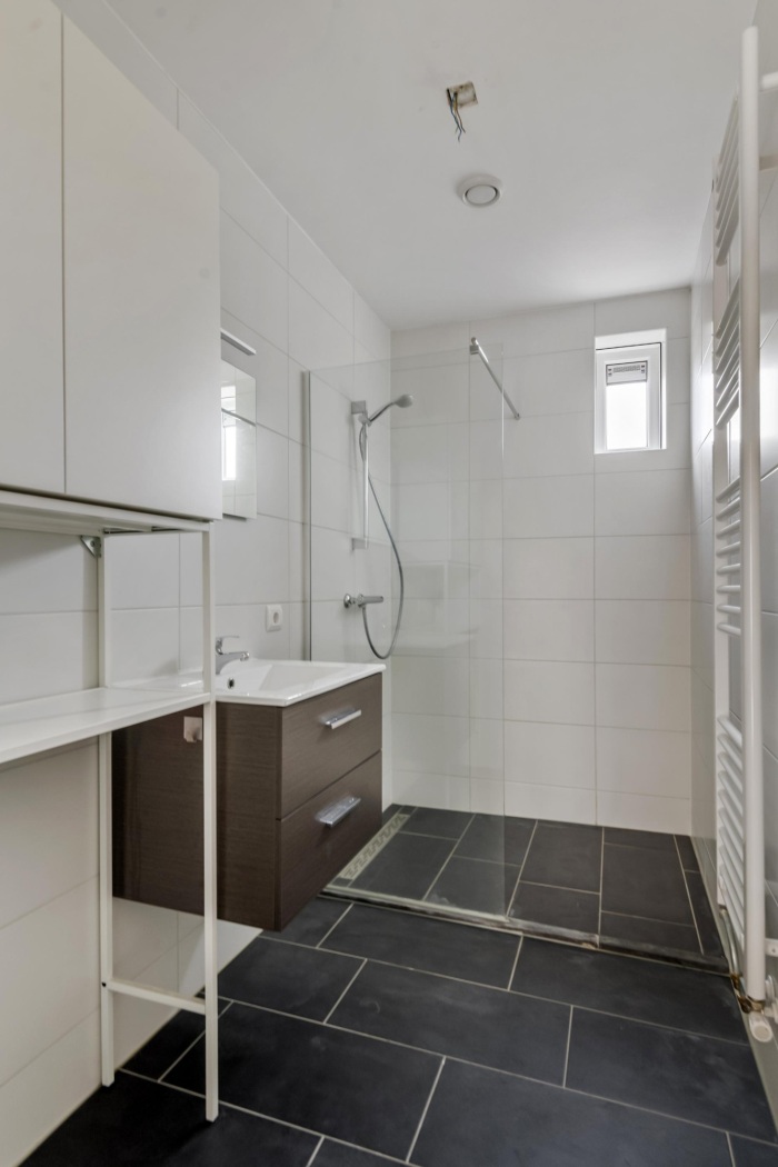 De badkamer (ca. 4 m²) is fris, modern en volledig betegeld met strakke witte wanden en een donkere vloer voor een stijlvolle luxe uitstraling. Je vindt er een ruime inloopdouche, een netjes afgewerkt badkamermeubel met spiegel én een praktische plek voor de wasmachine. De designradiator zorgt ervoor dat je handdoeken altijd lekker warm zijn — pure verwennerij na het douchen.
