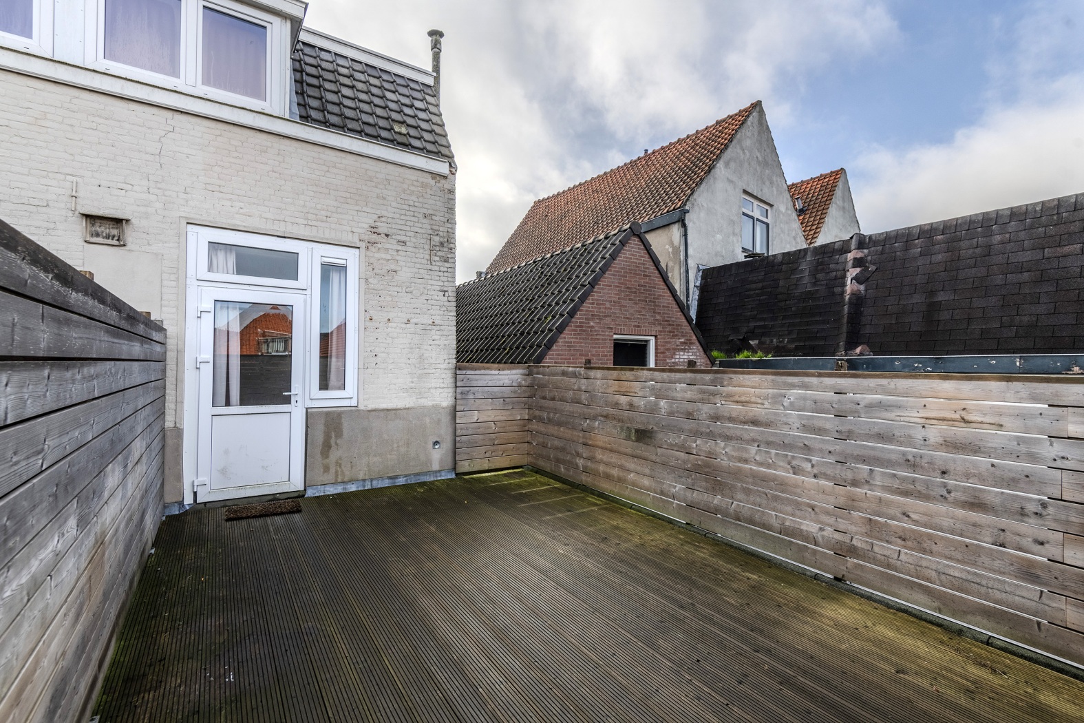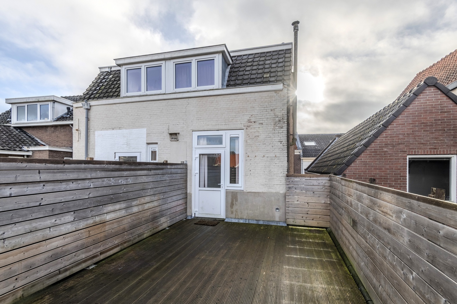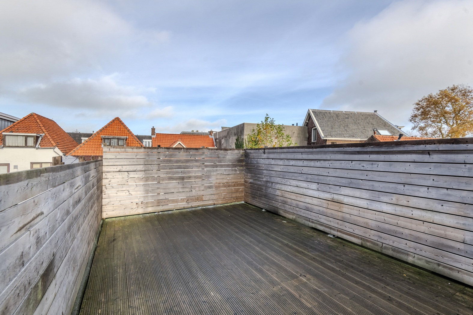 De slaapkamer van 9,5 m² ligt aan de rustige achterzijde en voelt direct comfortabel en knus. Via de deur stap je zo het grote dakterras van 26 m² op. Met schuttingen rondom en vlonders op de vloer is dit de perfecte basis om je eigen buitenparadijs te maken — van loungeset tot plantenjungle: hier kun je al je creativiteit kwijt.