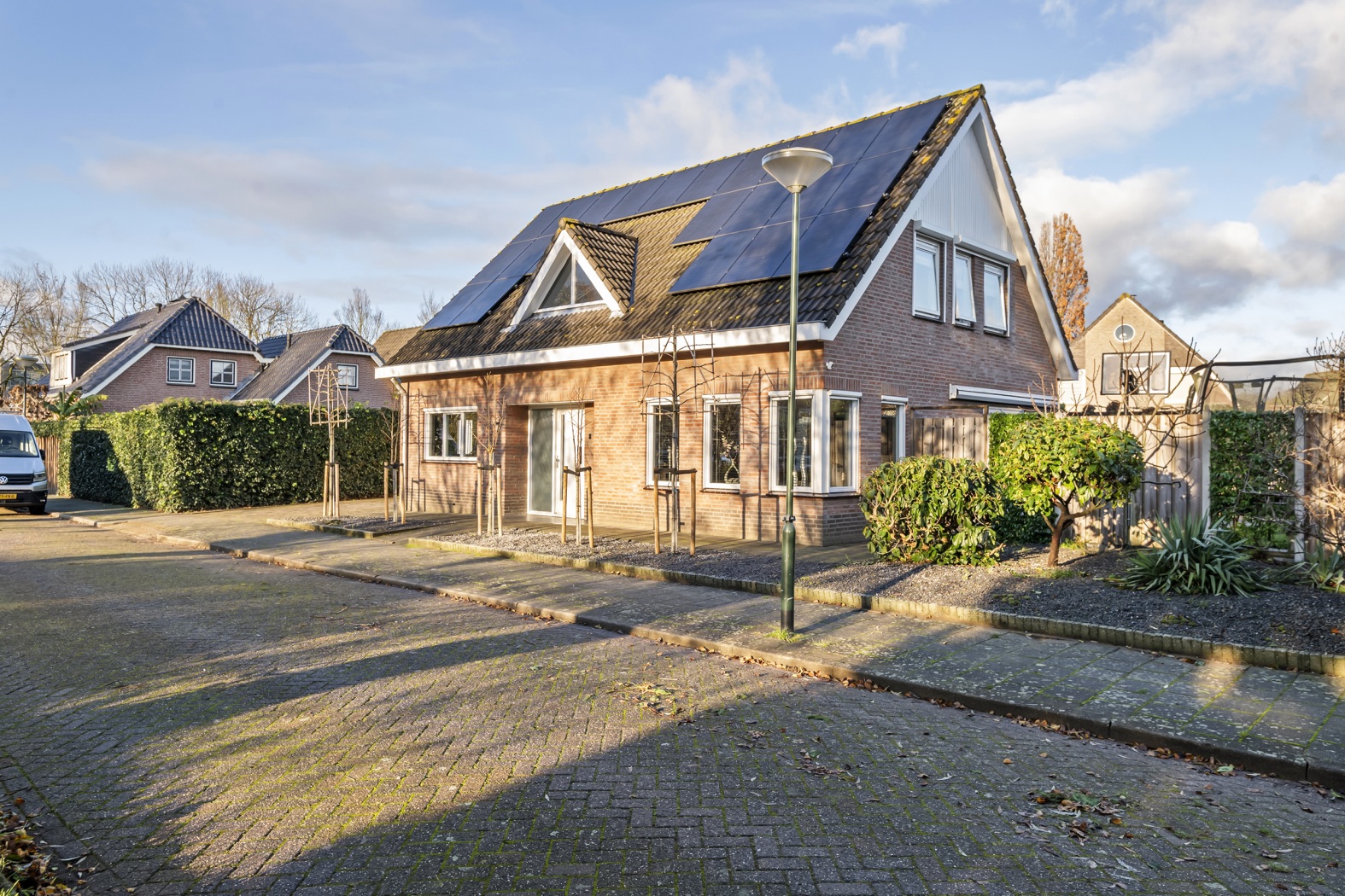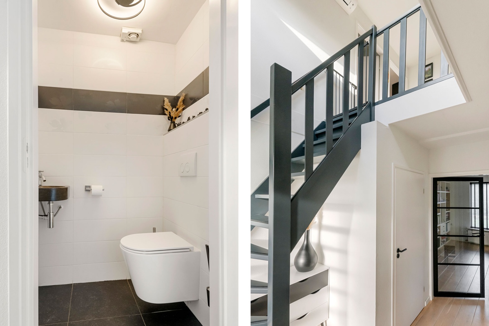 Aan de voorzijde oogt de woning meteen vriendelijk, met charmante leibomen, een verzorgde voortuin en een oprit naar de garage. Het driehoekige detail in het dak verraadt al de prachtige vide binnen, die de hal en de verdieping met elkaar verbindt. Bij binnenkomst in de royale entree heb je direct toegang tot de toiletruimte, de meterkast, de trap naar de eerste verdieping én via een stijlvolle taatsdeur tot de woonkamer. Een warm welkom dat nieuwsgierig maakt naar de rest van het huis.