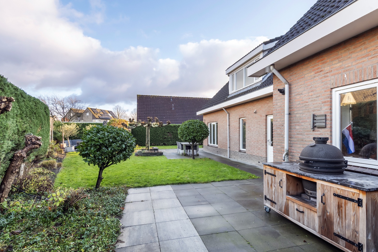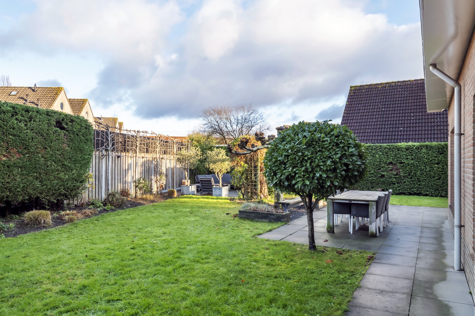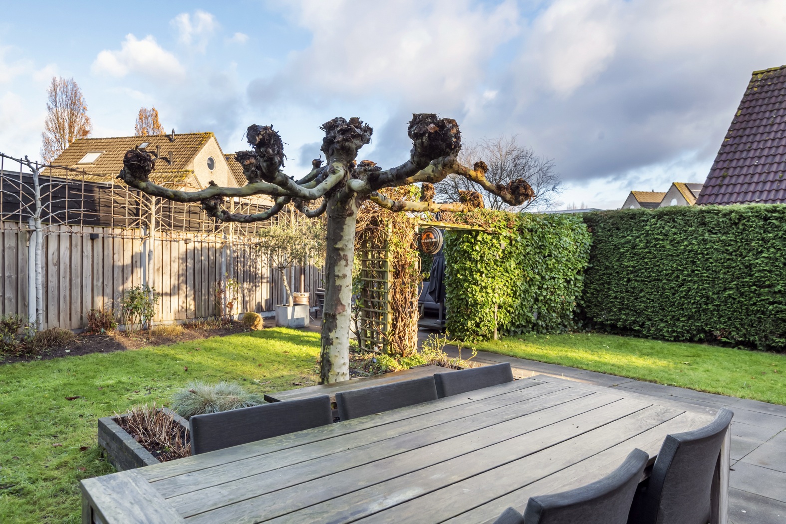 Op het royale perceel van 530 m² ligt een fraai aangelegde tuin die uitnodigt om volop van het buitenleven te genieten. Het groene gazon, de verzorgde plantenborders en de prachtige dakplataan vormen samen een sfeervol geheel. Aan de achterzijde zorgen leibomen en hoge coniferenhagen voor optimale privacy, waardoor de tuin aanvoelt als een eigen, rustige wereld.