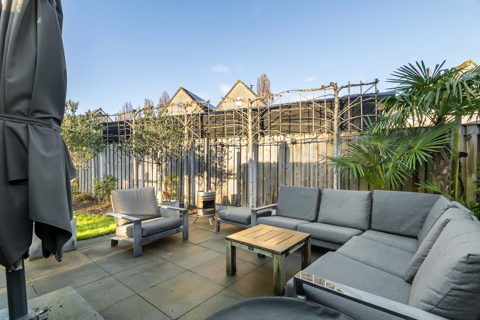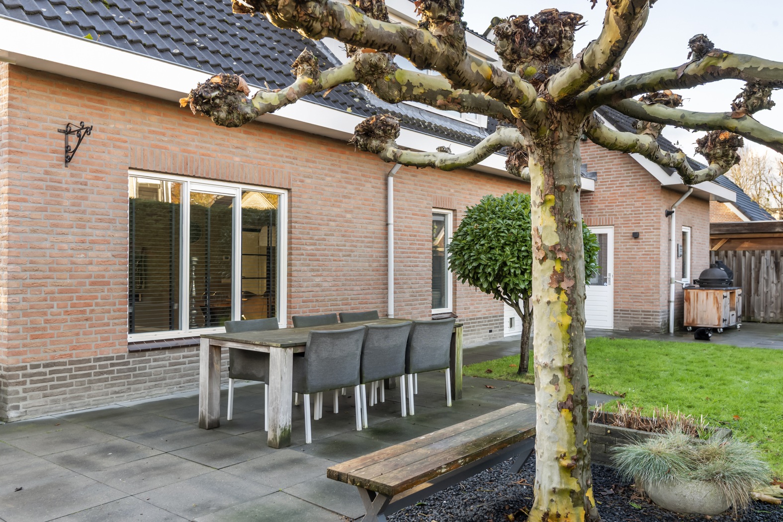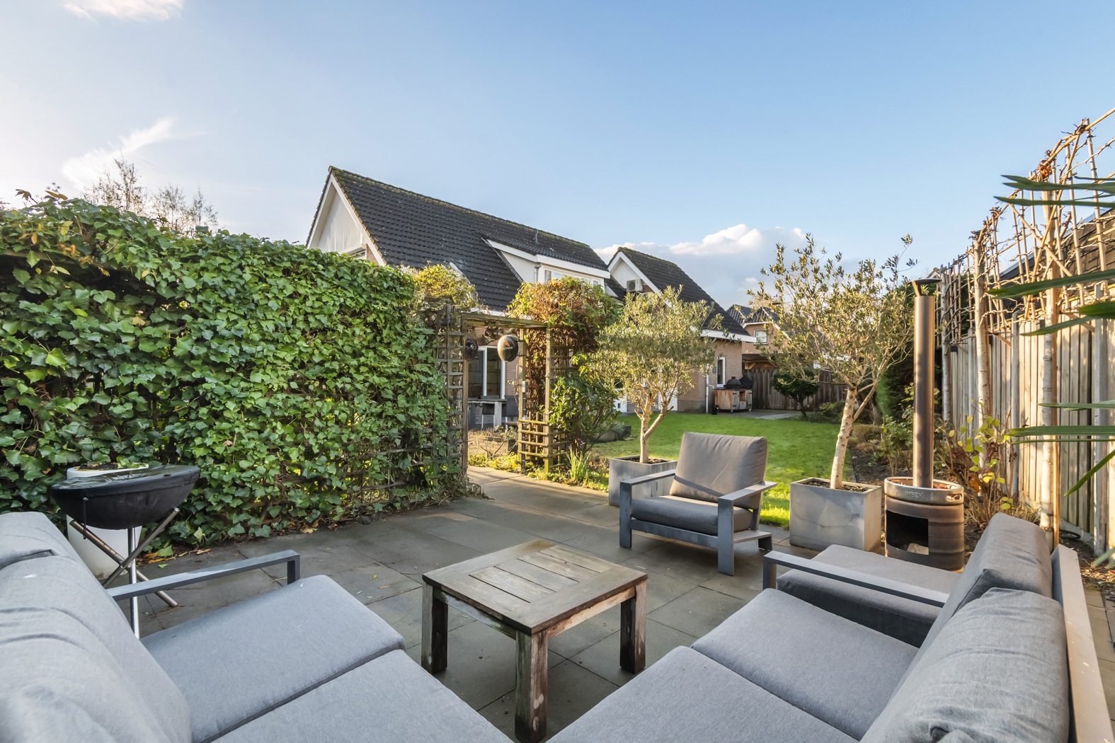 Op het royale perceel van 530 m² ligt een fraai aangelegde tuin die uitnodigt om volop van het buitenleven te genieten. Het groene gazon, de verzorgde plantenborders en de prachtige dakplataan vormen samen een sfeervol geheel. Aan de achterzijde zorgen leibomen en hoge coniferenhagen voor optimale privacy, waardoor de tuin aanvoelt als een eigen, rustige wereld.
