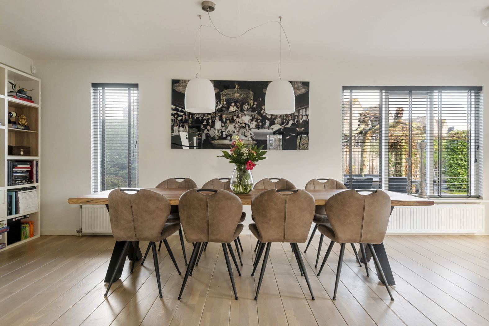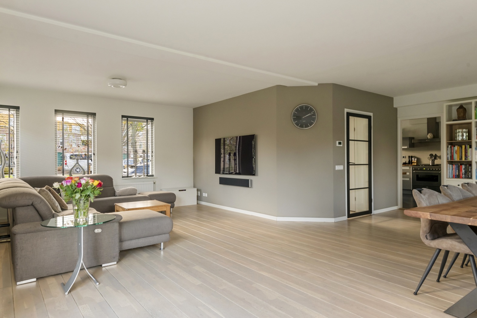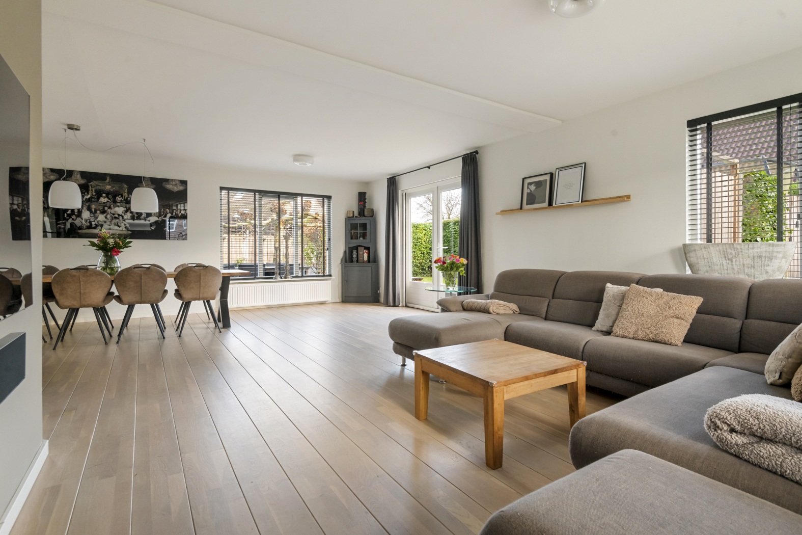 Deze woning beschikt over een heerlijke, lichte woonkamer van 49 m². Aan de voorzijde bevindt zich een sfeervol zitgedeelte met meerdere ramen én een mooi hoekraam, waardoor de ruimte baadt in het daglicht. Aan de tuinzijde openen dubbele deuren naar buiten en is er volop plek voor een grote, gezellige eettafel. Ook hier zorgen de fraaie lichtramen voor een prettig uitzicht op de tuin. De mooie houten vloerdelen geven de woonkamer een warme, luxe uitstraling en maken het geheel helemaal af.