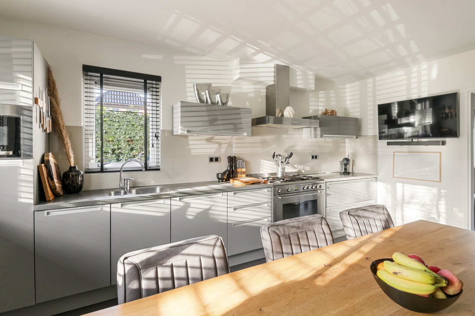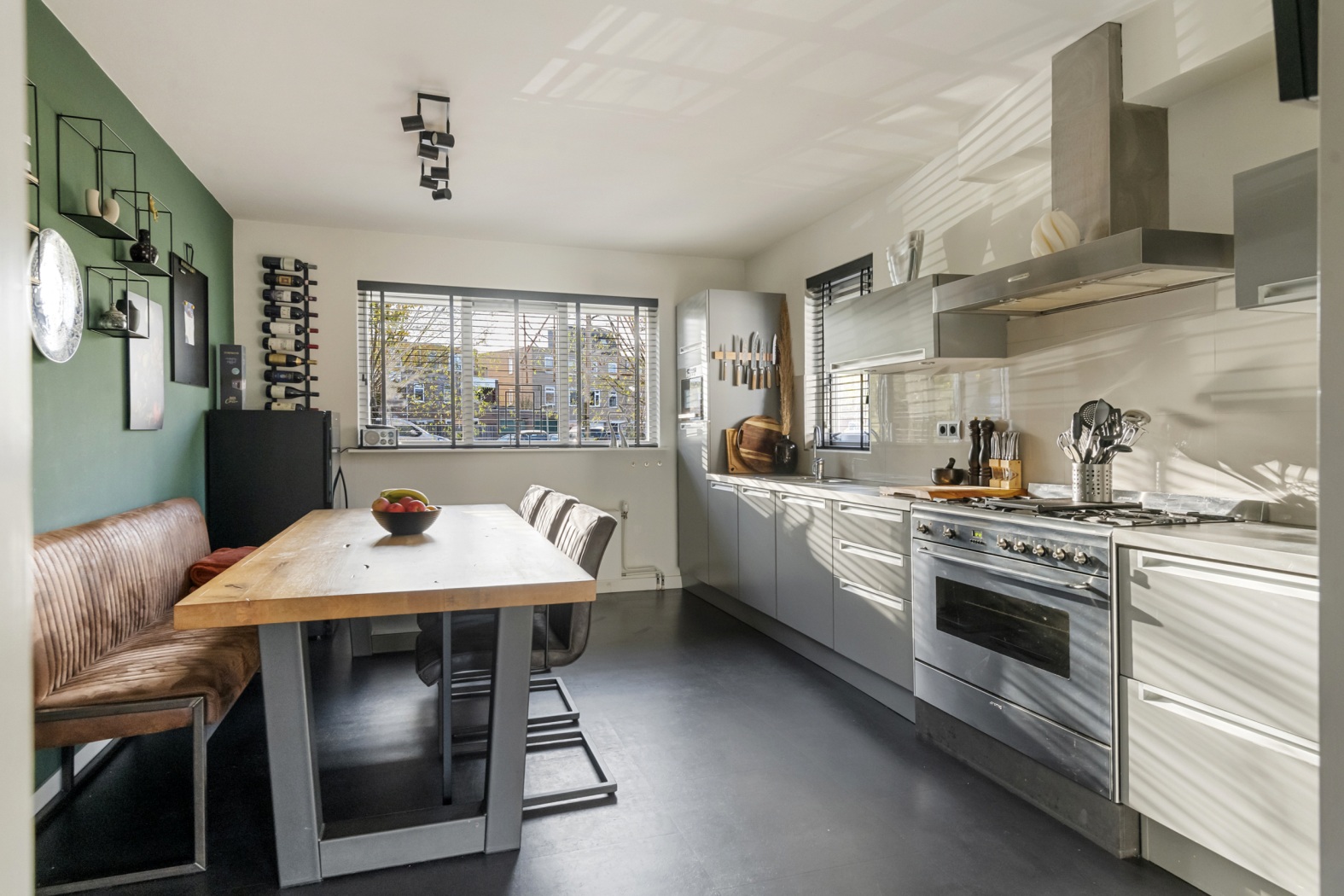Vanuit de woonkamer stap je de dichte leefkeuken binnen. Dankzij het raam aan de voorzijde én het raam met zicht op de oprit is dit een heerlijk lichte ruimte. Het is een échte woonkeuken: een rechte keukenopstelling met volop plek voor een royale eettafel, perfect te combineren met een gezellige eetbank tegen de muur – zo’n plek waar je spontaan langer blijft zitten omdat het zó knus voelt. De keuken is uitgerust met een 5-pits Smeg fornuis met oven, afzuigkap, vaatwasser, koelkast en magnetron – volledig ingericht voor zowel het snelle ontbijtje als het lange, bourgondische diner.
