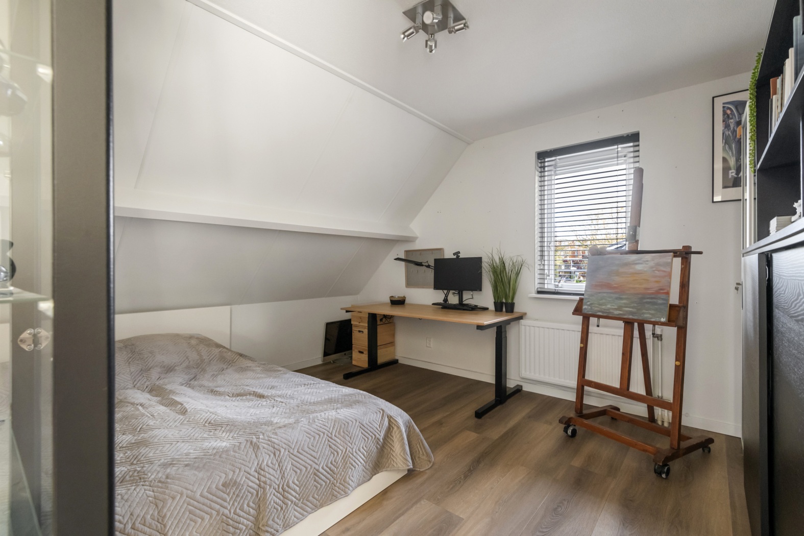 Op de verdieping liggen vier nette slaapkamers, waaronder een master met eigen kleedkamer (óf vijfde kamer, als je minder kleding hebt dan je dacht). De badkamer met dakkapel voelt als een kleine privé spa. Via de vlizotrap bereik je de bergzolder.