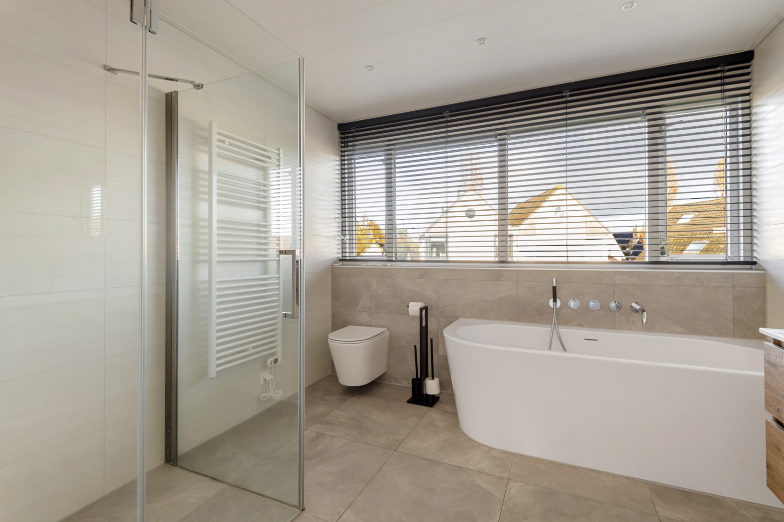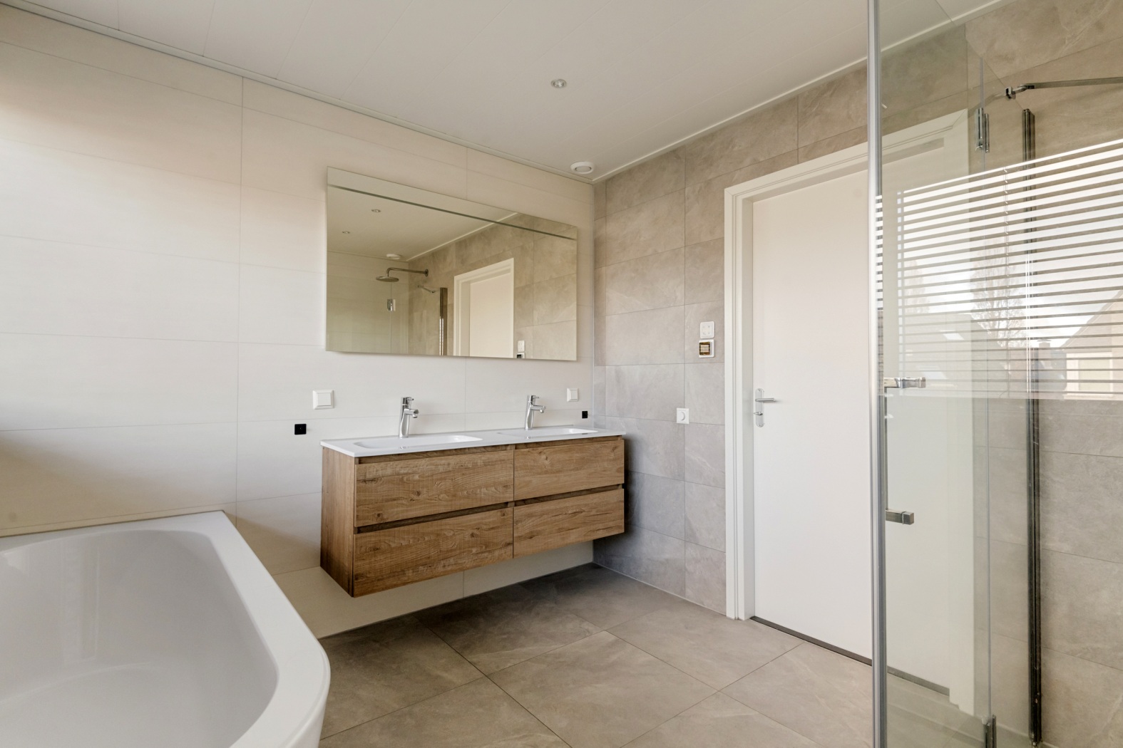 De moderne badkamer voelt als een klein relax paradijs, mede dankzij de dakkapel aan de achterzijde die extra licht en ruimte geeft. De badkamer is uitgerust met een dubbel wastafelmeubel met spiegel, een heerlijk ligbad met handdouche en ingebouwde wandkranen, een douchecabine, een tweede toilet en een elegante designradiator. Alles is afgewerkt in neutrale tegels, waardoor de ruimte tijdloos, fris en rustgevend aanvoelt — de perfecte plek voor een ontspannen start en afsluiting van je dag.