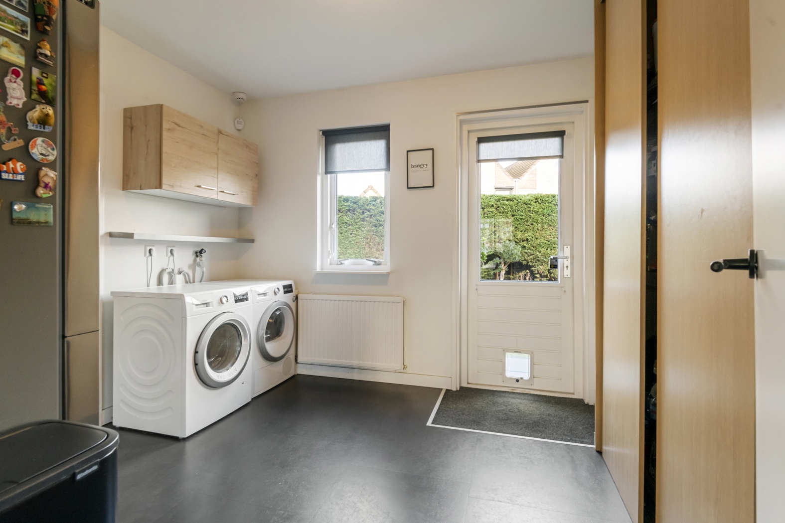 Aansluitend aan de leefkeuken bevindt zich de praktische én verrassend handige bijkeuken. Hier vind je de opstelplaats voor wasmachine en droger, een royale schuifwandkast en ruimte voor bijvoorbeeld een extra vriezer – ideaal voor gezinnen of kookliefhebbers. Met een deur naar de tuin én een binnendoor toegang tot de garage is dit een ruimte die het dagelijks leven echt makkelijker maakt. Boodschappen uitladen, was doen, voorraad kwijt kunnen: alles kan hier efficiënt én droog onder één dak.