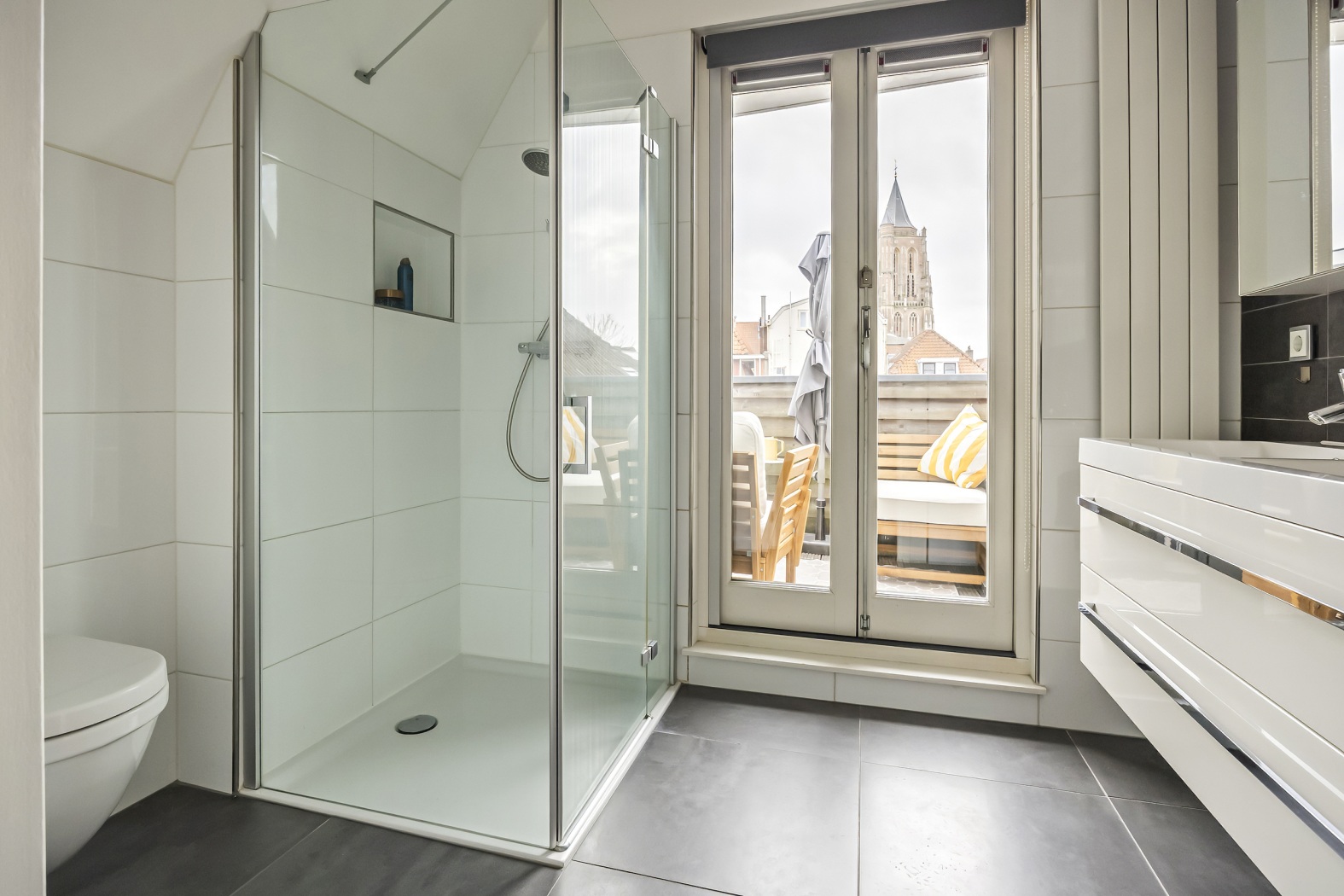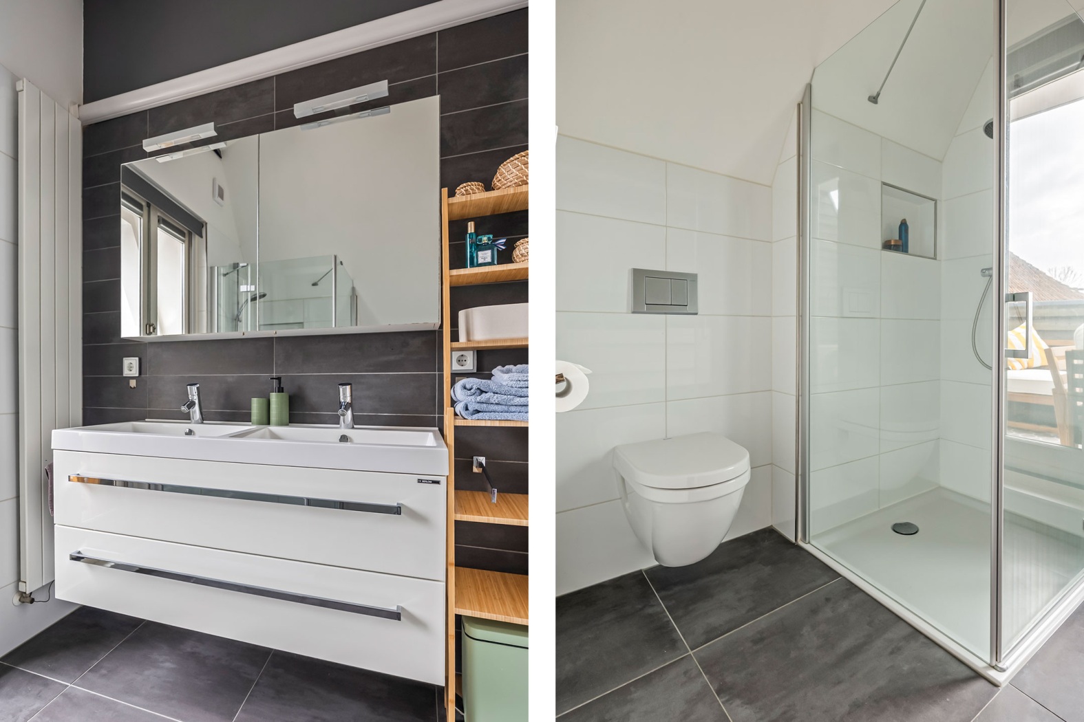 * Badkamer met douche, toilet en dubbele wastafel