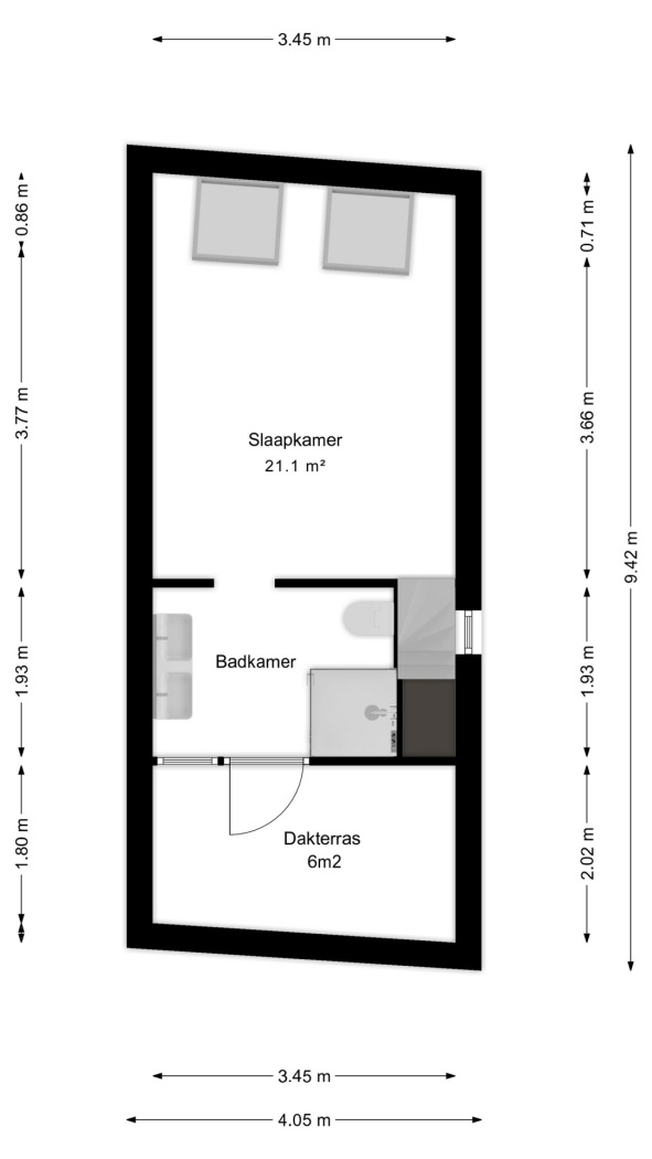 De tweede verdieping is ruim opgezet en beschikt over een grote slaapkamer waar je gemakkelijk een royaal bed en ruime kastenwand kwijt kan. Je hebt vanaf de slaapkamer direct toegang tot de netjes afgewerkte badkamer, voorzien van een hangend toilet, dubbele wastafel en een ruime douchecabine. De perfecte ruimte voor ontspanning en ultiem wooncomfort. Aansluitend aan deze verdieping bevindt zich een dakterras: een fijne buitenruimte met een ligging op het zuiden waar je in alle rust kunt genieten van de zon en de stad.